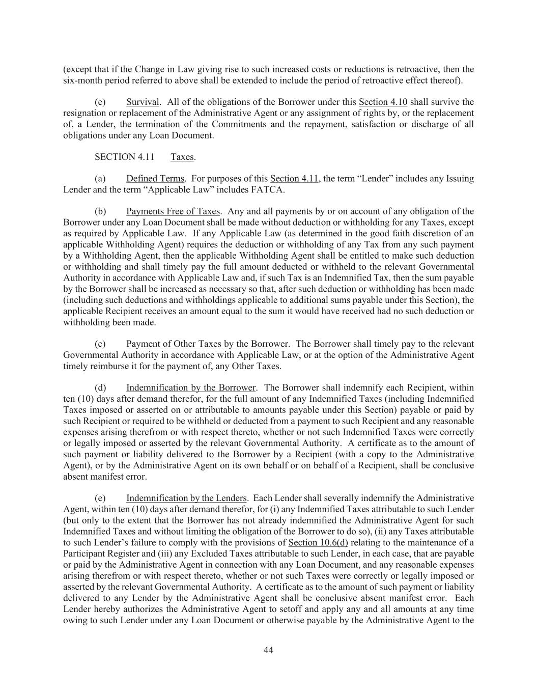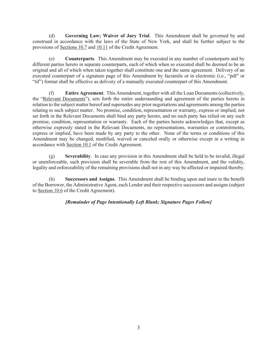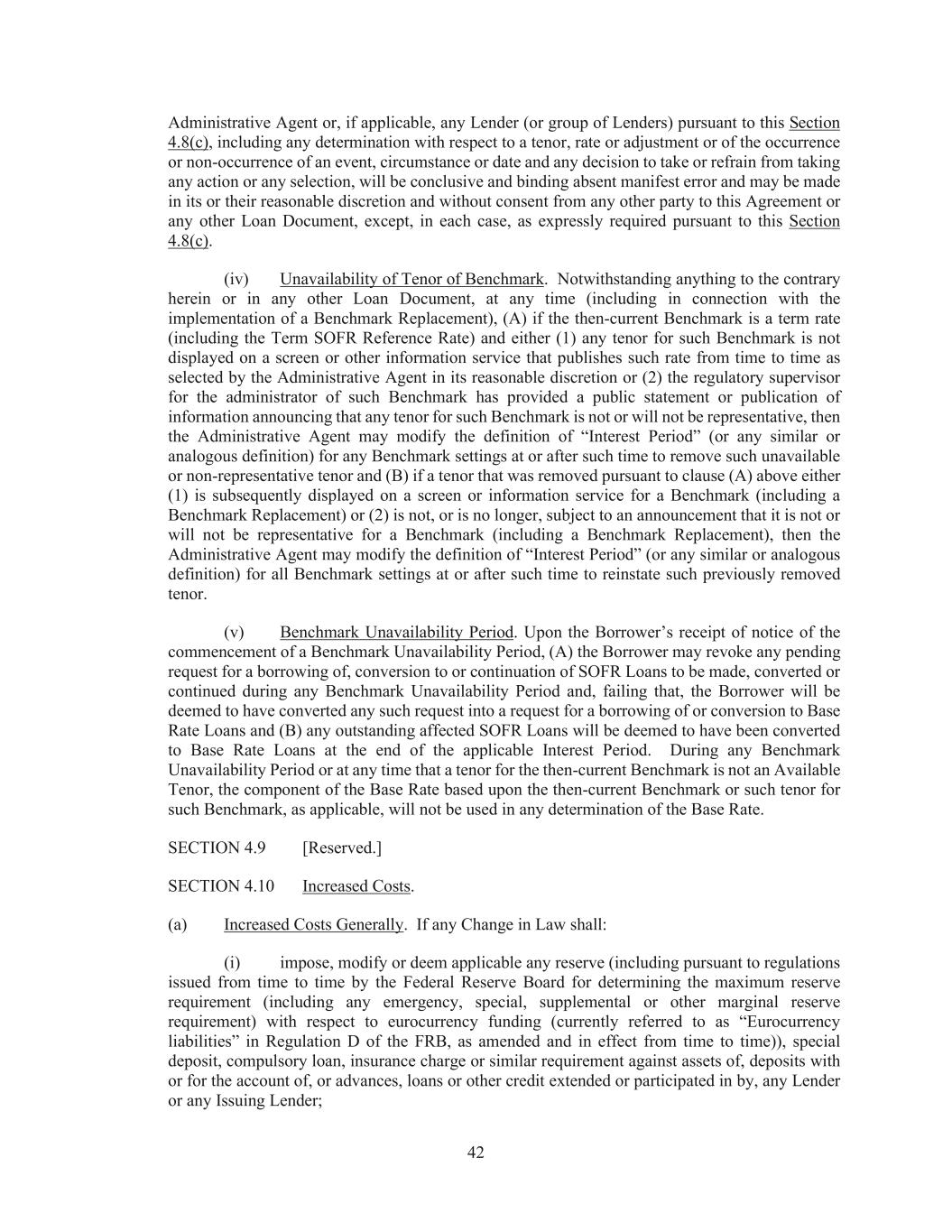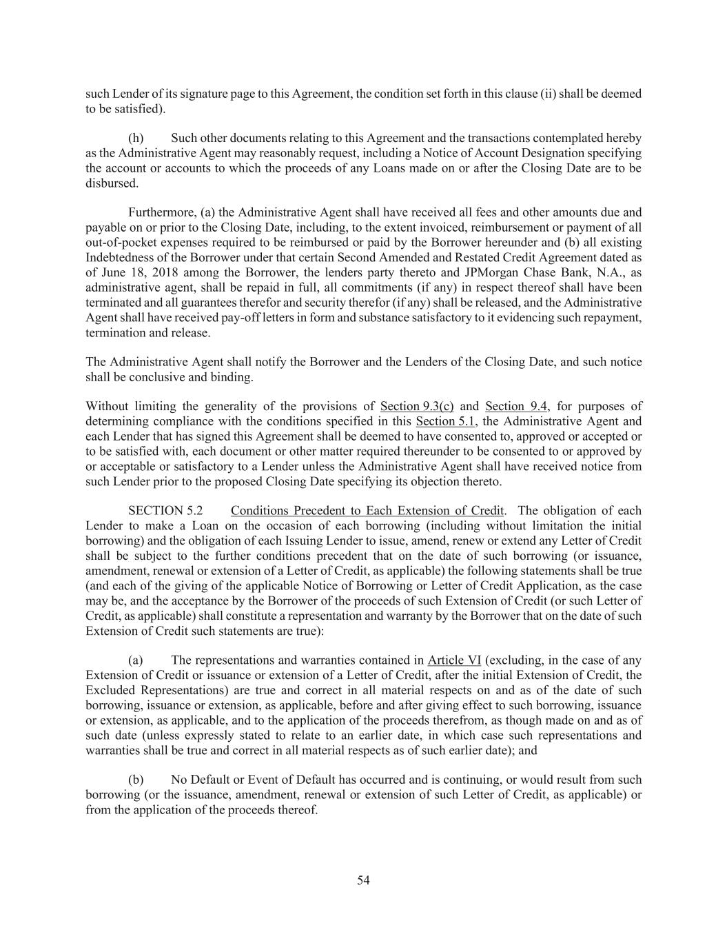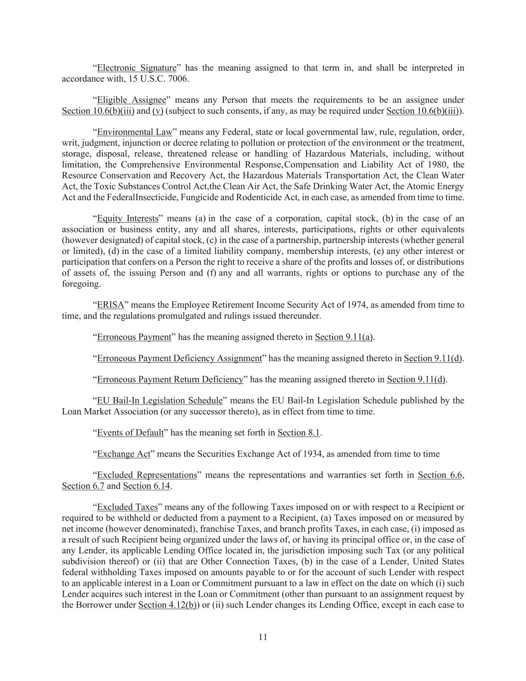 74 Deficiency”), then at the sole discretion of the Administrative Agent and upon the Administrative Agent’s written notice to such Lender (i) such Lender shall be deemed to have made a cashless assignment of the full face amount of the portion of its Loans (but not its Commitments) to the Administrative Agent or, at the option of the Administrative Agent, the Administrative Agent’s applicable lending affiliate in an amount that is equal to the Erroneous Payment Return Deficiency (or such lesser amount as the Administrative Agent may specify) (such assignment of the Loans (but not Commitments), the “Erroneous Payment Deficiency Assignment”) plus any accrued and unpaid interest on such assigned amount, without further consent or approval of any party hereto and without any payment by the Administrative Agent or its applicable lending affiliate as the assignee of such Erroneous Payment Deficiency Assignment. Without limitation of its rights hereunder, the Administrative Agent may cancel any Erroneous Payment Deficiency Assignment at any time by written notice to the applicable assigning Lender and upon such revocation all of the Loans assigned pursuant to such Erroneous Payment Deficiency Assignment shall be reassigned to such Lender without any requirement for payment or other consideration. The parties hereto acknowledge and agree that (1) any assignment contemplated in this clause (d) shall be made without any requirement for any payment or other consideration paid by the applicable assignee or received by the assignor, (2) the provisions of this clause (d) shall govern in the event of any conflict with the terms and conditions of Section 10.6 and (3) the Administrative Agent may reflect such assignments in the Register without further consent or action by any other Person. (e) Each party hereto hereby agrees that (x) in the event an Erroneous Payment (or portion thereof) is not recovered from any Payment Recipient that has received such Erroneous Payment (or portion thereof) for any reason, the Administrative Agent (1) shall be subrogated to all the rights of such Payment Recipient with respect to such amount and (2) is authorized to set off, net and apply any and all amounts at any time owing to such Payment Recipient under any Loan Document, or otherwise payable or distributable by the Administrative Agent to such Payment Recipient from any source, against any amount due to the Administrative Agent under this Section 9.11 or under the indemnification provisions of this Agreement, (y) the receipt of an Erroneous Payment by a Payment Recipient shall not for the purpose of this Agreement be treated as a payment, prepayment, repayment, discharge or other satisfaction of any Obligations owed by the Borrower, except, in each case, to the extent such Erroneous Payment is, and solely with respect to the amount of such Erroneous Payment that is, comprised of funds received by the Administrative Agent from the Borrower for the purpose of making a payment on the Obligations and (z) to the extent that an Erroneous Payment was in any way or at any time credited as payment or satisfaction of any of the Obligations, the Obligations or any part thereof that were so credited, and all rights of the Payment Recipient, as the case may be, shall be reinstated and continue in full force and effect as if such payment or satisfaction had never been received. (f) Each party’s obligations under this Section 9.11 shall survive the resignation or replacement of the Administrative Agent or any transfer of right or obligations by, or the replacement of, a Lender, the termination of the Commitments or the repayment, satisfaction or discharge of all Obligations (or any portion thereof) under any Loan Document. (g) Nothing in this Section 9.11 will constitute a waiver or release of any claim of any party hereunder arising from any Payment Recipient’s receipt of an Erroneous Payment. ARTICLE X MISCELLANEOUS SECTION 10.1 Amendments, Etc. Except as set forth below or as specifically provided in any Loan Document (including Section 4.8(c)), any term, covenant, agreement or condition of this Agreement or any of the other Loan Documents may be amended or waived by the Lenders, and any consent given by