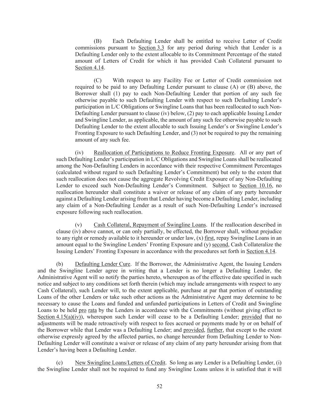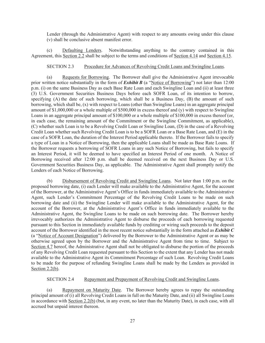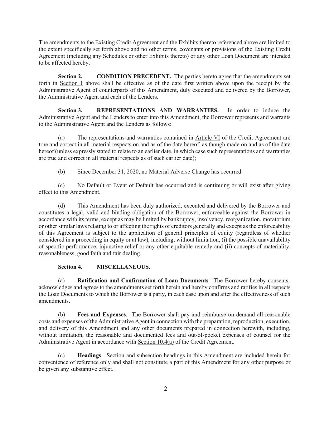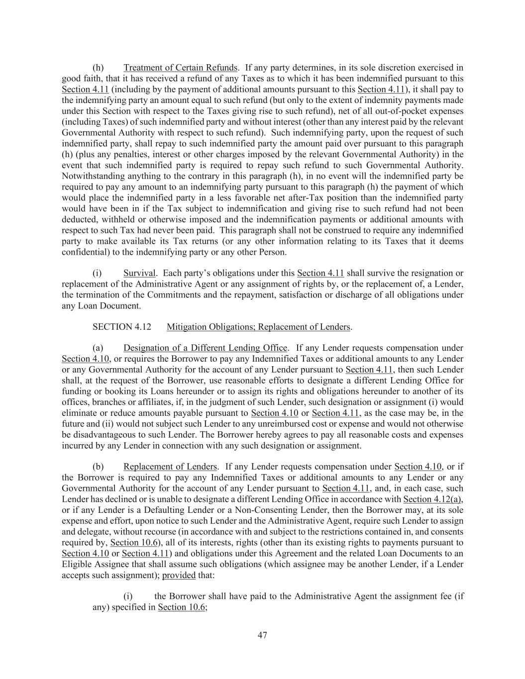 74 Deficiency”), then at the sole discretion of the Administrative Agent and upon the Administrative Agent’s written notice to such Lender (i) such Lender shall be deemed to have made a cashless assignment of the full face amount of the portion of its Loans (but not its Commitments) to the Administrative Agent or, at the option of the Administrative Agent, the Administrative Agent’s applicable lending affiliate in an amount that is equal to the Erroneous Payment Return Deficiency (or such lesser amount as the Administrative Agent may specify) (such assignment of the Loans (but not Commitments), the “Erroneous Payment Deficiency Assignment”) plus any accrued and unpaid interest on such assigned amount, without further consent or approval of any party hereto and without any payment by the Administrative Agent or its applicable lending affiliate as the assignee of such Erroneous Payment Deficiency Assignment. Without limitation of its rights hereunder, the Administrative Agent may cancel any Erroneous Payment Deficiency Assignment at any time by written notice to the applicable assigning Lender and upon such revocation all of the Loans assigned pursuant to such Erroneous Payment Deficiency Assignment shall be reassigned to such Lender without any requirement for payment or other consideration. The parties hereto acknowledge and agree that (1) any assignment contemplated in this clause (d) shall be made without any requirement for any payment or other consideration paid by the applicable assignee or received by the assignor, (2) the provisions of this clause (d) shall govern in the event of any conflict with the terms and conditions of Section 10.6 and (3) the Administrative Agent may reflect such assignments in the Register without further consent or action by any other Person. (e) Each party hereto hereby agrees that (x) in the event an Erroneous Payment (or portion thereof) is not recovered from any Payment Recipient that has received such Erroneous Payment (or portion thereof) for any reason, the Administrative Agent (1) shall be subrogated to all the rights of such Payment Recipient with respect to such amount and (2) is authorized to set off, net and apply any and all amounts at any time owing to such Payment Recipient under any Loan Document, or otherwise payable or distributable by the Administrative Agent to such Payment Recipient from any source, against any amount due to the Administrative Agent under this Section 9.11 or under the indemnification provisions of this Agreement, (y) the receipt of an Erroneous Payment by a Payment Recipient shall not for the purpose of this Agreement be treated as a payment, prepayment, repayment, discharge or other satisfaction of any Obligations owed by the Borrower, except, in each case, to the extent such Erroneous Payment is, and solely with respect to the amount of such Erroneous Payment that is, comprised of funds received by the Administrative Agent from the Borrower for the purpose of making a payment on the Obligations and (z) to the extent that an Erroneous Payment was in any way or at any time credited as payment or satisfaction of any of the Obligations, the Obligations or any part thereof that were so credited, and all rights of the Payment Recipient, as the case may be, shall be reinstated and continue in full force and effect as if such payment or satisfaction had never been received. (f) Each party’s obligations under this Section 9.11 shall survive the resignation or replacement of the Administrative Agent or any transfer of right or obligations by, or the replacement of, a Lender, the termination of the Commitments or the repayment, satisfaction or discharge of all Obligations (or any portion thereof) under any Loan Document. (g) Nothing in this Section 9.11 will constitute a waiver or release of any claim of any party hereunder arising from any Payment Recipient’s receipt of an Erroneous Payment. ARTICLE X MISCELLANEOUS SECTION 10.1 Amendments, Etc. Except as set forth below or as specifically provided in any Loan Document (including Section 4.8(c)), any term, covenant, agreement or condition of this Agreement or any of the other Loan Documents may be amended or waived by the Lenders, and any consent given by