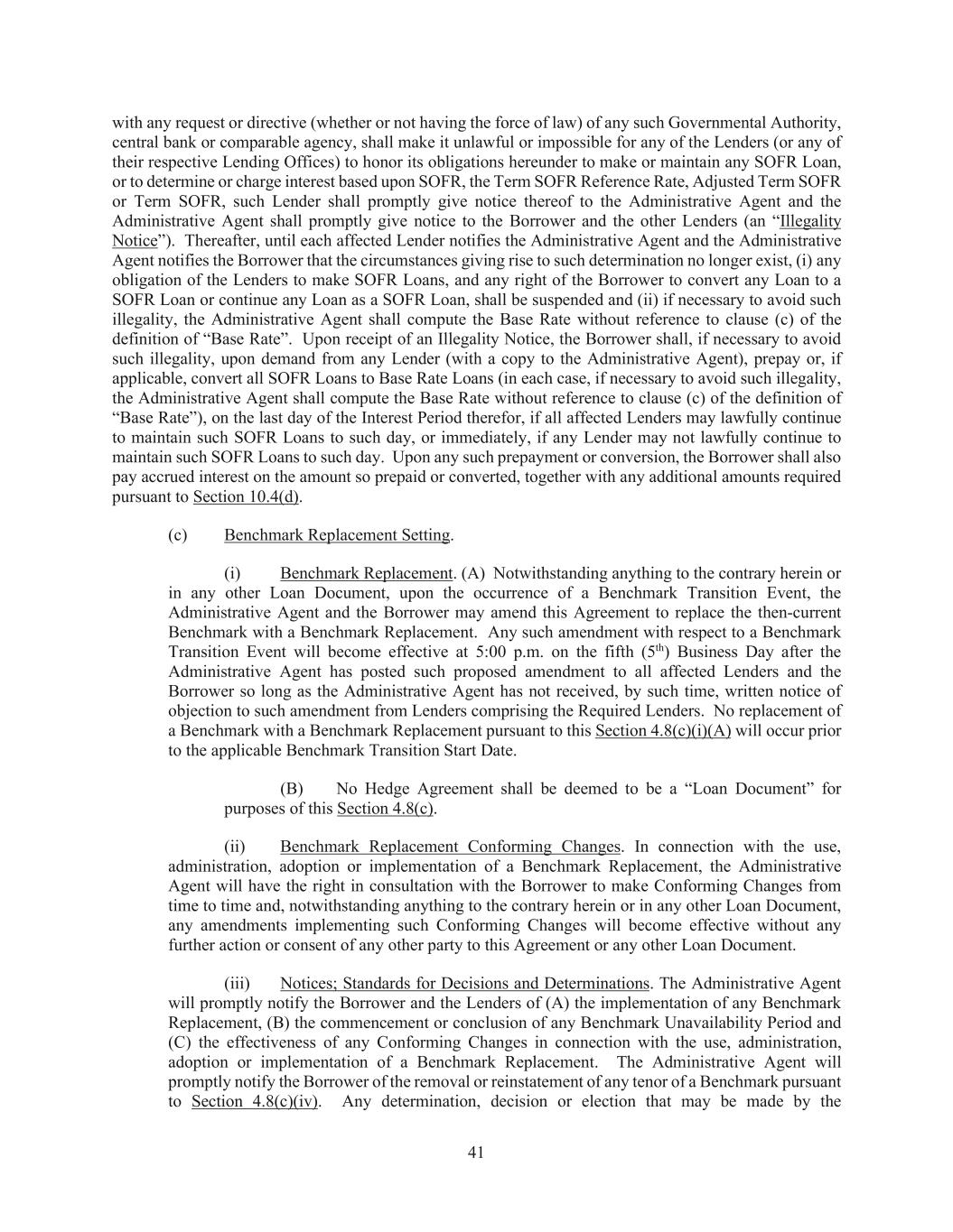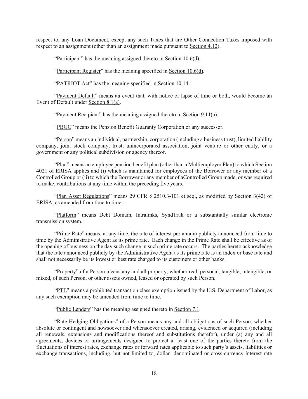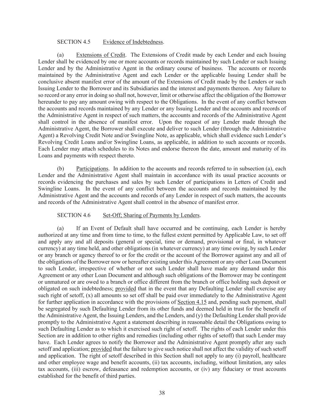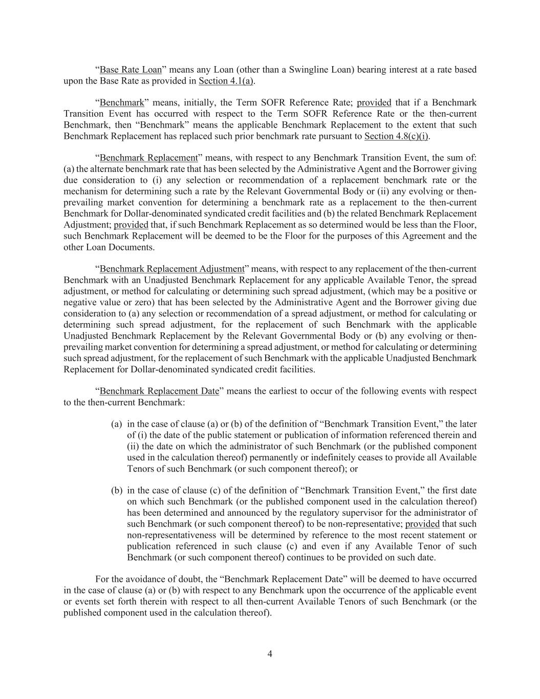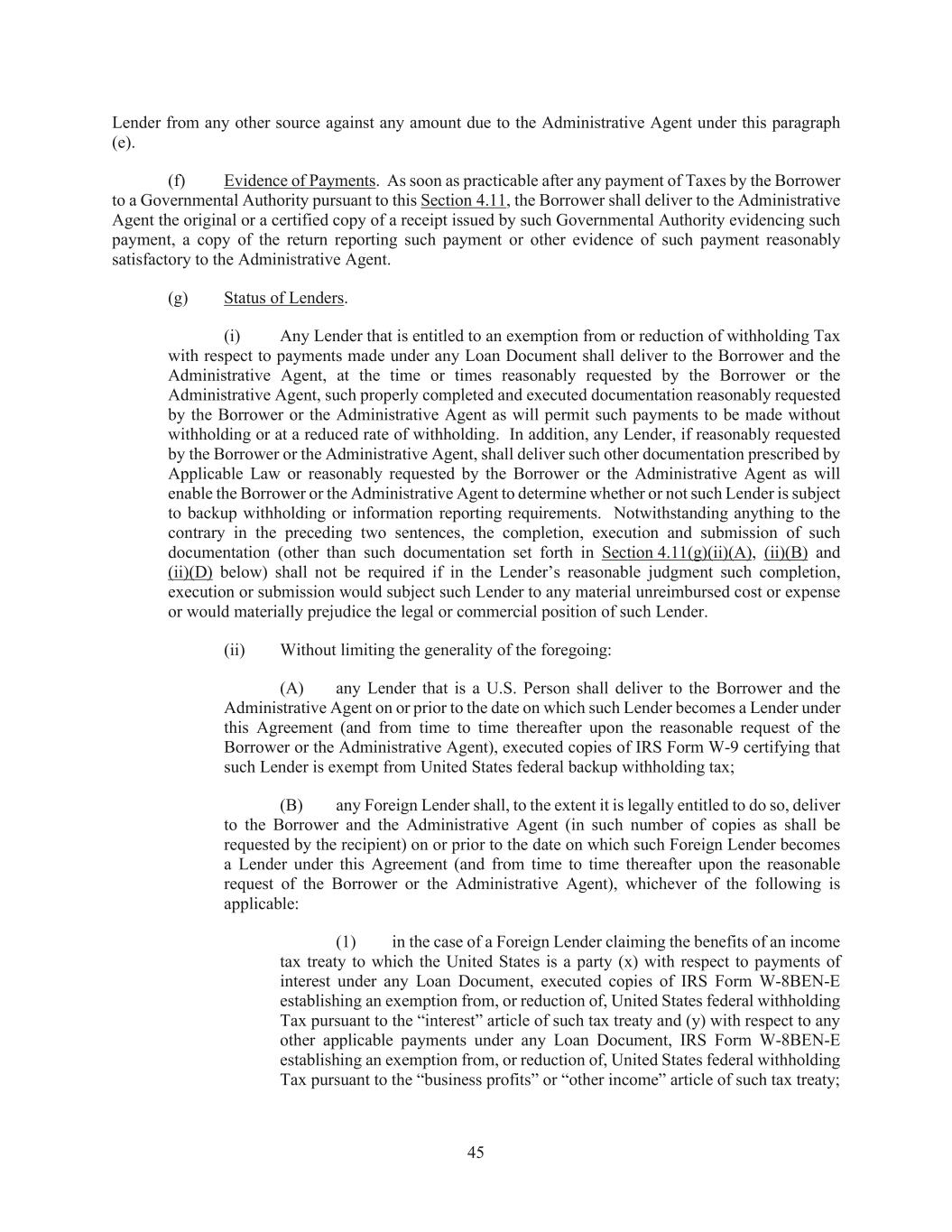 74 Deficiency”), then at the sole discretion of the Administrative Agent and upon the Administrative Agent’s written notice to such Lender (i) such Lender shall be deemed to have made a cashless assignment of the full face amount of the portion of its Loans (but not its Commitments) to the Administrative Agent or, at the option of the Administrative Agent, the Administrative Agent’s applicable lending affiliate in an amount that is equal to the Erroneous Payment Return Deficiency (or such lesser amount as the Administrative Agent may specify) (such assignment of the Loans (but not Commitments), the “Erroneous Payment Deficiency Assignment”) plus any accrued and unpaid interest on such assigned amount, without further consent or approval of any party hereto and without any payment by the Administrative Agent or its applicable lending affiliate as the assignee of such Erroneous Payment Deficiency Assignment. Without limitation of its rights hereunder, the Administrative Agent may cancel any Erroneous Payment Deficiency Assignment at any time by written notice to the applicable assigning Lender and upon such revocation all of the Loans assigned pursuant to such Erroneous Payment Deficiency Assignment shall be reassigned to such Lender without any requirement for payment or other consideration. The parties hereto acknowledge and agree that (1) any assignment contemplated in this clause (d) shall be made without any requirement for any payment or other consideration paid by the applicable assignee or received by the assignor, (2) the provisions of this clause (d) shall govern in the event of any conflict with the terms and conditions of Section 10.6 and (3) the Administrative Agent may reflect such assignments in the Register without further consent or action by any other Person. (e) Each party hereto hereby agrees that (x) in the event an Erroneous Payment (or portion thereof) is not recovered from any Payment Recipient that has received such Erroneous Payment (or portion thereof) for any reason, the Administrative Agent (1) shall be subrogated to all the rights of such Payment Recipient with respect to such amount and (2) is authorized to set off, net and apply any and all amounts at any time owing to such Payment Recipient under any Loan Document, or otherwise payable or distributable by the Administrative Agent to such Payment Recipient from any source, against any amount due to the Administrative Agent under this Section 9.11 or under the indemnification provisions of this Agreement, (y) the receipt of an Erroneous Payment by a Payment Recipient shall not for the purpose of this Agreement be treated as a payment, prepayment, repayment, discharge or other satisfaction of any Obligations owed by the Borrower, except, in each case, to the extent such Erroneous Payment is, and solely with respect to the amount of such Erroneous Payment that is, comprised of funds received by the Administrative Agent from the Borrower for the purpose of making a payment on the Obligations and (z) to the extent that an Erroneous Payment was in any way or at any time credited as payment or satisfaction of any of the Obligations, the Obligations or any part thereof that were so credited, and all rights of the Payment Recipient, as the case may be, shall be reinstated and continue in full force and effect as if such payment or satisfaction had never been received. (f) Each party’s obligations under this Section 9.11 shall survive the resignation or replacement of the Administrative Agent or any transfer of right or obligations by, or the replacement of, a Lender, the termination of the Commitments or the repayment, satisfaction or discharge of all Obligations (or any portion thereof) under any Loan Document. (g) Nothing in this Section 9.11 will constitute a waiver or release of any claim of any party hereunder arising from any Payment Recipient’s receipt of an Erroneous Payment. ARTICLE X MISCELLANEOUS SECTION 10.1 Amendments, Etc. Except as set forth below or as specifically provided in any Loan Document (including Section 4.8(c)), any term, covenant, agreement or condition of this Agreement or any of the other Loan Documents may be amended or waived by the Lenders, and any consent given by