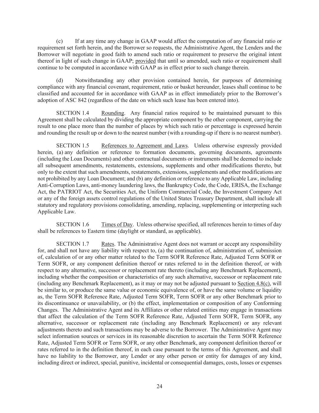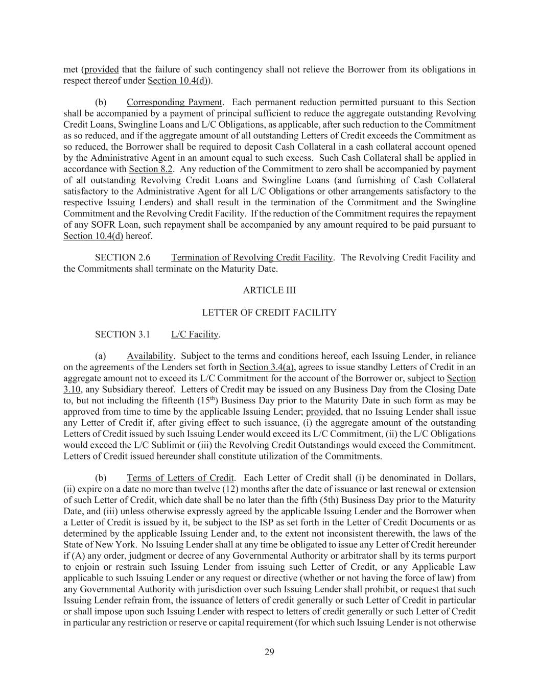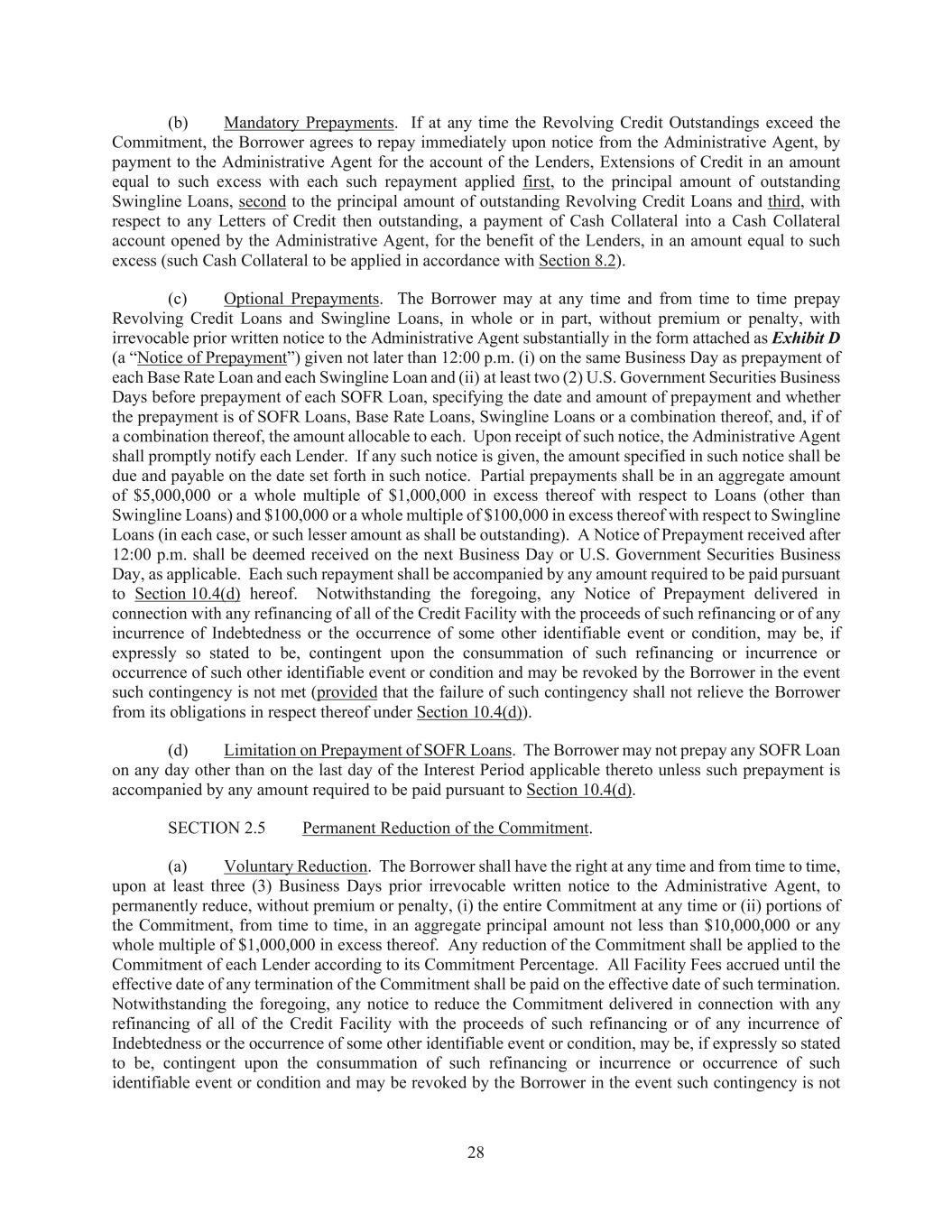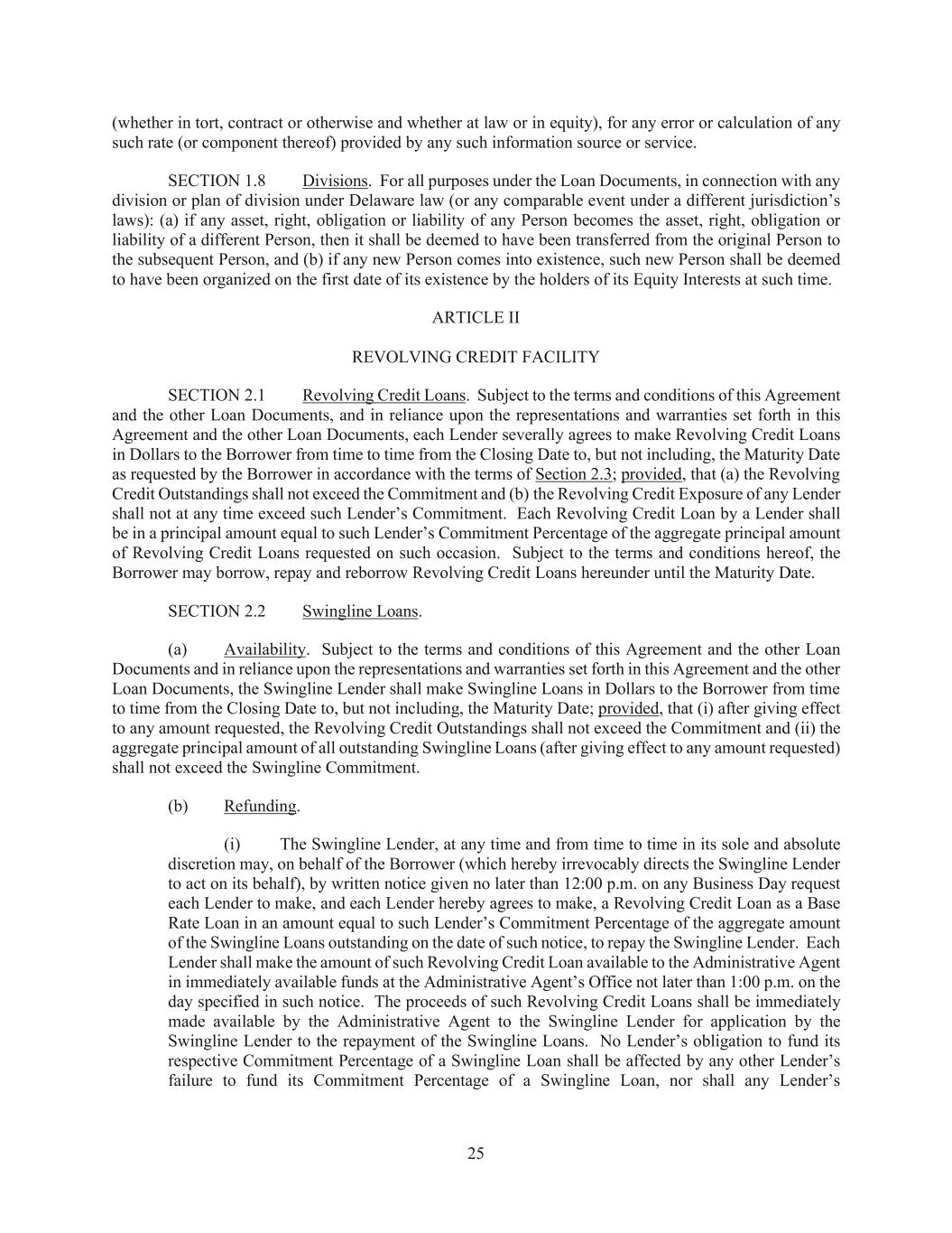 74 Deficiency”), then at the sole discretion of the Administrative Agent and upon the Administrative Agent’s written notice to such Lender (i) such Lender shall be deemed to have made a cashless assignment of the full face amount of the portion of its Loans (but not its Commitments) to the Administrative Agent or, at the option of the Administrative Agent, the Administrative Agent’s applicable lending affiliate in an amount that is equal to the Erroneous Payment Return Deficiency (or such lesser amount as the Administrative Agent may specify) (such assignment of the Loans (but not Commitments), the “Erroneous Payment Deficiency Assignment”) plus any accrued and unpaid interest on such assigned amount, without further consent or approval of any party hereto and without any payment by the Administrative Agent or its applicable lending affiliate as the assignee of such Erroneous Payment Deficiency Assignment. Without limitation of its rights hereunder, the Administrative Agent may cancel any Erroneous Payment Deficiency Assignment at any time by written notice to the applicable assigning Lender and upon such revocation all of the Loans assigned pursuant to such Erroneous Payment Deficiency Assignment shall be reassigned to such Lender without any requirement for payment or other consideration. The parties hereto acknowledge and agree that (1) any assignment contemplated in this clause (d) shall be made without any requirement for any payment or other consideration paid by the applicable assignee or received by the assignor, (2) the provisions of this clause (d) shall govern in the event of any conflict with the terms and conditions of Section 10.6 and (3) the Administrative Agent may reflect such assignments in the Register without further consent or action by any other Person. (e) Each party hereto hereby agrees that (x) in the event an Erroneous Payment (or portion thereof) is not recovered from any Payment Recipient that has received such Erroneous Payment (or portion thereof) for any reason, the Administrative Agent (1) shall be subrogated to all the rights of such Payment Recipient with respect to such amount and (2) is authorized to set off, net and apply any and all amounts at any time owing to such Payment Recipient under any Loan Document, or otherwise payable or distributable by the Administrative Agent to such Payment Recipient from any source, against any amount due to the Administrative Agent under this Section 9.11 or under the indemnification provisions of this Agreement, (y) the receipt of an Erroneous Payment by a Payment Recipient shall not for the purpose of this Agreement be treated as a payment, prepayment, repayment, discharge or other satisfaction of any Obligations owed by the Borrower, except, in each case, to the extent such Erroneous Payment is, and solely with respect to the amount of such Erroneous Payment that is, comprised of funds received by the Administrative Agent from the Borrower for the purpose of making a payment on the Obligations and (z) to the extent that an Erroneous Payment was in any way or at any time credited as payment or satisfaction of any of the Obligations, the Obligations or any part thereof that were so credited, and all rights of the Payment Recipient, as the case may be, shall be reinstated and continue in full force and effect as if such payment or satisfaction had never been received. (f) Each party’s obligations under this Section 9.11 shall survive the resignation or replacement of the Administrative Agent or any transfer of right or obligations by, or the replacement of, a Lender, the termination of the Commitments or the repayment, satisfaction or discharge of all Obligations (or any portion thereof) under any Loan Document. (g) Nothing in this Section 9.11 will constitute a waiver or release of any claim of any party hereunder arising from any Payment Recipient’s receipt of an Erroneous Payment. ARTICLE X MISCELLANEOUS SECTION 10.1 Amendments, Etc. Except as set forth below or as specifically provided in any Loan Document (including Section 4.8(c)), any term, covenant, agreement or condition of this Agreement or any of the other Loan Documents may be amended or waived by the Lenders, and any consent given by