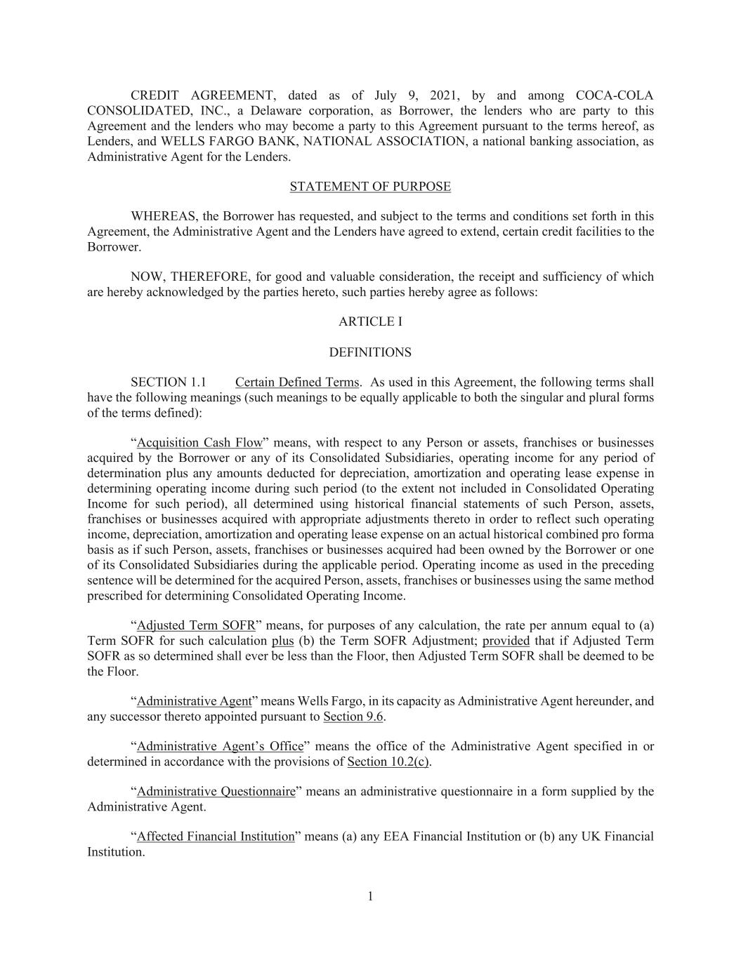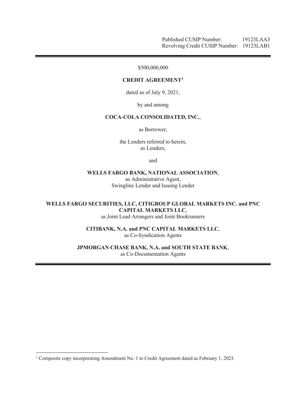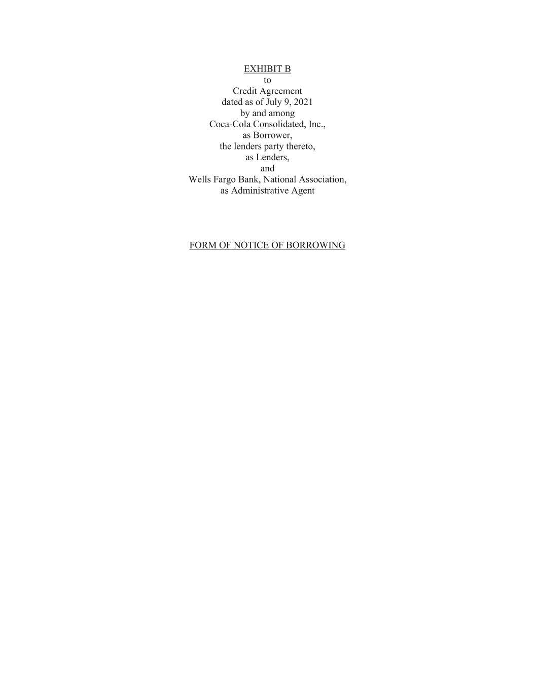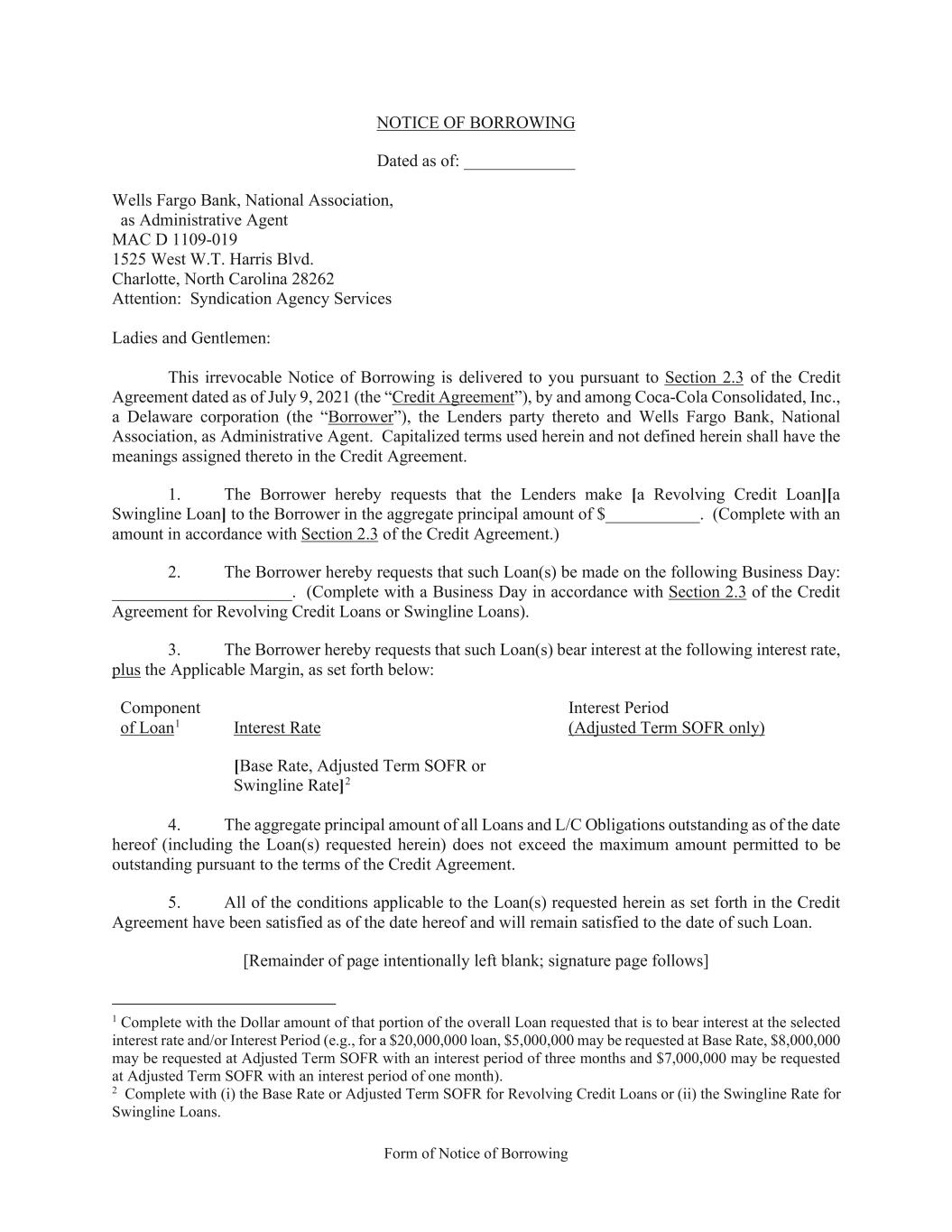 Form of Notice of Borrowing NOTICE OF BORROWING Dated as of: _____________ Wells Fargo Bank, National Association, as Administrative Agent MAC D 1109-019 1525 West W.T. Harris Blvd. Charlotte, North Carolina 28262 Attention: Syndication Agency Services Ladies and Gentlemen: This irrevocable Notice of Borrowing is delivered to you pursuant to Section 2.3 of the Credit Agreement dated as of July 9, 2021 (the “Credit Agreement”), by and among Coca-Cola Consolidated, Inc., a Delaware corporation (the “Borrower”), the Lenders party thereto and Wells Fargo Bank, National Association, as Administrative Agent. Capitalized terms used herein and not defined herein shall have the meanings assigned thereto in the Credit Agreement. 1. The Borrower hereby requests that the Lenders make [a Revolving Credit Loan][a Swingline Loan] to the Borrower in the aggregate principal amount of $___________. (Complete with an amount in accordance with Section 2.3 of the Credit Agreement.) 2. The Borrower hereby requests that such Loan(s) be made on the following Business Day: _____________________. (Complete with a Business Day in accordance with Section 2.3 of the Credit Agreement for Revolving Credit Loans or Swingline Loans). 3. The Borrower hereby requests that such Loan(s) bear interest at the following interest rate, plus the Applicable Margin, as set forth below: Component of Loan1 Interest Rate Interest Period (Adjusted Term SOFR only) [Base Rate, Adjusted Term SOFR or Swingline Rate]2 4. The aggregate principal amount of all Loans and L/C Obligations outstanding as of the date hereof (including the Loan(s) requested herein) does not exceed the maximum amount permitted to be outstanding pursuant to the terms of the Credit Agreement. 5. All of the conditions applicable to the Loan(s) requested herein as set forth in the Credit Agreement have been satisfied as of the date hereof and will remain satisfied to the date of such Loan. [Remainder of page intentionally left blank; signature page follows] 1 Complete with the Dollar amount of that portion of the overall Loan requested that is to bear interest at the selected interest rate and/or Interest Period (e.g., for a $20,000,000 loan, $5,000,000 may be requested at Base Rate, $8,000,000 may be requested at Adjusted Term SOFR with an interest period of three months and $7,000,000 may be requested at Adjusted Term SOFR with an interest period of one month). 2 Complete with (i) the Base Rate or Adjusted Term SOFR for Revolving Credit Loans or (ii) the Swingline Rate for Swingline Loans.