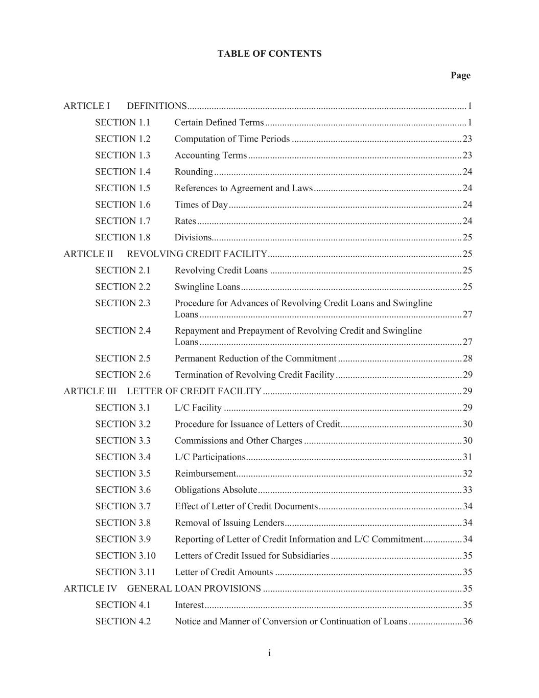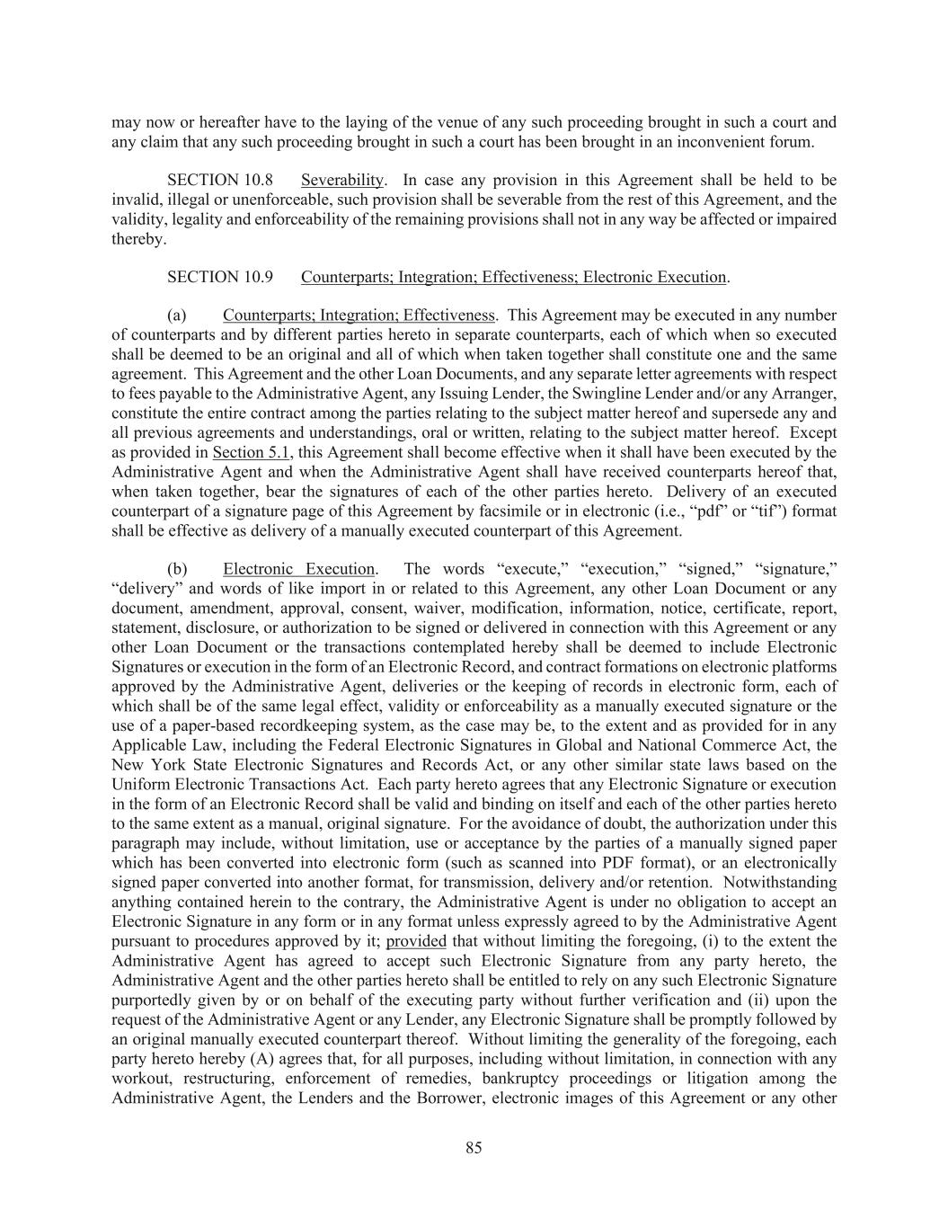 85 may now or hereafter have to the laying of the venue of any such proceeding brought in such a court and any claim that any such proceeding brought in such a court has been brought in an inconvenient forum. SECTION 10.8 Severability. In case any provision in this Agreement shall be held to be invalid, illegal or unenforceable, such provision shall be severable from the rest of this Agreement, and the validity, legality and enforceability of the remaining provisions shall not in any way be affected or impaired thereby. SECTION 10.9 Counterparts; Integration; Effectiveness; Electronic Execution. (a) Counterparts; Integration; Effectiveness. This Agreement may be executed in any number of counterparts and by different parties hereto in separate counterparts, each of which when so executed shall be deemed to be an original and all of which when taken together shall constitute one and the same agreement. This Agreement and the other Loan Documents, and any separate letter agreements with respect to fees payable to the Administrative Agent, any Issuing Lender, the Swingline Lender and/or any Arranger, constitute the entire contract among the parties relating to the subject matter hereof and supersede any and all previous agreements and understandings, oral or written, relating to the subject matter hereof. Except as provided in Section 5.1, this Agreement shall become effective when it shall have been executed by the Administrative Agent and when the Administrative Agent shall have received counterparts hereof that, when taken together, bear the signatures of each of the other parties hereto. Delivery of an executed counterpart of a signature page of this Agreement by facsimile or in electronic (i.e., “pdf” or “tif”) format shall be effective as delivery of a manually executed counterpart of this Agreement. (b) Electronic Execution. The words “execute,” “execution,” “signed,” “signature,” “delivery” and words of like import in or related to this Agreement, any other Loan Document or any document, amendment, approval, consent, waiver, modification, information, notice, certificate, report, statement, disclosure, or authorization to be signed or delivered in connection with this Agreement or any other Loan Document or the transactions contemplated hereby shall be deemed to include Electronic Signatures or execution in the form of an Electronic Record, and contract formations on electronic platforms approved by the Administrative Agent, deliveries or the keeping of records in electronic form, each of which shall be of the same legal effect, validity or enforceability as a manually executed signature or the use of a paper-based recordkeeping system, as the case may be, to the extent and as provided for in any Applicable Law, including the Federal Electronic Signatures in Global and National Commerce Act, the New York State Electronic Signatures and Records Act, or any other similar state laws based on the Uniform Electronic Transactions Act. Each party hereto agrees that any Electronic Signature or execution in the form of an Electronic Record shall be valid and binding on itself and each of the other parties hereto to the same extent as a manual, original signature. For the avoidance of doubt, the authorization under this paragraph may include, without limitation, use or acceptance by the parties of a manually signed paper which has been converted into electronic form (such as scanned into PDF format), or an electronically signed paper converted into another format, for transmission, delivery and/or retention. Notwithstanding anything contained herein to the contrary, the Administrative Agent is under no obligation to accept an Electronic Signature in any form or in any format unless expressly agreed to by the Administrative Agent pursuant to procedures approved by it; provided that without limiting the foregoing, (i) to the extent the Administrative Agent has agreed to accept such Electronic Signature from any party hereto, the Administrative Agent and the other parties hereto shall be entitled to rely on any such Electronic Signature purportedly given by or on behalf of the executing party without further verification and (ii) upon the request of the Administrative Agent or any Lender, any Electronic Signature shall be promptly followed by an original manually executed counterpart thereof. Without limiting the generality of the foregoing, each party hereto hereby (A) agrees that, for all purposes, including without limitation, in connection with any workout, restructuring, enforcement of remedies, bankruptcy proceedings or litigation among the Administrative Agent, the Lenders and the Borrower, electronic images of this Agreement or any other
