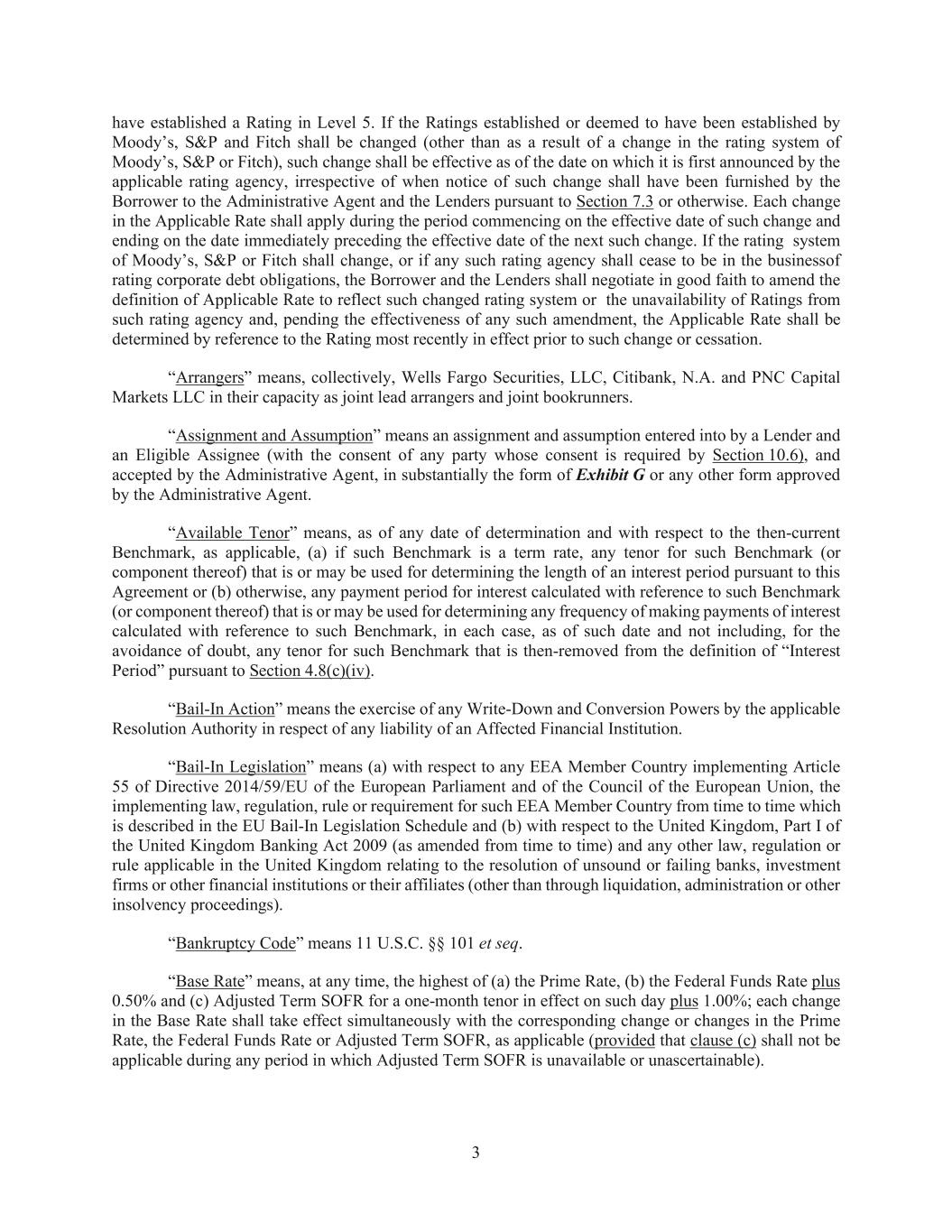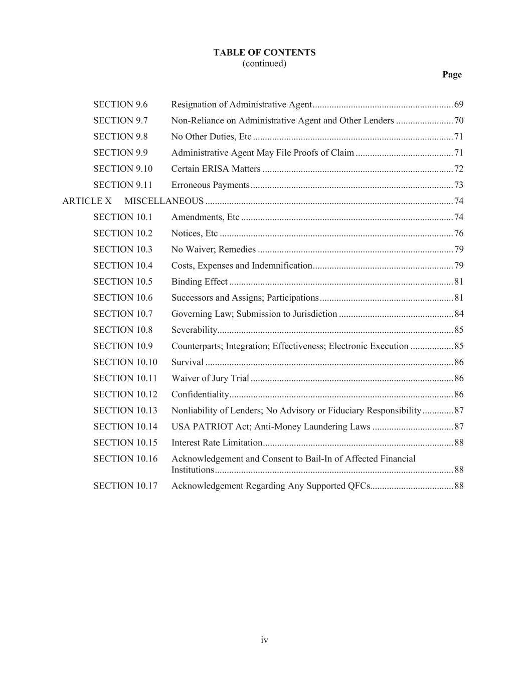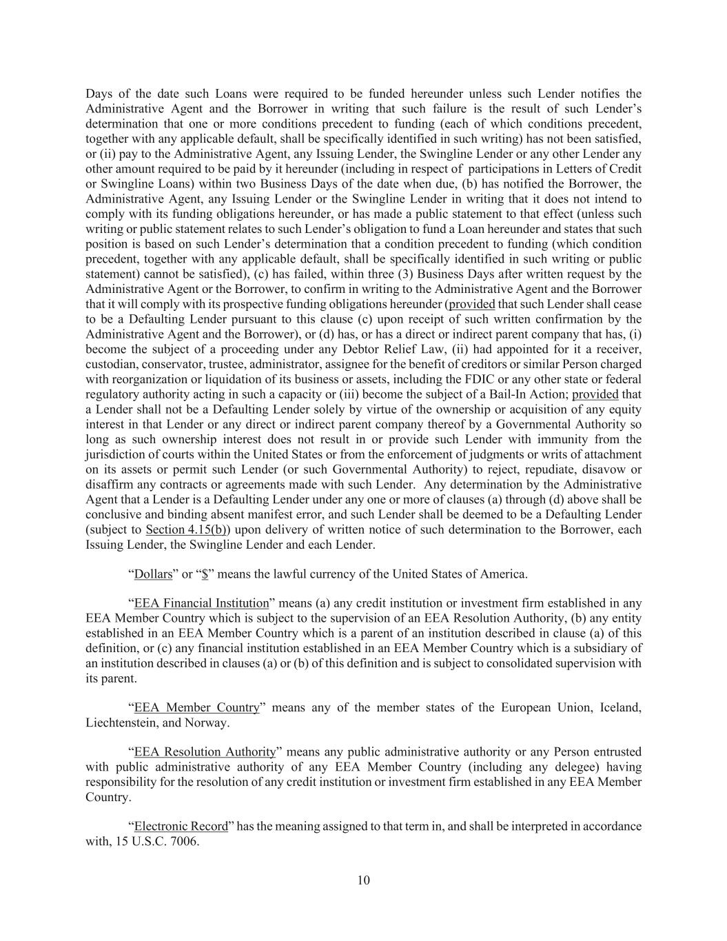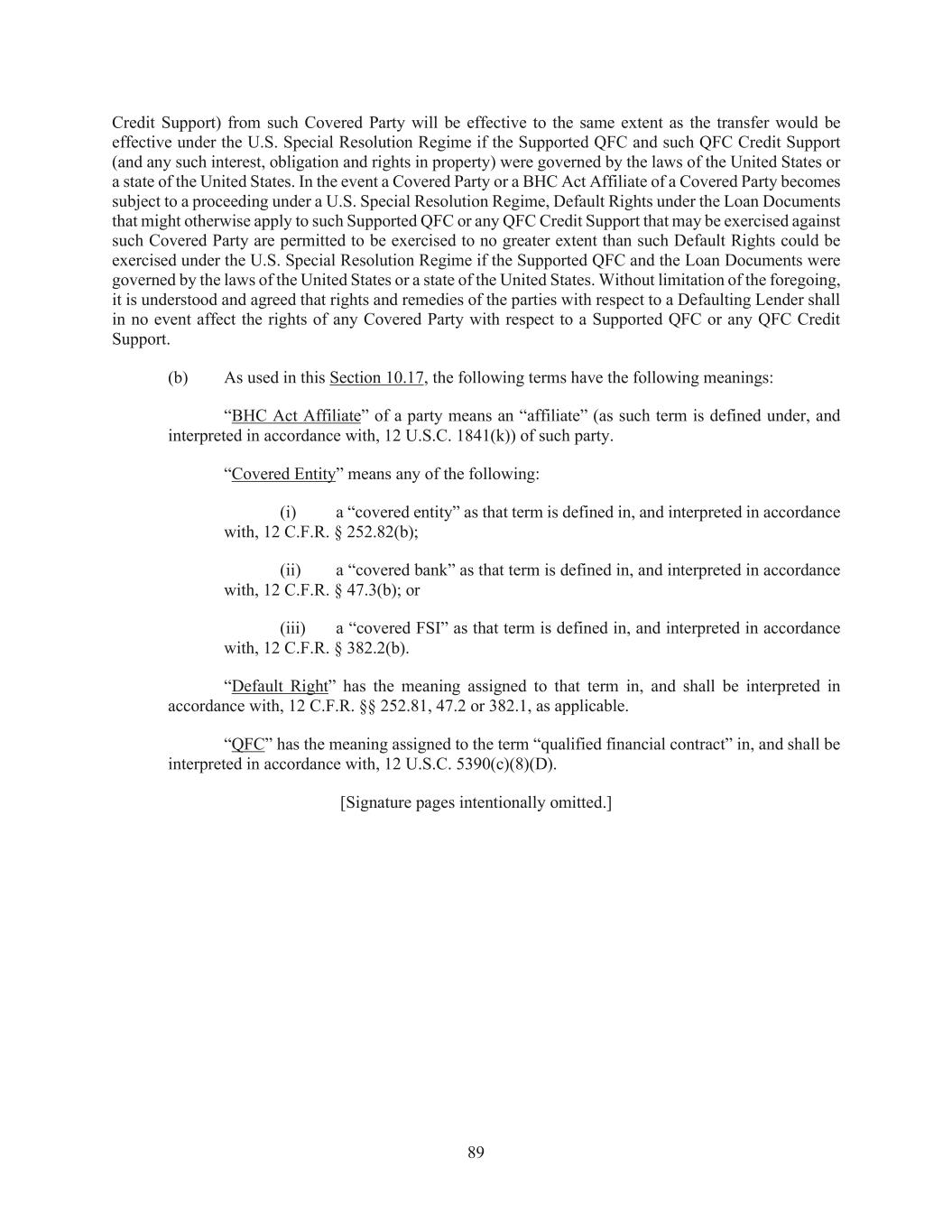 89 Credit Support) from such Covered Party will be effective to the same extent as the transfer would be effective under the U.S. Special Resolution Regime if the Supported QFC and such QFC Credit Support (and any such interest, obligation and rights in property) were governed by the laws of the United States or a state of the United States. In the event a Covered Party or a BHC Act Affiliate of a Covered Party becomes subject to a proceeding under a U.S. Special Resolution Regime, Default Rights under the Loan Documents that might otherwise apply to such Supported QFC or any QFC Credit Support that may be exercised against such Covered Party are permitted to be exercised to no greater extent than such Default Rights could be exercised under the U.S. Special Resolution Regime if the Supported QFC and the Loan Documents were governed by the laws of the United States or a state of the United States. Without limitation of the foregoing, it is understood and agreed that rights and remedies of the parties with respect to a Defaulting Lender shall in no event affect the rights of any Covered Party with respect to a Supported QFC or any QFC Credit Support. (b) As used in this Section 10.17, the following terms have the following meanings: “BHC Act Affiliate” of a party means an “affiliate” (as such term is defined under, and interpreted in accordance with, 12 U.S.C. 1841(k)) of such party. “Covered Entity” means any of the following: (i) a “covered entity” as that term is defined in, and interpreted in accordance with, 12 C.F.R. § 252.82(b); (ii) a “covered bank” as that term is defined in, and interpreted in accordance with, 12 C.F.R. § 47.3(b); or (iii) a “covered FSI” as that term is defined in, and interpreted in accordance with, 12 C.F.R. § 382.2(b). “Default Right” has the meaning assigned to that term in, and shall be interpreted in accordance with, 12 C.F.R. §§ 252.81, 47.2 or 382.1, as applicable. “QFC” has the meaning assigned to the term “qualified financial contract” in, and shall be interpreted in accordance with, 12 U.S.C. 5390(c)(8)(D). [Signature pages intentionally omitted.]