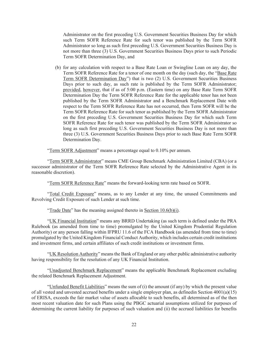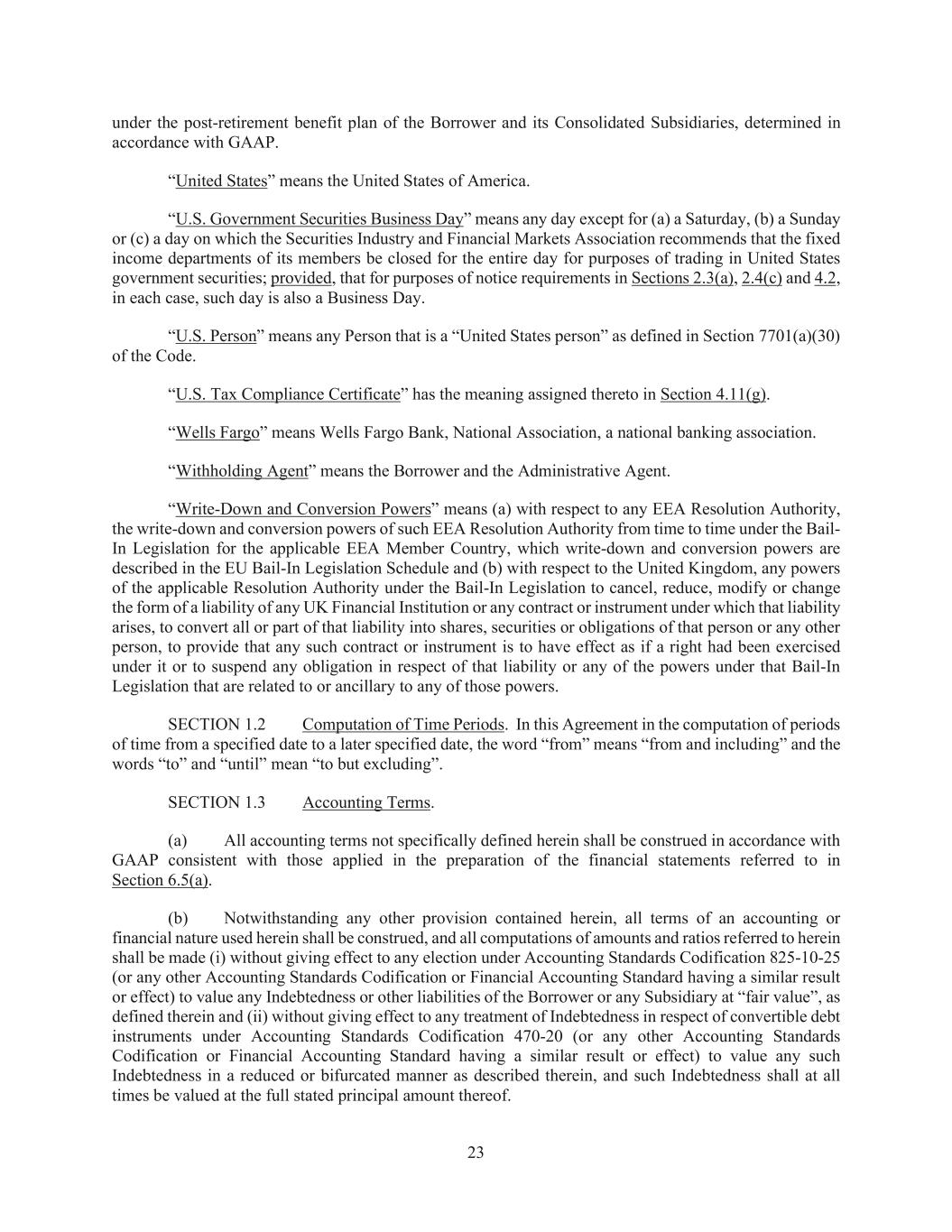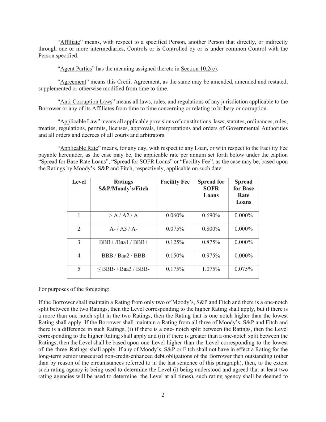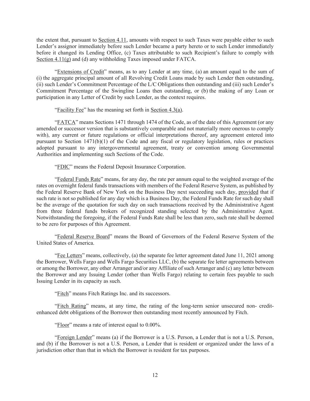 89 Credit Support) from such Covered Party will be effective to the same extent as the transfer would be effective under the U.S. Special Resolution Regime if the Supported QFC and such QFC Credit Support (and any such interest, obligation and rights in property) were governed by the laws of the United States or a state of the United States. In the event a Covered Party or a BHC Act Affiliate of a Covered Party becomes subject to a proceeding under a U.S. Special Resolution Regime, Default Rights under the Loan Documents that might otherwise apply to such Supported QFC or any QFC Credit Support that may be exercised against such Covered Party are permitted to be exercised to no greater extent than such Default Rights could be exercised under the U.S. Special Resolution Regime if the Supported QFC and the Loan Documents were governed by the laws of the United States or a state of the United States. Without limitation of the foregoing, it is understood and agreed that rights and remedies of the parties with respect to a Defaulting Lender shall in no event affect the rights of any Covered Party with respect to a Supported QFC or any QFC Credit Support. (b) As used in this Section 10.17, the following terms have the following meanings: “BHC Act Affiliate” of a party means an “affiliate” (as such term is defined under, and interpreted in accordance with, 12 U.S.C. 1841(k)) of such party. “Covered Entity” means any of the following: (i) a “covered entity” as that term is defined in, and interpreted in accordance with, 12 C.F.R. § 252.82(b); (ii) a “covered bank” as that term is defined in, and interpreted in accordance with, 12 C.F.R. § 47.3(b); or (iii) a “covered FSI” as that term is defined in, and interpreted in accordance with, 12 C.F.R. § 382.2(b). “Default Right” has the meaning assigned to that term in, and shall be interpreted in accordance with, 12 C.F.R. §§ 252.81, 47.2 or 382.1, as applicable. “QFC” has the meaning assigned to the term “qualified financial contract” in, and shall be interpreted in accordance with, 12 U.S.C. 5390(c)(8)(D). [Signature pages intentionally omitted.]