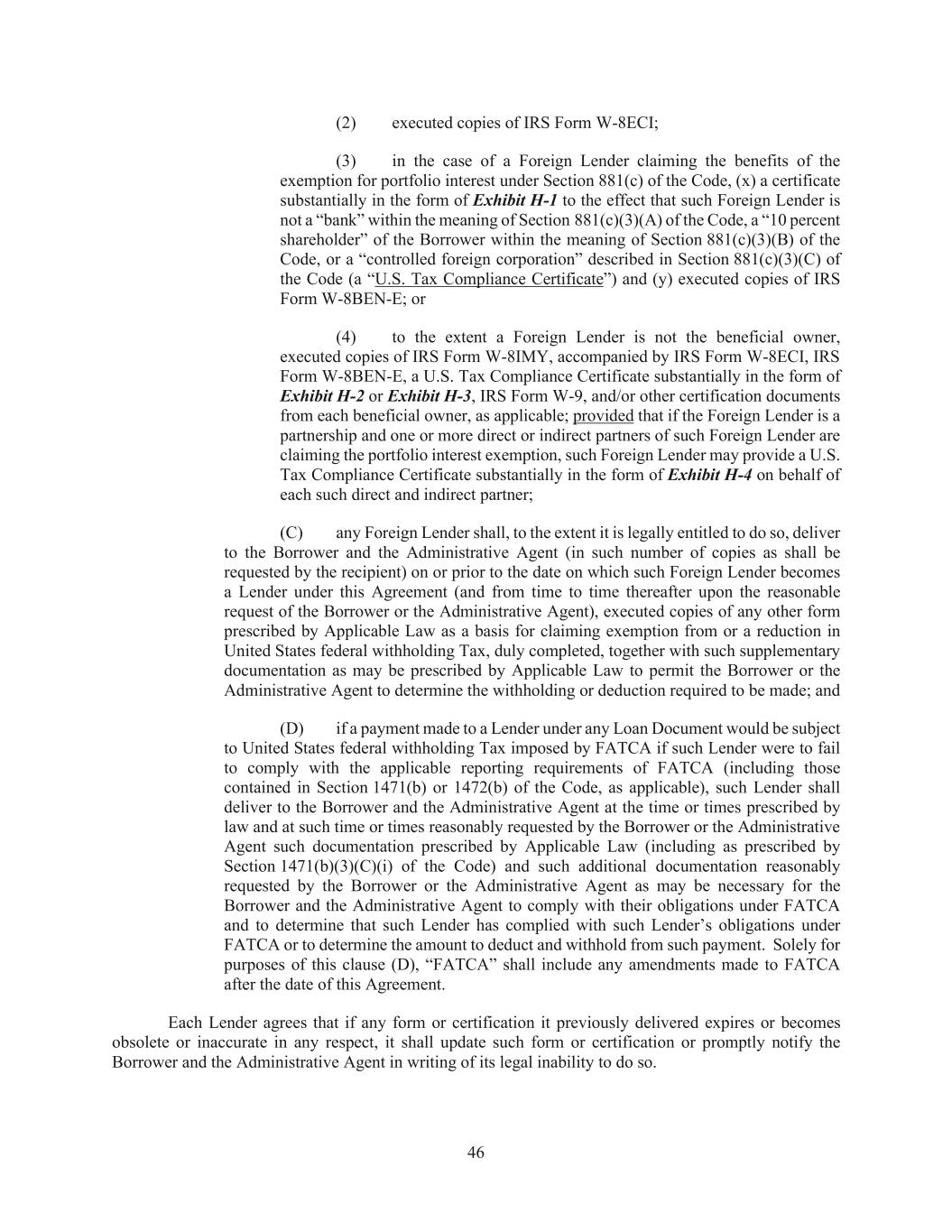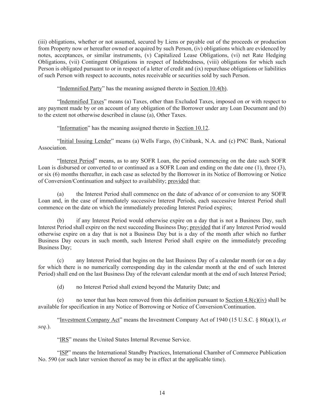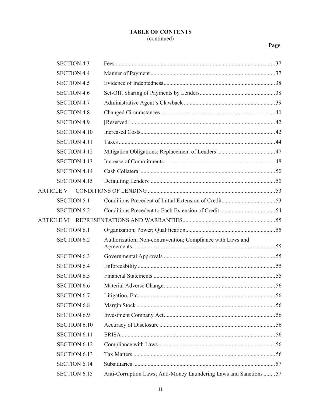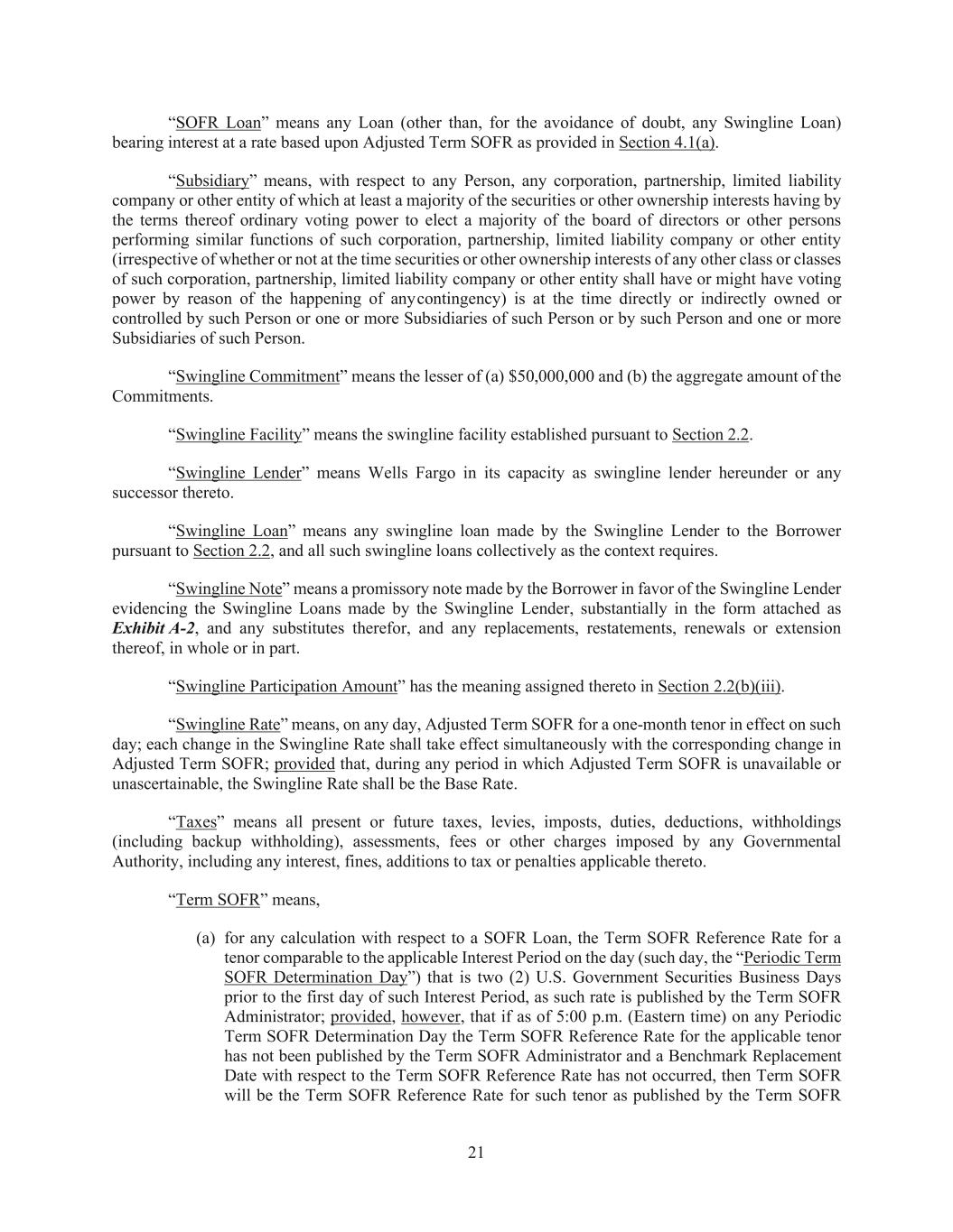 89 Credit Support) from such Covered Party will be effective to the same extent as the transfer would be effective under the U.S. Special Resolution Regime if the Supported QFC and such QFC Credit Support (and any such interest, obligation and rights in property) were governed by the laws of the United States or a state of the United States. In the event a Covered Party or a BHC Act Affiliate of a Covered Party becomes subject to a proceeding under a U.S. Special Resolution Regime, Default Rights under the Loan Documents that might otherwise apply to such Supported QFC or any QFC Credit Support that may be exercised against such Covered Party are permitted to be exercised to no greater extent than such Default Rights could be exercised under the U.S. Special Resolution Regime if the Supported QFC and the Loan Documents were governed by the laws of the United States or a state of the United States. Without limitation of the foregoing, it is understood and agreed that rights and remedies of the parties with respect to a Defaulting Lender shall in no event affect the rights of any Covered Party with respect to a Supported QFC or any QFC Credit Support. (b) As used in this Section 10.17, the following terms have the following meanings: “BHC Act Affiliate” of a party means an “affiliate” (as such term is defined under, and interpreted in accordance with, 12 U.S.C. 1841(k)) of such party. “Covered Entity” means any of the following: (i) a “covered entity” as that term is defined in, and interpreted in accordance with, 12 C.F.R. § 252.82(b); (ii) a “covered bank” as that term is defined in, and interpreted in accordance with, 12 C.F.R. § 47.3(b); or (iii) a “covered FSI” as that term is defined in, and interpreted in accordance with, 12 C.F.R. § 382.2(b). “Default Right” has the meaning assigned to that term in, and shall be interpreted in accordance with, 12 C.F.R. §§ 252.81, 47.2 or 382.1, as applicable. “QFC” has the meaning assigned to the term “qualified financial contract” in, and shall be interpreted in accordance with, 12 U.S.C. 5390(c)(8)(D). [Signature pages intentionally omitted.]