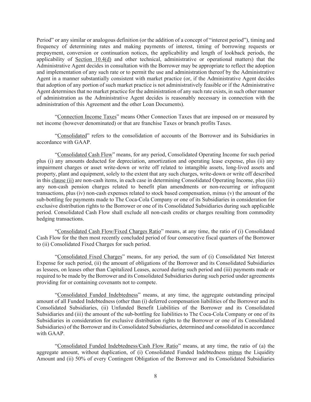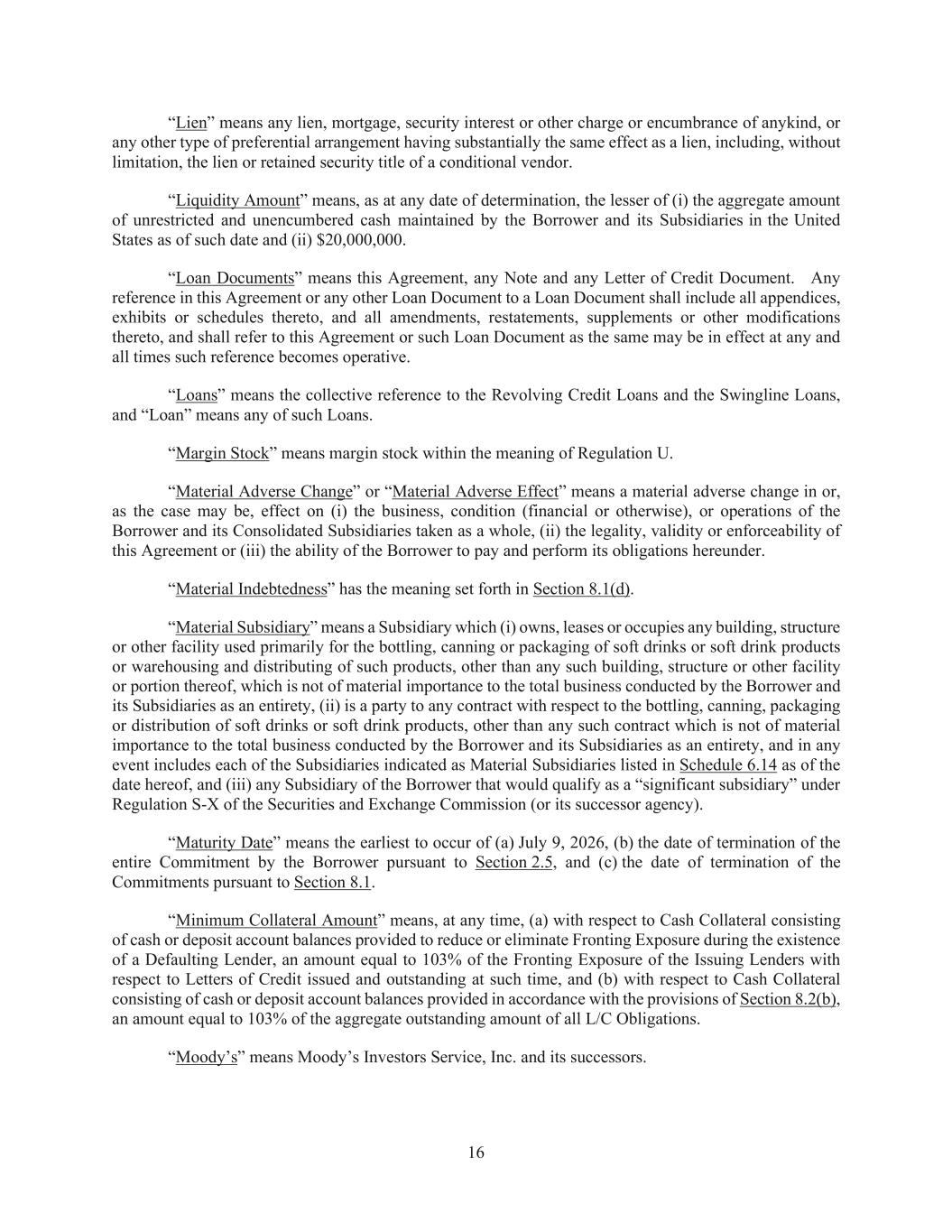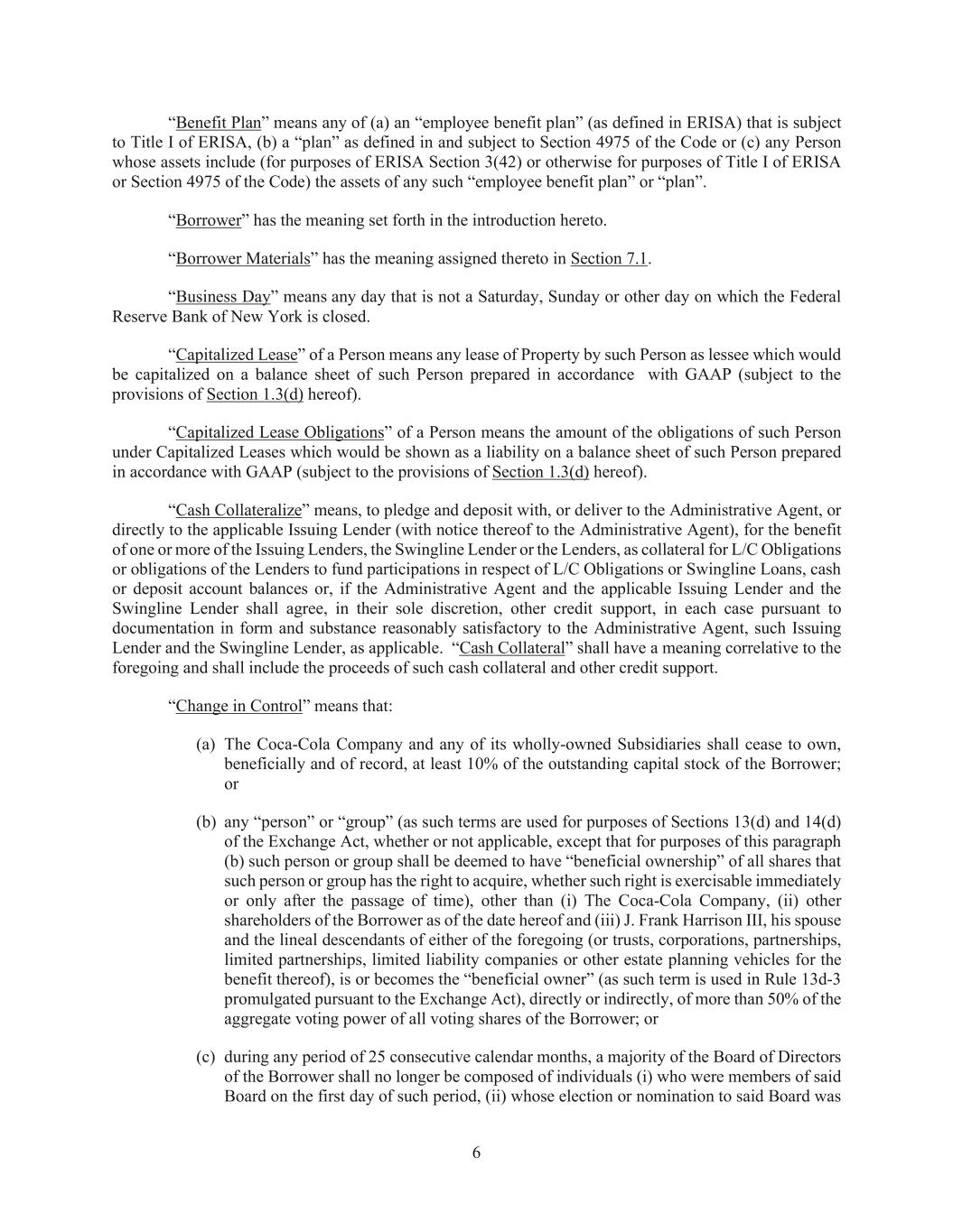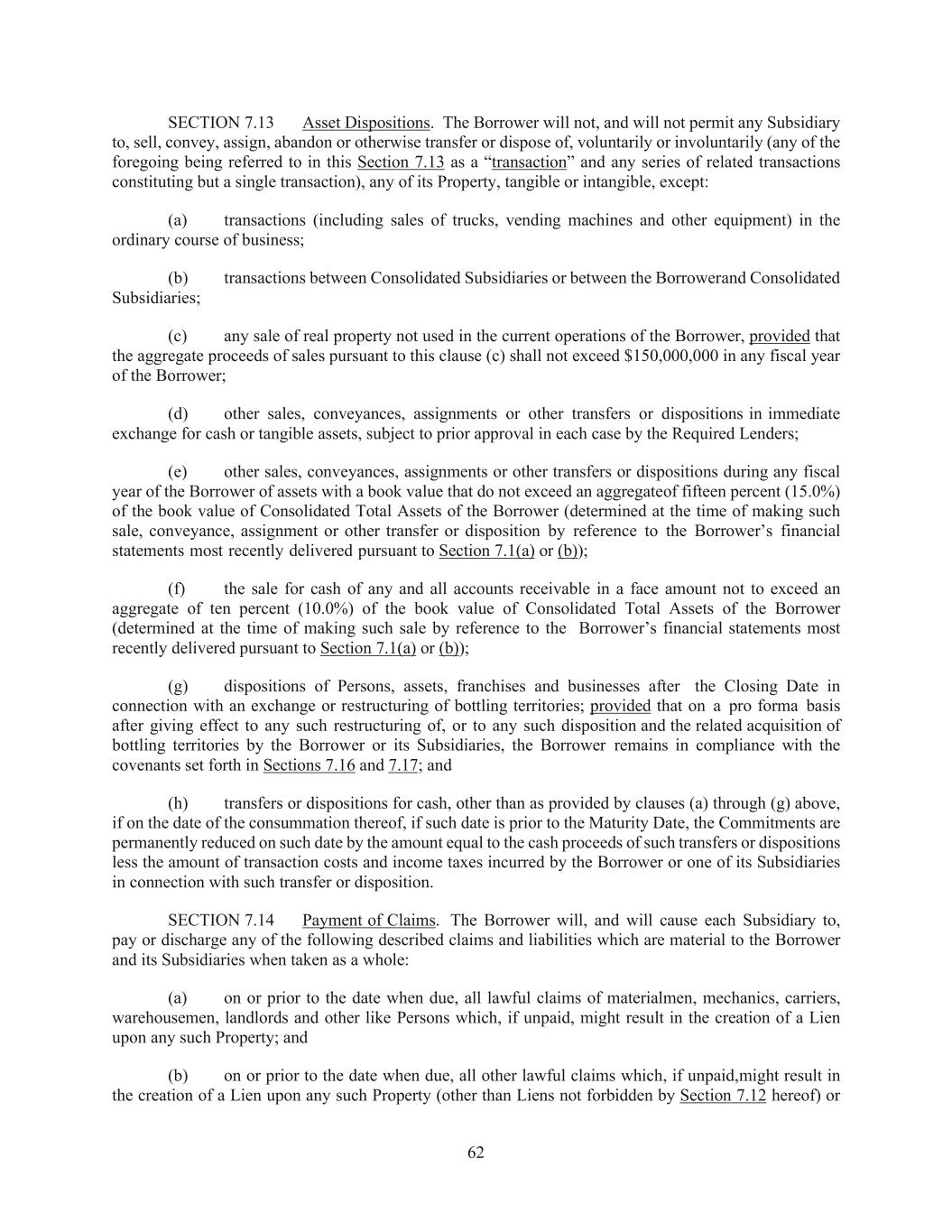 62 SECTION 7.13 Asset Dispositions. The Borrower will not, and will not permit any Subsidiary to, sell, convey, assign, abandon or otherwise transfer or dispose of, voluntarily or involuntarily (any of the foregoing being referred to in this Section 7.13 as a “transaction” and any series of related transactions constituting but a single transaction), any of its Property, tangible or intangible, except: (a) transactions (including sales of trucks, vending machines and other equipment) in the ordinary course of business; (b) transactions between Consolidated Subsidiaries or between the Borrower and Consolidated Subsidiaries; (c) any sale of real property not used in the current operations of the Borrower, provided that the aggregate proceeds of sales pursuant to this clause (c) shall not exceed $150,000,000 in any fiscal year of the Borrower; (d) other sales, conveyances, assignments or other transfers or dispositions in immediate exchange for cash or tangible assets, subject to prior approval in each case by the Required Lenders; (e) other sales, conveyances, assignments or other transfers or dispositions during any fiscal year of the Borrower of assets with a book value that do not exceed an aggregate of fifteen percent (15.0%) of the book value of Consolidated Total Assets of the Borrower (determined at the time of making such sale, conveyance, assignment or other transfer or disposition by reference to the Borrower’s financial statements most recently delivered pursuant to Section 7.1(a) or (b)); (f) the sale for cash of any and all accounts receivable in a face amount not to exceed an aggregate of ten percent (10.0%) of the book value of Consolidated Total Assets of the Borrower (determined at the time of making such sale by reference to the Borrower’s financial statements most recently delivered pursuant to Section 7.1(a) or (b)); (g) dispositions of Persons, assets, franchises and businesses after the Closing Date in connection with an exchange or restructuring of bottling territories; provided that on a pro forma basis after giving effect to any such restructuring of, or to any such disposition and the related acquisition of bottling territories by the Borrower or its Subsidiaries, the Borrower remains in compliance with the covenants set forth in Sections 7.16 and 7.17; and (h) transfers or dispositions for cash, other than as provided by clauses (a) through (g) above, if on the date of the consummation thereof, if such date is prior to the Maturity Date, the Commitments are permanently reduced on such date by the amount equal to the cash proceeds of such transfers or dispositions less the amount of transaction costs and income taxes incurred by the Borrower or one of its Subsidiaries in connection with such transfer or disposition. SECTION 7.14 Payment of Claims. The Borrower will, and will cause each Subsidiary to, pay or discharge any of the following described claims and liabilities which are material to the Borrower and its Subsidiaries when taken as a whole: (a) on or prior to the date when due, all lawful claims of materialmen, mechanics, carriers, warehousemen, landlords and other like Persons which, if unpaid, might result in the creation of a Lien upon any such Property; and (b) on or prior to the date when due, all other lawful claims which, if unpaid, might result in the creation of a Lien upon any such Property (other than Liens not forbidden by Section 7.12 hereof) or