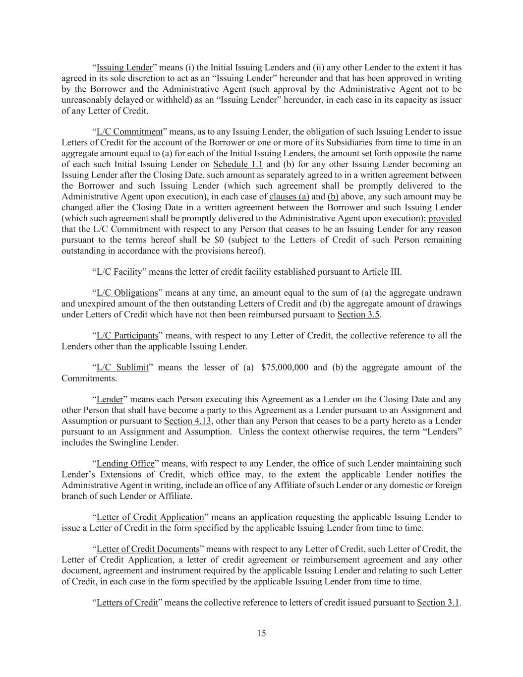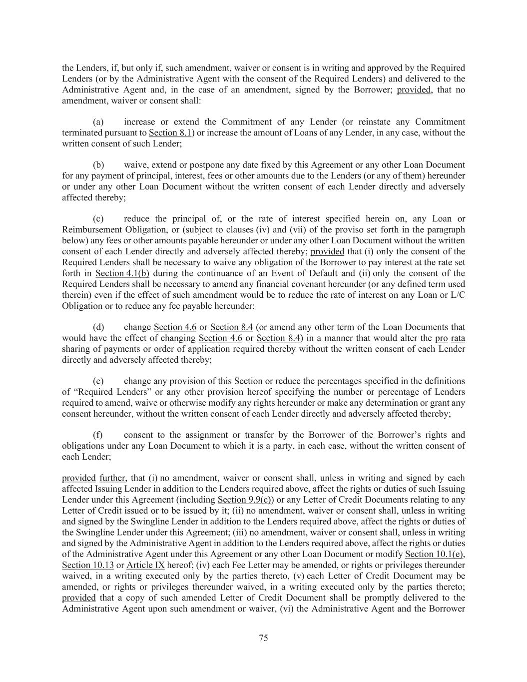 75 the Lenders, if, but only if, such amendment, waiver or consent is in writing and approved by the Required Lenders (or by the Administrative Agent with the consent of the Required Lenders) and delivered to the Administrative Agent and, in the case of an amendment, signed by the Borrower; provided, that no amendment, waiver or consent shall: (a) increase or extend the Commitment of any Lender (or reinstate any Commitment terminated pursuant to Section 8.1) or increase the amount of Loans of any Lender, in any case, without the written consent of such Lender; (b) waive, extend or postpone any date fixed by this Agreement or any other Loan Document for any payment of principal, interest, fees or other amounts due to the Lenders (or any of them) hereunder or under any other Loan Document without the written consent of each Lender directly and adversely affected thereby; (c) reduce the principal of, or the rate of interest specified herein on, any Loan or Reimbursement Obligation, or (subject to clauses (iv) and (vii) of the proviso set forth in the paragraph below) any fees or other amounts payable hereunder or under any other Loan Document without the written consent of each Lender directly and adversely affected thereby; provided that (i) only the consent of the Required Lenders shall be necessary to waive any obligation of the Borrower to pay interest at the rate set forth in Section 4.1(b) during the continuance of an Event of Default and (ii) only the consent of the Required Lenders shall be necessary to amend any financial covenant hereunder (or any defined term used therein) even if the effect of such amendment would be to reduce the rate of interest on any Loan or L/C Obligation or to reduce any fee payable hereunder; (d) change Section 4.6 or Section 8.4 (or amend any other term of the Loan Documents that would have the effect of changing Section 4.6 or Section 8.4) in a manner that would alter the pro rata sharing of payments or order of application required thereby without the written consent of each Lender directly and adversely affected thereby; (e) change any provision of this Section or reduce the percentages specified in the definitions of “Required Lenders” or any other provision hereof specifying the number or percentage of Lenders required to amend, waive or otherwise modify any rights hereunder or make any determination or grant any consent hereunder, without the written consent of each Lender directly and adversely affected thereby; (f) consent to the assignment or transfer by the Borrower of the Borrower’s rights and obligations under any Loan Document to which it is a party, in each case, without the written consent of each Lender; provided further, that (i) no amendment, waiver or consent shall, unless in writing and signed by each affected Issuing Lender in addition to the Lenders required above, affect the rights or duties of such Issuing Lender under this Agreement (including Section 9.9(c)) or any Letter of Credit Documents relating to any Letter of Credit issued or to be issued by it; (ii) no amendment, waiver or consent shall, unless in writing and signed by the Swingline Lender in addition to the Lenders required above, affect the rights or duties of the Swingline Lender under this Agreement; (iii) no amendment, waiver or consent shall, unless in writing and signed by the Administrative Agent in addition to the Lenders required above, affect the rights or duties of the Administrative Agent under this Agreement or any other Loan Document or modify Section 10.1(e), Section 10.13 or Article IX hereof; (iv) each Fee Letter may be amended, or rights or privileges thereunder waived, in a writing executed only by the parties thereto, (v) each Letter of Credit Document may be amended, or rights or privileges thereunder waived, in a writing executed only by the parties thereto; provided that a copy of such amended Letter of Credit Document shall be promptly delivered to the Administrative Agent upon such amendment or waiver, (vi) the Administrative Agent and the Borrower