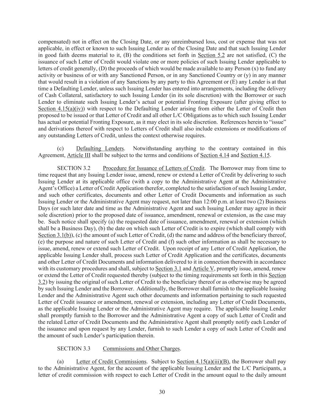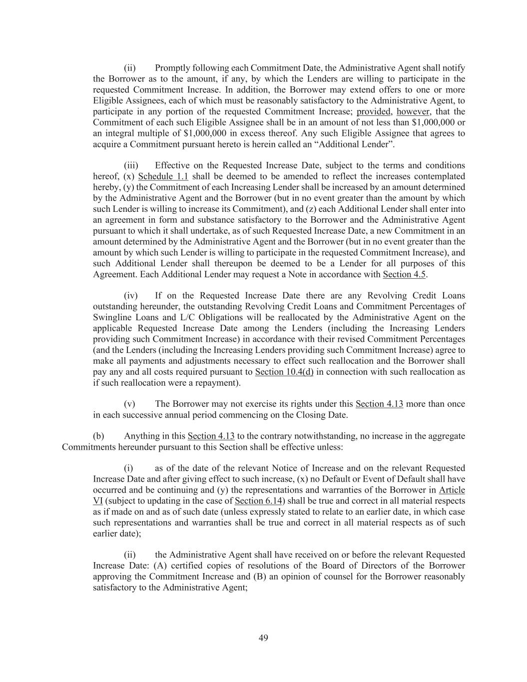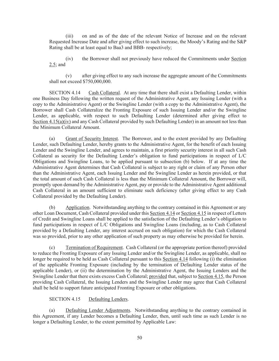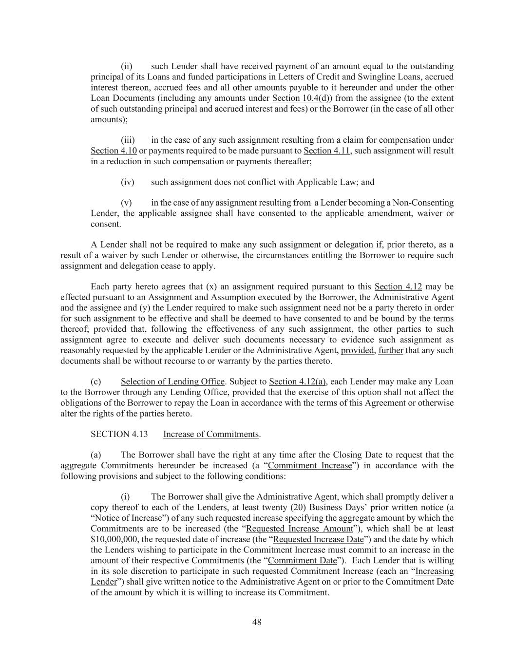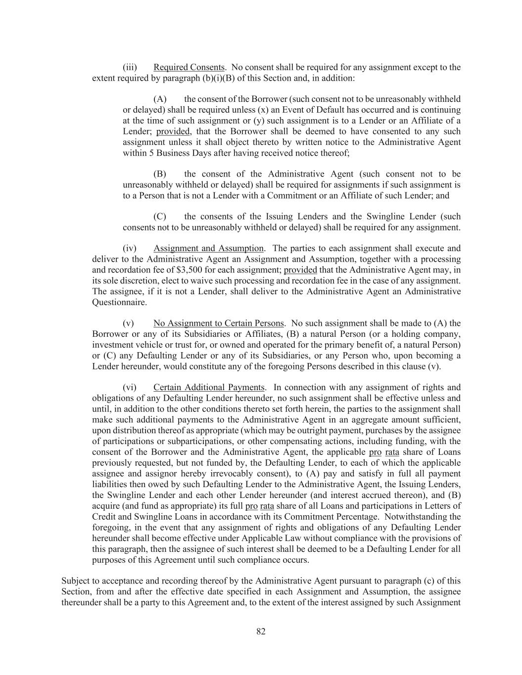 82 (iii) Required Consents. No consent shall be required for any assignment except to the extent required by paragraph (b)(i)(B) of this Section and, in addition: (A) the consent of the Borrower (such consent not to be unreasonably withheld or delayed) shall be required unless (x) an Event of Default has occurred and is continuing at the time of such assignment or (y) such assignment is to a Lender or an Affiliate of a Lender; provided, that the Borrower shall be deemed to have consented to any such assignment unless it shall object thereto by written notice to the Administrative Agent within 5 Business Days after having received notice thereof; (B) the consent of the Administrative Agent (such consent not to be unreasonably withheld or delayed) shall be required for assignments if such assignment is to a Person that is not a Lender with a Commitment or an Affiliate of such Lender; and (C) the consents of the Issuing Lenders and the Swingline Lender (such consents not to be unreasonably withheld or delayed) shall be required for any assignment. (iv) Assignment and Assumption. The parties to each assignment shall execute and deliver to the Administrative Agent an Assignment and Assumption, together with a processing and recordation fee of $3,500 for each assignment; provided that the Administrative Agent may, in its sole discretion, elect to waive such processing and recordation fee in the case of any assignment. The assignee, if it is not a Lender, shall deliver to the Administrative Agent an Administrative Questionnaire. (v) No Assignment to Certain Persons. No such assignment shall be made to (A) the Borrower or any of its Subsidiaries or Affiliates, (B) a natural Person (or a holding company, investment vehicle or trust for, or owned and operated for the primary benefit of, a natural Person) or (C) any Defaulting Lender or any of its Subsidiaries, or any Person who, upon becoming a Lender hereunder, would constitute any of the foregoing Persons described in this clause (v). (vi) Certain Additional Payments. In connection with any assignment of rights and obligations of any Defaulting Lender hereunder, no such assignment shall be effective unless and until, in addition to the other conditions thereto set forth herein, the parties to the assignment shall make such additional payments to the Administrative Agent in an aggregate amount sufficient, upon distribution thereof as appropriate (which may be outright payment, purchases by the assignee of participations or subparticipations, or other compensating actions, including funding, with the consent of the Borrower and the Administrative Agent, the applicable pro rata share of Loans previously requested, but not funded by, the Defaulting Lender, to each of which the applicable assignee and assignor hereby irrevocably consent), to (A) pay and satisfy in full all payment liabilities then owed by such Defaulting Lender to the Administrative Agent, the Issuing Lenders, the Swingline Lender and each other Lender hereunder (and interest accrued thereon), and (B) acquire (and fund as appropriate) its full pro rata share of all Loans and participations in Letters of Credit and Swingline Loans in accordance with its Commitment Percentage. Notwithstanding the foregoing, in the event that any assignment of rights and obligations of any Defaulting Lender hereunder shall become effective under Applicable Law without compliance with the provisions of this paragraph, then the assignee of such interest shall be deemed to be a Defaulting Lender for all purposes of this Agreement until such compliance occurs. Subject to acceptance and recording thereof by the Administrative Agent pursuant to paragraph (c) of this Section, from and after the effective date specified in each Assignment and Assumption, the assignee thereunder shall be a party to this Agreement and, to the extent of the interest assigned by such Assignment
