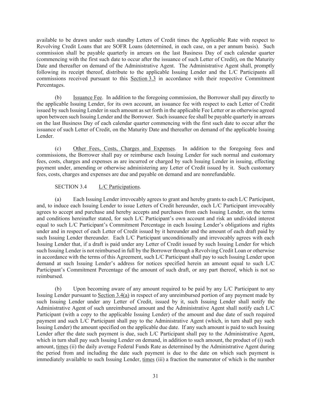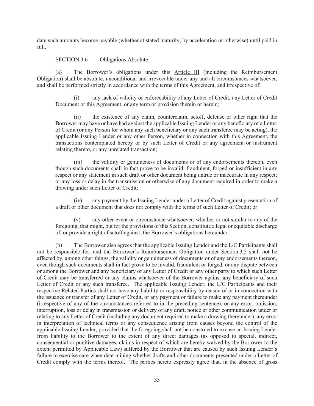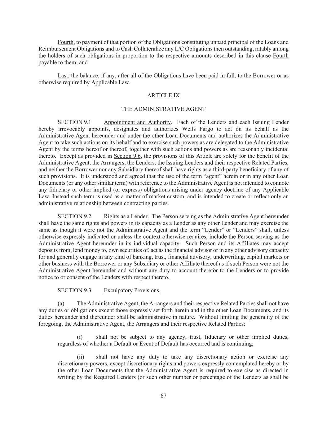 67 Fourth, to payment of that portion of the Obligations constituting unpaid principal of the Loans and Reimbursement Obligations and to Cash Collateralize any L/C Obligations then outstanding, ratably among the holders of such obligations in proportion to the respective amounts described in this clause Fourth payable to them; and Last, the balance, if any, after all of the Obligations have been paid in full, to the Borrower or as otherwise required by Applicable Law. ARTICLE IX THE ADMINISTRATIVE AGENT SECTION 9.1 Appointment and Authority. Each of the Lenders and each Issuing Lender hereby irrevocably appoints, designates and authorizes Wells Fargo to act on its behalf as the Administrative Agent hereunder and under the other Loan Documents and authorizes the Administrative Agent to take such actions on its behalf and to exercise such powers as are delegated to the Administrative Agent by the terms hereof or thereof, together with such actions and powers as are reasonably incidental thereto. Except as provided in Section 9.6, the provisions of this Article are solely for the benefit of the Administrative Agent, the Arrangers, the Lenders, the Issuing Lenders and their respective Related Parties, and neither the Borrower nor any Subsidiary thereof shall have rights as a third-party beneficiary of any of such provisions. It is understood and agreed that the use of the term “agent” herein or in any other Loan Documents (or any other similar term) with reference to the Administrative Agent is not intended to connote any fiduciary or other implied (or express) obligations arising under agency doctrine of any Applicable Law. Instead such term is used as a matter of market custom, and is intended to create or reflect only an administrative relationship between contracting parties. SECTION 9.2 Rights as a Lender. The Person serving as the Administrative Agent hereunder shall have the same rights and powers in its capacity as a Lender as any other Lender and may exercise the same as though it were not the Administrative Agent and the term “Lender” or “Lenders” shall, unless otherwise expressly indicated or unless the context otherwise requires, include the Person serving as the Administrative Agent hereunder in its individual capacity. Such Person and its Affiliates may accept deposits from, lend money to, own securities of, act as the financial advisor or in any other advisory capacity for and generally engage in any kind of banking, trust, financial advisory, underwriting, capital markets or other business with the Borrower or any Subsidiary or other Affiliate thereof as if such Person were not the Administrative Agent hereunder and without any duty to account therefor to the Lenders or to provide notice to or consent of the Lenders with respect thereto. SECTION 9.3 Exculpatory Provisions. (a) The Administrative Agent, the Arrangers and their respective Related Parties shall not have any duties or obligations except those expressly set forth herein and in the other Loan Documents, and its duties hereunder and thereunder shall be administrative in nature. Without limiting the generality of the foregoing, the Administrative Agent, the Arrangers and their respective Related Parties: (i) shall not be subject to any agency, trust, fiduciary or other implied duties, regardless of whether a Default or Event of Default has occurred and is continuing; (ii) shall not have any duty to take any discretionary action or exercise any discretionary powers, except discretionary rights and powers expressly contemplated hereby or by the other Loan Documents that the Administrative Agent is required to exercise as directed in writing by the Required Lenders (or such other number or percentage of the Lenders as shall be