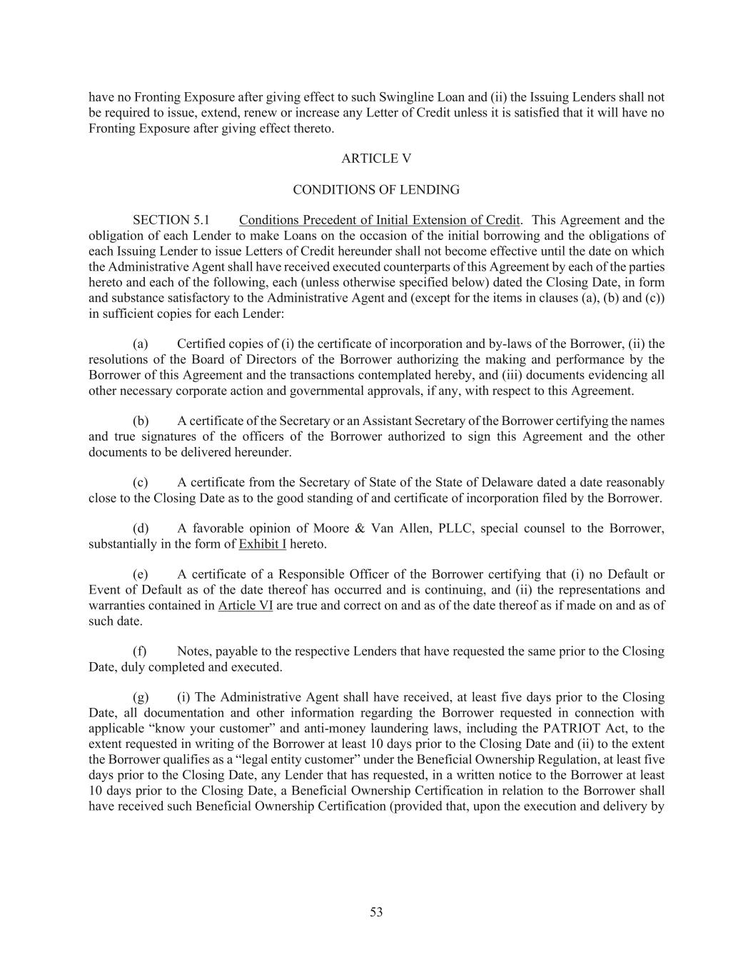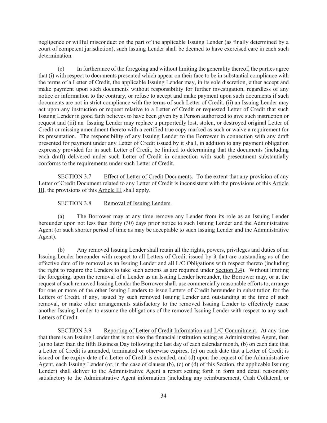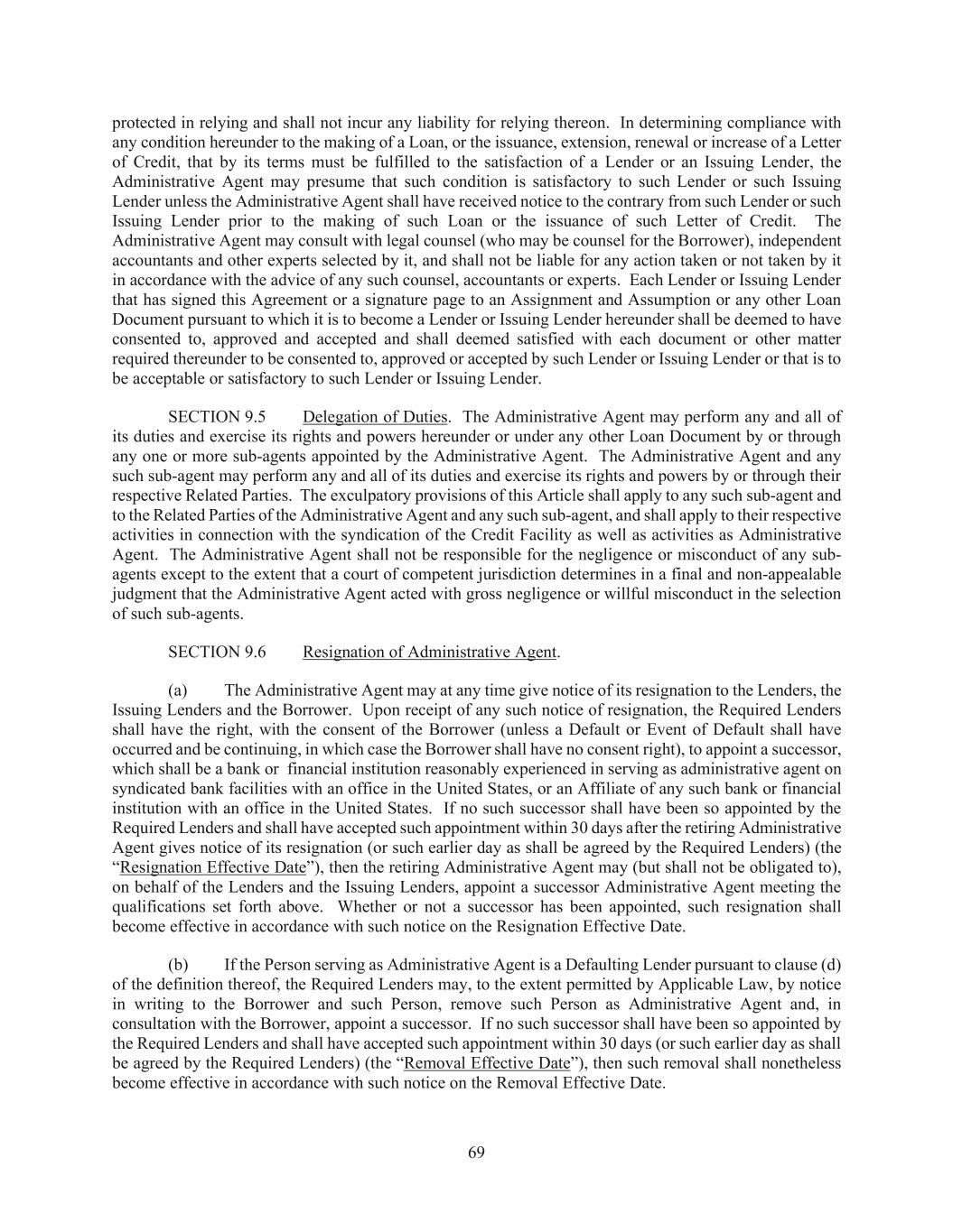 69 protected in relying and shall not incur any liability for relying thereon. In determining compliance with any condition hereunder to the making of a Loan, or the issuance, extension, renewal or increase of a Letter of Credit, that by its terms must be fulfilled to the satisfaction of a Lender or an Issuing Lender, the Administrative Agent may presume that such condition is satisfactory to such Lender or such Issuing Lender unless the Administrative Agent shall have received notice to the contrary from such Lender or such Issuing Lender prior to the making of such Loan or the issuance of such Letter of Credit. The Administrative Agent may consult with legal counsel (who may be counsel for the Borrower), independent accountants and other experts selected by it, and shall not be liable for any action taken or not taken by it in accordance with the advice of any such counsel, accountants or experts. Each Lender or Issuing Lender that has signed this Agreement or a signature page to an Assignment and Assumption or any other Loan Document pursuant to which it is to become a Lender or Issuing Lender hereunder shall be deemed to have consented to, approved and accepted and shall deemed satisfied with each document or other matter required thereunder to be consented to, approved or accepted by such Lender or Issuing Lender or that is to be acceptable or satisfactory to such Lender or Issuing Lender. SECTION 9.5 Delegation of Duties. The Administrative Agent may perform any and all of its duties and exercise its rights and powers hereunder or under any other Loan Document by or through any one or more sub-agents appointed by the Administrative Agent. The Administrative Agent and any such sub-agent may perform any and all of its duties and exercise its rights and powers by or through their respective Related Parties. The exculpatory provisions of this Article shall apply to any such sub-agent and to the Related Parties of the Administrative Agent and any such sub-agent, and shall apply to their respective activities in connection with the syndication of the Credit Facility as well as activities as Administrative Agent. The Administrative Agent shall not be responsible for the negligence or misconduct of any sub- agents except to the extent that a court of competent jurisdiction determines in a final and non-appealable judgment that the Administrative Agent acted with gross negligence or willful misconduct in the selection of such sub-agents. SECTION 9.6 Resignation of Administrative Agent. (a) The Administrative Agent may at any time give notice of its resignation to the Lenders, the Issuing Lenders and the Borrower. Upon receipt of any such notice of resignation, the Required Lenders shall have the right, with the consent of the Borrower (unless a Default or Event of Default shall have occurred and be continuing, in which case the Borrower shall have no consent right), to appoint a successor, which shall be a bank or financial institution reasonably experienced in serving as administrative agent on syndicated bank facilities with an office in the United States, or an Affiliate of any such bank or financial institution with an office in the United States. If no such successor shall have been so appointed by the Required Lenders and shall have accepted such appointment within 30 days after the retiring Administrative Agent gives notice of its resignation (or such earlier day as shall be agreed by the Required Lenders) (the “Resignation Effective Date”), then the retiring Administrative Agent may (but shall not be obligated to), on behalf of the Lenders and the Issuing Lenders, appoint a successor Administrative Agent meeting the qualifications set forth above. Whether or not a successor has been appointed, such resignation shall become effective in accordance with such notice on the Resignation Effective Date. (b) If the Person serving as Administrative Agent is a Defaulting Lender pursuant to clause (d) of the definition thereof, the Required Lenders may, to the extent permitted by Applicable Law, by notice in writing to the Borrower and such Person, remove such Person as Administrative Agent and, in consultation with the Borrower, appoint a successor. If no such successor shall have been so appointed by the Required Lenders and shall have accepted such appointment within 30 days (or such earlier day as shall be agreed by the Required Lenders) (the “Removal Effective Date”), then such removal shall nonetheless become effective in accordance with such notice on the Removal Effective Date.