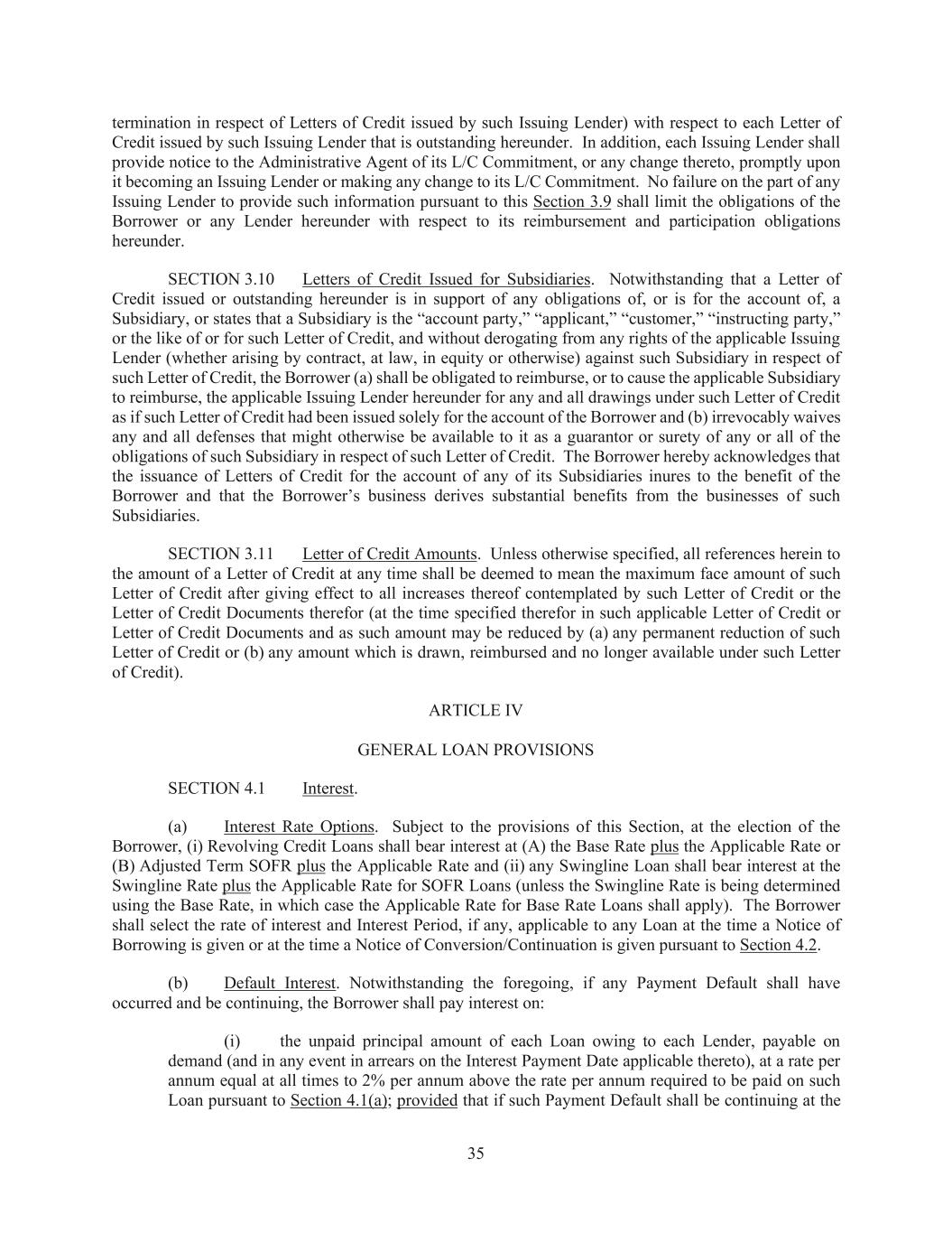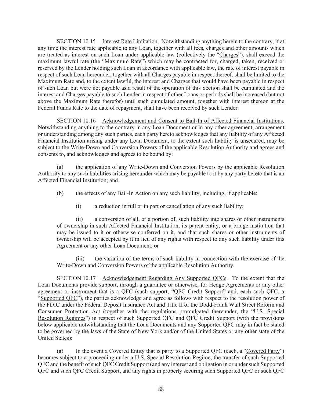 88 SECTION 10.15 Interest Rate Limitation. Notwithstanding anything herein to the contrary, if at any time the interest rate applicable to any Loan, together with all fees, charges and other amounts which are treated as interest on such Loan under applicable law (collectively the “Charges”), shall exceed the maximum lawful rate (the “Maximum Rate”) which may be contracted for, charged, taken, received or reserved by the Lender holding such Loan in accordance with applicable law, the rate of interest payable in respect of such Loan hereunder, together with all Charges payable in respect thereof, shall be limited to the Maximum Rate and, to the extent lawful, the interest and Charges that would have been payable in respect of such Loan but were not payable as a result of the operation of this Section shall be cumulated and the interest and Charges payable to such Lender in respect of other Loans or periods shall be increased (but not above the Maximum Rate therefor) until such cumulated amount, together with interest thereon at the Federal Funds Rate to the date of repayment, shall have been received by such Lender. SECTION 10.16 Acknowledgement and Consent to Bail-In of Affected Financial Institutions. Notwithstanding anything to the contrary in any Loan Document or in any other agreement, arrangement or understanding among any such parties, each party hereto acknowledges that any liability of any Affected Financial Institution arising under any Loan Document, to the extent such liability is unsecured, may be subject to the Write-Down and Conversion Powers of the applicable Resolution Authority and agrees and consents to, and acknowledges and agrees to be bound by: (a) the application of any Write-Down and Conversion Powers by the applicable Resolution Authority to any such liabilities arising hereunder which may be payable to it by any party hereto that is an Affected Financial Institution; and (b) the effects of any Bail-In Action on any such liability, including, if applicable: (i) a reduction in full or in part or cancellation of any such liability; (ii) a conversion of all, or a portion of, such liability into shares or other instruments of ownership in such Affected Financial Institution, its parent entity, or a bridge institution that may be issued to it or otherwise conferred on it, and that such shares or other instruments of ownership will be accepted by it in lieu of any rights with respect to any such liability under this Agreement or any other Loan Document; or (iii) the variation of the terms of such liability in connection with the exercise of the Write-Down and Conversion Powers of the applicable Resolution Authority. SECTION 10.17 Acknowledgement Regarding Any Supported QFCs. To the extent that the Loan Documents provide support, through a guarantee or otherwise, for Hedge Agreements or any other agreement or instrument that is a QFC (such support, “QFC Credit Support” and, each such QFC, a “Supported QFC”), the parties acknowledge and agree as follows with respect to the resolution power of the FDIC under the Federal Deposit Insurance Act and Title II of the Dodd-Frank Wall Street Reform and Consumer Protection Act (together with the regulations promulgated thereunder, the “U.S. Special Resolution Regimes”) in respect of such Supported QFC and QFC Credit Support (with the provisions below applicable notwithstanding that the Loan Documents and any Supported QFC may in fact be stated to be governed by the laws of the State of New York and/or of the United States or any other state of the United States): (a) In the event a Covered Entity that is party to a Supported QFC (each, a “Covered Party”) becomes subject to a proceeding under a U.S. Special Resolution Regime, the transfer of such Supported QFC and the benefit of such QFC Credit Support (and any interest and obligation in or under such Supported QFC and such QFC Credit Support, and any rights in property securing such Supported QFC or such QFC