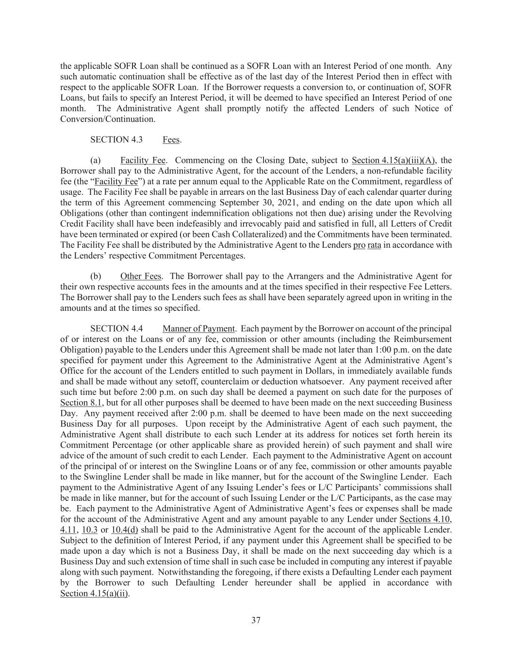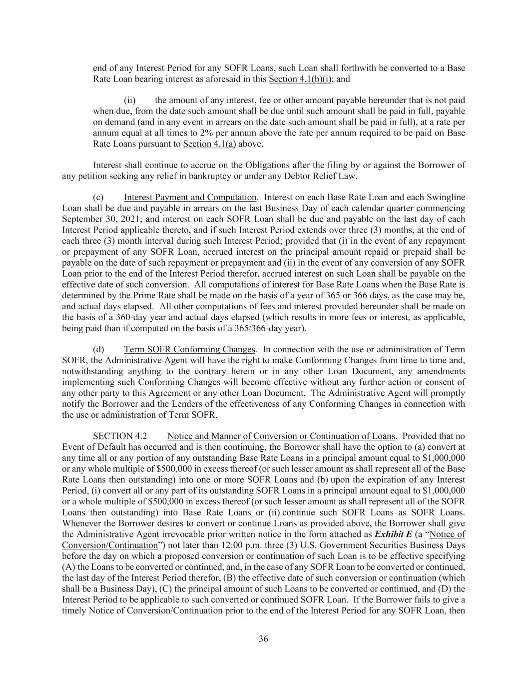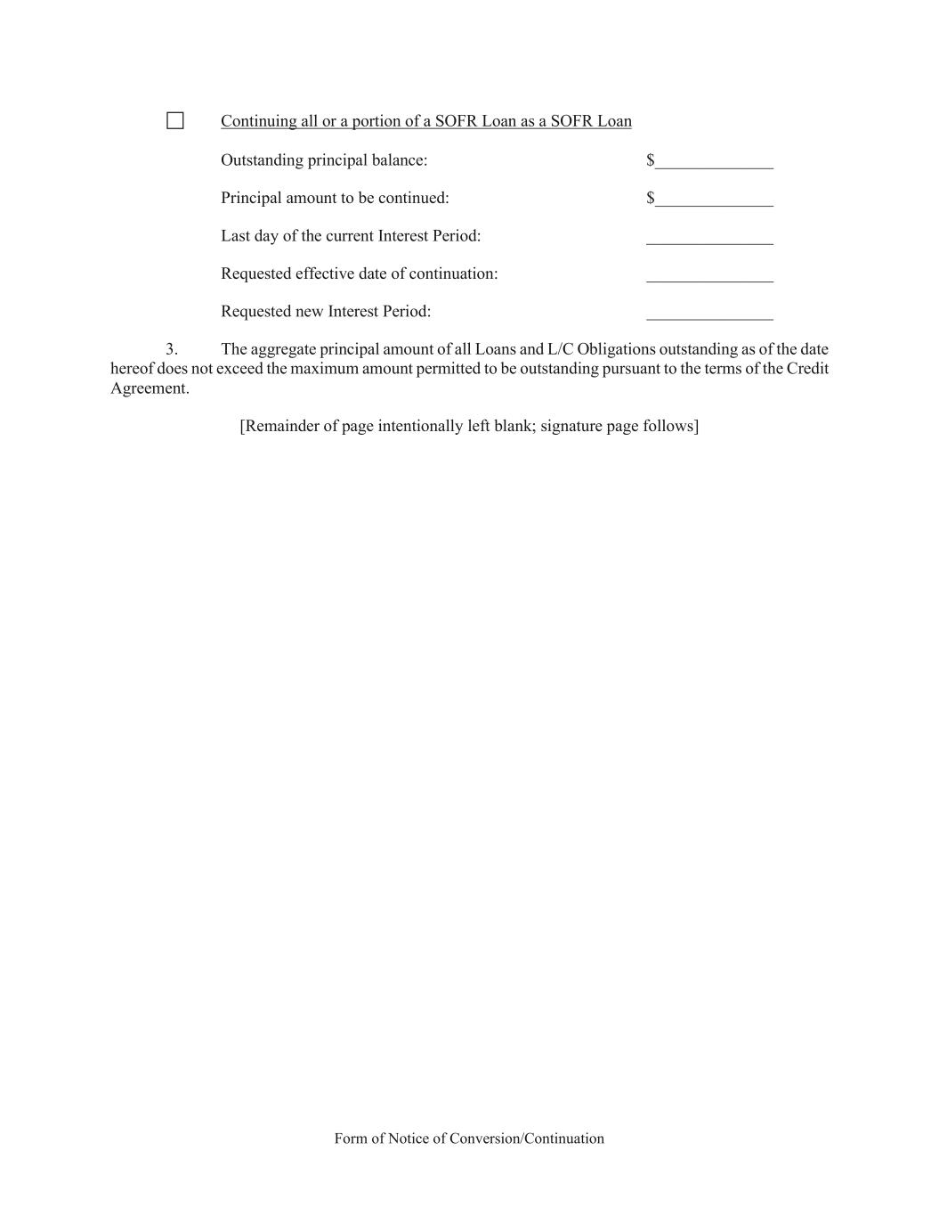 Form of Notice of Conversion/Continuation Continuing all or a portion of a SOFR Loan as a SOFR Loan Outstanding principal balance: $______________ Principal amount to be continued: $______________ Last day of the current Interest Period: _______________ Requested effective date of continuation: _______________ Requested new Interest Period: _______________ 3. The aggregate principal amount of all Loans and L/C Obligations outstanding as of the date hereof does not exceed the maximum amount permitted to be outstanding pursuant to the terms of the Credit Agreement. [Remainder of page intentionally left blank; signature page follows]