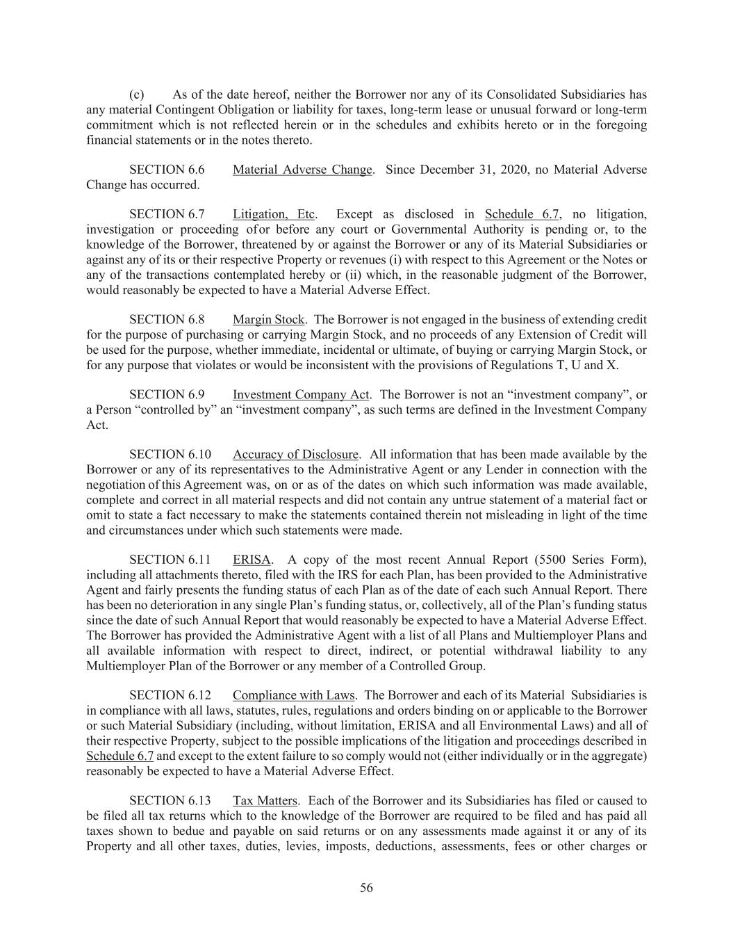 59 SECTION 7.2 Use of Proceeds. The Borrower will, and will cause each Subsidiary to, use the proceeds of any Extension of Credit solely for its general corporate purposes; provided that neither the Administrative Agent nor any Lender shall have any responsibility as to the use of any such proceeds. The Borrower will not request any Loan or Letter of Credit, and the Borrower shall not use, and shall procure that its Subsidiaries shall not use, the proceeds of any Loan or Letter of Credit (i) in furtherance of an offer, payment, promise to pay, or authorization of the payment or giving of money, or anything else of value, to any Person in violation of any Anti-Corruption Laws or anti-money laundering laws, (ii) for the purpose of funding, financing or facilitating any activities, business or transaction of or with any Sanctioned Person, or in any Sanctioned Country or (iii) in any manner that would result in the violation of any Sanctions applicable to any party hereto. SECTION 7.3 Certain Notices. (a) The Borrower will give notice in writing to the Administrative Agent and the Lenders of (i) the occurrence of any Default or Event of Default and (ii) any change in the rating of the long-term senior unsecured non-credit-enhanced debt obligations of the Borrower by Moody’s, S&P or Fitch, each such notice to be given promptly and in any event within five (5) days after occurrence thereof. (b) Promptly after the Borrower, any member of a Controlled Group or any administrator of a Plan: (i) receives the notification referred to in clauses (i), (iv) or (vii) of Section 8.1(h); (ii) has knowledge of (A) the occurrence of a Reportable Event with respect to a Plan; (B) any event which has occurred or any action which has been taken to amend or terminate a Plan as referred to in clauses (ii) and (vi) of Section 8.1(h); (C) any event which has occurred or any action which has been taken which could result in complete withdrawal, partial withdrawal, or secondary liability for withdrawal liability payments with respect to a Multiemployer Plan as referred to in clause (vii) of Section 8.1(h); or (D) any action which has been taken in furtherance of, any agreement which has been entered into for, or any petition which has been filed with a United States district court for, the appointment of a trustee for a Plan as referred to in clause (iii) of Section 8.1(h), or (iii) files a notice of intent to terminate a Plan with the IRS or the PBGC; or files with the IRS a request pursuant to Section 412(d) of the Code for a variance from the minimum funding standard for a Plan; or files a return with the IRS with respect to the tax imposed under Section 4971(a) of the Code for failure to meet the minimum funding standards established under Section 412 of the Code for a Plan, the Borrower will furnish to the Administrative Agent a copy of any notice received, request or petition filed and agreement entered into; the most recent Annual Report (Form 5500 Series) and attachments thereto for the Plan; the most recent actuarial report for the Plan; any notice, return or materials required to be filed with the IRS in connection with the event, action or filing; and a written statement of a Responsible Officer describing the event or the action taken and the reasons therefor. SECTION 7.4 Conduct of Business. The Borrower will, and will cause each Material Subsidiary to, do all things necessary (if applicable) to remain duly incorporated, validly existing and in good standing as a domestic corporation in its jurisdiction of incorporation and maintain all requisite authority to conduct its business in each jurisdiction in which its business is conducted except where such failure to remain in good standing or to maintain such authority would not reasonably be expected to have a Material Adverse Effect. The Borrower will continue to engage in its business substantially as conducted