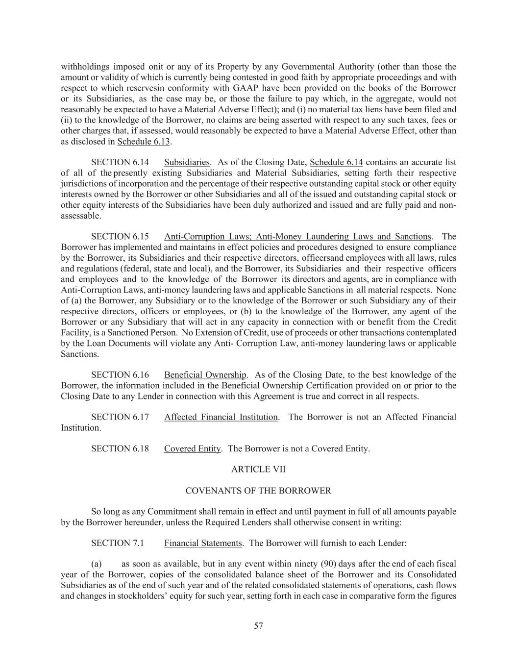 58 for the previous year, certified without qualification arising out of the scope of the audit, by independent certified public accountants of nationally recognized standing; (b) as soon as available, but in any event not later than forty-five (45) days after the end of each of the first three quarterly periods of each fiscal year of the Borrower, copies of the unaudited consolidated balance sheet of the Borrower and its Consolidated Subsidiaries as of the end of such quarter and of the related unaudited consolidated statements of operations, cash flows and changes in stockholders’ equity of the Borrower and its Consolidated Subsidiaries for such quarterly period and the portion of the fiscal year through such date, setting forth in each case in comparative form figures for the previous year, certified by a Responsible Officer (subject to normal year-end audit adjustments); (c) concurrently with the delivery of the financial statements referred to in clauses (a) and (b) above, a Compliance Certificate; (d) promptly upon the filing thereof, copies of all registration statements and annual and quarterly reports which the Borrower files with the Securities and Exchange Commission; and (e) (x) such other information relating to the Borrower and its Subsidiaries as the Administrative Agent or any Lender may from time to time reasonably request and (y) information and documentation reasonably requested by the Administrative Agent or any Lender for purposes of compliance with applicable “know your customer”, Anti-Corruption Laws and anti-money laundering laws, including the PATRIOT Act and the Beneficial Ownership Regulation. Documents required to be delivered pursuant to clauses (a) and (b) of this Section 7.1 shall be deemed to have been delivered on the date on which such documents are filed for public availability on the Securities and Exchange Commission’s Electronic Data Gathering and Retrieval System; provided that the Borrower will provide electronic versions or paper copies thereof to the Administrative Agent upon request. All such financial statements shall be complete and correct in all material respects and shall be prepared in reasonable detail and in accordance with GAAP applied consistently throughout the periods reflected therein (except as approved by such accountants or officer, as the case may be, and disclosed therein). The Borrower hereby acknowledges that (a) the Administrative Agent and/or the Arrangers will make available to the Lenders and the Issuing Lenders materials and/or information provided by or on behalf of the Borrower hereunder (collectively, “Borrower Materials”) by posting the Borrower Materials on the Platform and (b) certain of the Lenders may be “public-side” Lenders (i.e., Lenders that do not wish to receive material non-public information with respect to the Borrower or its securities) (each, a “Public Lender”). The Borrower hereby agrees that it will use commercially reasonable efforts to identify that portion of the Borrower Materials that may be distributed to the Public Lenders and that (w) all such Borrower Materials shall be clearly and conspicuously marked “PUBLIC” which, at a minimum, means that the word “PUBLIC” shall appear prominently on the first page thereof; (x) by marking Borrower Materials “PUBLIC,” the Borrower shall be deemed to have authorized the Administrative Agent, the Arrangers, the Issuing Lenders and the Lenders to treat such Borrower Materials as not containing any material non-public information (although it may be sensitive and proprietary) with respect to the Borrower or its securities for purposes of United States federal and state securities laws (provided, however, that to the extent such Borrower Materials constitute Information, they shall be treated as set forth in Section 10.10); (y) all Borrower Materials marked “PUBLIC” are permitted to be made available through a portion of the Platform designated “Public Investor;” and (z) the Administrative Agent and the Arrangers shall be entitled to treat any Borrower Materials that are not marked “PUBLIC” as being suitable only for posting on a portion of the Platform not designated “Public Investor.”