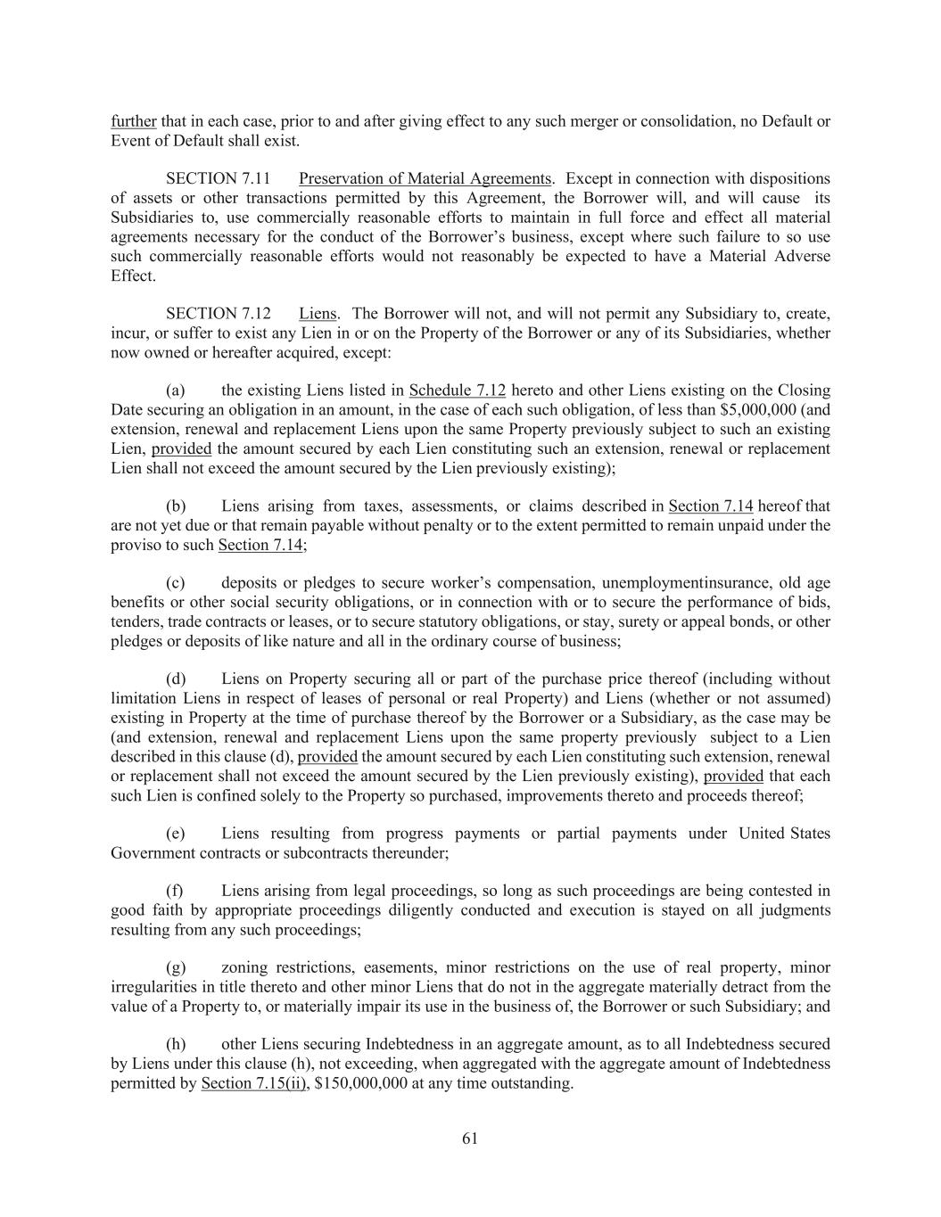 61 further that in each case, prior to and after giving effect to any such merger or consolidation, no Default or Event of Default shall exist. SECTION 7.11 Preservation of Material Agreements. Except in connection with dispositions of assets or other transactions permitted by this Agreement, the Borrower will, and will cause its Subsidiaries to, use commercially reasonable efforts to maintain in full force and effect all material agreements necessary for the conduct of the Borrower’s business, except where such failure to so use such commercially reasonable efforts would not reasonably be expected to have a Material Adverse Effect. SECTION 7.12 Liens. The Borrower will not, and will not permit any Subsidiary to, create, incur, or suffer to exist any Lien in or on the Property of the Borrower or any of its Subsidiaries, whether now owned or hereafter acquired, except: (a) the existing Liens listed in Schedule 7.12 hereto and other Liens existing on the Closing Date securing an obligation in an amount, in the case of each such obligation, of less than $5,000,000 (and extension, renewal and replacement Liens upon the same Property previously subject to such an existing Lien, provided the amount secured by each Lien constituting such an extension, renewal or replacement Lien shall not exceed the amount secured by the Lien previously existing); (b) Liens arising from taxes, assessments, or claims described in Section 7.14 hereof that are not yet due or that remain payable without penalty or to the extent permitted to remain unpaid under the proviso to such Section 7.14; (c) deposits or pledges to secure worker’s compensation, unemployment insurance, old age benefits or other social security obligations, or in connection with or to secure the performance of bids, tenders, trade contracts or leases, or to secure statutory obligations, or stay, surety or appeal bonds, or other pledges or deposits of like nature and all in the ordinary course of business; (d) Liens on Property securing all or part of the purchase price thereof (including without limitation Liens in respect of leases of personal or real Property) and Liens (whether or not assumed) existing in Property at the time of purchase thereof by the Borrower or a Subsidiary, as the case may be (and extension, renewal and replacement Liens upon the same property previously subject to a Lien described in this clause (d), provided the amount secured by each Lien constituting such extension, renewal or replacement shall not exceed the amount secured by the Lien previously existing), provided that each such Lien is confined solely to the Property so purchased, improvements thereto and proceeds thereof; (e) Liens resulting from progress payments or partial payments under United States Government contracts or subcontracts thereunder; (f) Liens arising from legal proceedings, so long as such proceedings are being contested in good faith by appropriate proceedings diligently conducted and execution is stayed on all judgments resulting from any such proceedings; (g) zoning restrictions, easements, minor restrictions on the use of real property, minor irregularities in title thereto and other minor Liens that do not in the aggregate materially detract from the value of a Property to, or materially impair its use in the business of, the Borrower or such Subsidiary; and (h) other Liens securing Indebtedness in an aggregate amount, as to all Indebtedness secured by Liens under this clause (h), not exceeding, when aggregated with the aggregate amount of Indebtedness permitted by Section 7.15(ii), $150,000,000 at any time outstanding.