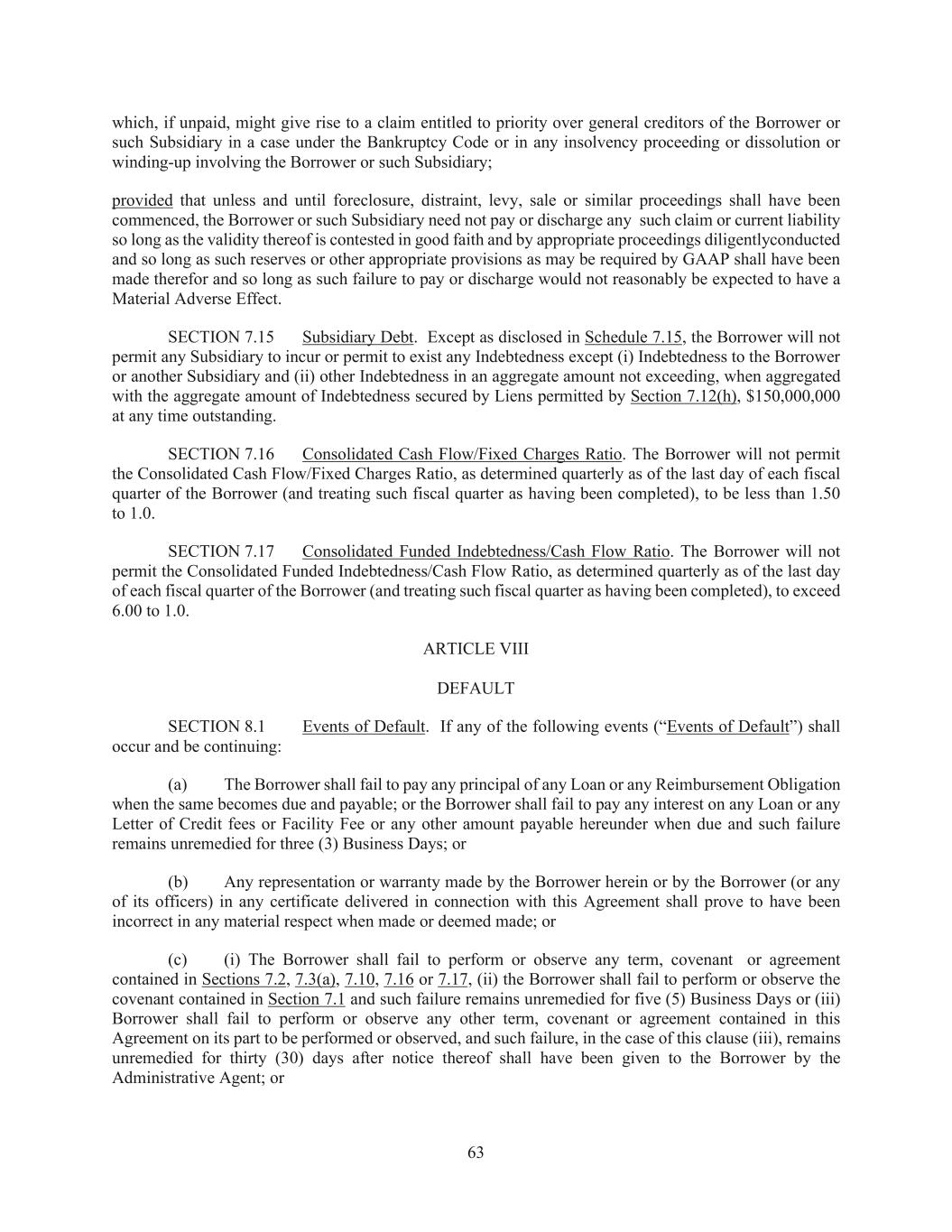 63 which, if unpaid, might give rise to a claim entitled to priority over general creditors of the Borrower or such Subsidiary in a case under the Bankruptcy Code or in any insolvency proceeding or dissolution or winding-up involving the Borrower or such Subsidiary; provided that unless and until foreclosure, distraint, levy, sale or similar proceedings shall have been commenced, the Borrower or such Subsidiary need not pay or discharge any such claim or current liability so long as the validity thereof is contested in good faith and by appropriate proceedings diligently conducted and so long as such reserves or other appropriate provisions as may be required by GAAP shall have been made therefor and so long as such failure to pay or discharge would not reasonably be expected to have a Material Adverse Effect. SECTION 7.15 Subsidiary Debt. Except as disclosed in Schedule 7.15, the Borrower will not permit any Subsidiary to incur or permit to exist any Indebtedness except (i) Indebtedness to the Borrower or another Subsidiary and (ii) other Indebtedness in an aggregate amount not exceeding, when aggregated with the aggregate amount of Indebtedness secured by Liens permitted by Section 7.12(h), $150,000,000 at any time outstanding. SECTION 7.16 Consolidated Cash Flow/Fixed Charges Ratio. The Borrower will not permit the Consolidated Cash Flow/Fixed Charges Ratio, as determined quarterly as of the last day of each fiscal quarter of the Borrower (and treating such fiscal quarter as having been completed), to be less than 1.50 to 1.0. SECTION 7.17 Consolidated Funded Indebtedness/Cash Flow Ratio. The Borrower will not permit the Consolidated Funded Indebtedness/Cash Flow Ratio, as determined quarterly as of the last day of each fiscal quarter of the Borrower (and treating such fiscal quarter as having been completed), to exceed 6.00 to 1.0. ARTICLE VIII DEFAULT SECTION 8.1 Events of Default. If any of the following events (“Events of Default”) shall occur and be continuing: (a) The Borrower shall fail to pay any principal of any Loan or any Reimbursement Obligation when the same becomes due and payable; or the Borrower shall fail to pay any interest on any Loan or any Letter of Credit fees or Facility Fee or any other amount payable hereunder when due and such failure remains unremedied for three (3) Business Days; or (b) Any representation or warranty made by the Borrower herein or by the Borrower (or any of its officers) in any certificate delivered in connection with this Agreement shall prove to have been incorrect in any material respect when made or deemed made; or (c) (i) The Borrower shall fail to perform or observe any term, covenant or agreement contained in Sections 7.2, 7.3(a), 7.10, 7.16 or 7.17, (ii) the Borrower shall fail to perform or observe the covenant contained in Section 7.1 and such failure remains unremedied for five (5) Business Days or (iii) Borrower shall fail to perform or observe any other term, covenant or agreement contained in this Agreement on its part to be performed or observed, and such failure, in the case of this clause (iii), remains unremedied for thirty (30) days after notice thereof shall have been given to the Borrower by the Administrative Agent; or