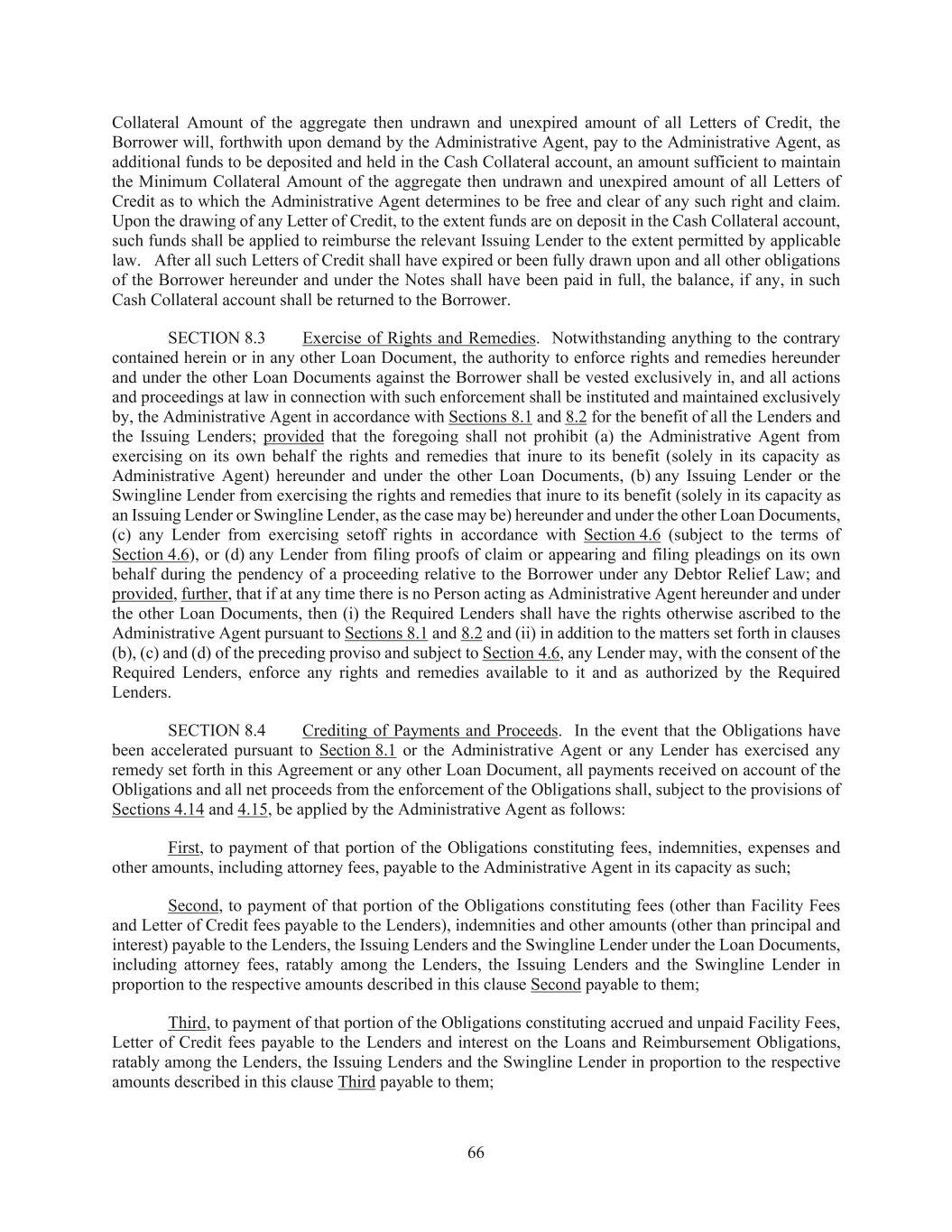 66 Collateral Amount of the aggregate then undrawn and unexpired amount of all Letters of Credit, the Borrower will, forthwith upon demand by the Administrative Agent, pay to the Administrative Agent, as additional funds to be deposited and held in the Cash Collateral account, an amount sufficient to maintain the Minimum Collateral Amount of the aggregate then undrawn and unexpired amount of all Letters of Credit as to which the Administrative Agent determines to be free and clear of any such right and claim. Upon the drawing of any Letter of Credit, to the extent funds are on deposit in the Cash Collateral account, such funds shall be applied to reimburse the relevant Issuing Lender to the extent permitted by applicable law. After all such Letters of Credit shall have expired or been fully drawn upon and all other obligations of the Borrower hereunder and under the Notes shall have been paid in full, the balance, if any, in such Cash Collateral account shall be returned to the Borrower. SECTION 8.3 Exercise of Rights and Remedies. Notwithstanding anything to the contrary contained herein or in any other Loan Document, the authority to enforce rights and remedies hereunder and under the other Loan Documents against the Borrower shall be vested exclusively in, and all actions and proceedings at law in connection with such enforcement shall be instituted and maintained exclusively by, the Administrative Agent in accordance with Sections 8.1 and 8.2 for the benefit of all the Lenders and the Issuing Lenders; provided that the foregoing shall not prohibit (a) the Administrative Agent from exercising on its own behalf the rights and remedies that inure to its benefit (solely in its capacity as Administrative Agent) hereunder and under the other Loan Documents, (b) any Issuing Lender or the Swingline Lender from exercising the rights and remedies that inure to its benefit (solely in its capacity as an Issuing Lender or Swingline Lender, as the case may be) hereunder and under the other Loan Documents, (c) any Lender from exercising setoff rights in accordance with Section 4.6 (subject to the terms of Section 4.6), or (d) any Lender from filing proofs of claim or appearing and filing pleadings on its own behalf during the pendency of a proceeding relative to the Borrower under any Debtor Relief Law; and provided, further, that if at any time there is no Person acting as Administrative Agent hereunder and under the other Loan Documents, then (i) the Required Lenders shall have the rights otherwise ascribed to the Administrative Agent pursuant to Sections 8.1 and 8.2 and (ii) in addition to the matters set forth in clauses (b), (c) and (d) of the preceding proviso and subject to Section 4.6, any Lender may, with the consent of the Required Lenders, enforce any rights and remedies available to it and as authorized by the Required Lenders. SECTION 8.4 Crediting of Payments and Proceeds. In the event that the Obligations have been accelerated pursuant to Section 8.1 or the Administrative Agent or any Lender has exercised any remedy set forth in this Agreement or any other Loan Document, all payments received on account of the Obligations and all net proceeds from the enforcement of the Obligations shall, subject to the provisions of Sections 4.14 and 4.15, be applied by the Administrative Agent as follows: First, to payment of that portion of the Obligations constituting fees, indemnities, expenses and other amounts, including attorney fees, payable to the Administrative Agent in its capacity as such; Second, to payment of that portion of the Obligations constituting fees (other than Facility Fees and Letter of Credit fees payable to the Lenders), indemnities and other amounts (other than principal and interest) payable to the Lenders, the Issuing Lenders and the Swingline Lender under the Loan Documents, including attorney fees, ratably among the Lenders, the Issuing Lenders and the Swingline Lender in proportion to the respective amounts described in this clause Second payable to them; Third, to payment of that portion of the Obligations constituting accrued and unpaid Facility Fees, Letter of Credit fees payable to the Lenders and interest on the Loans and Reimbursement Obligations, ratably among the Lenders, the Issuing Lenders and the Swingline Lender in proportion to the respective amounts described in this clause Third payable to them;