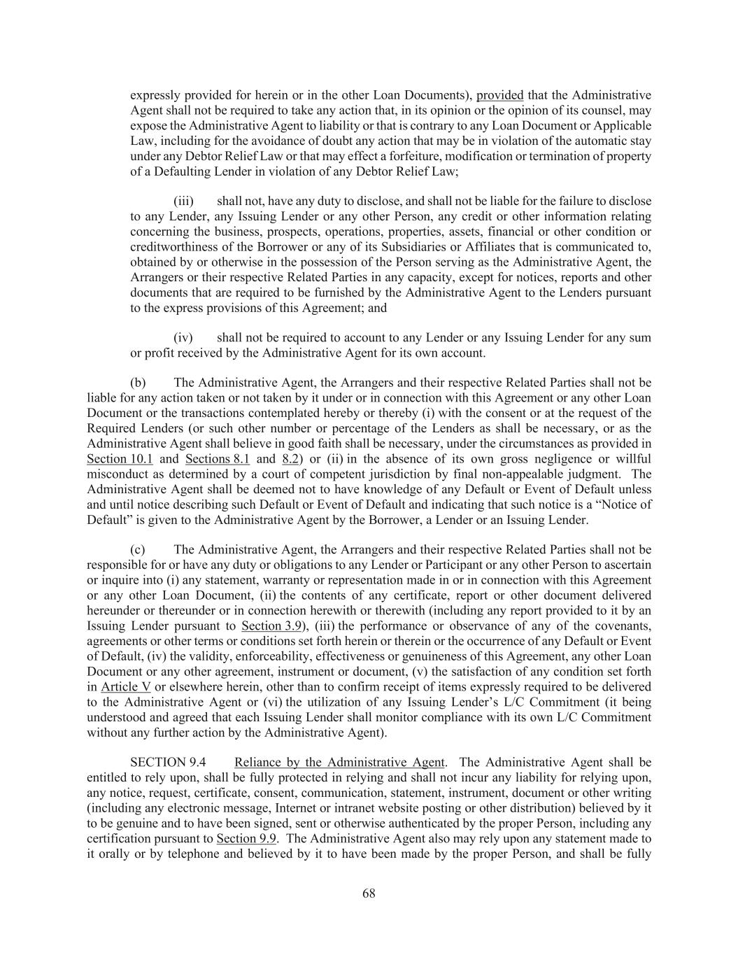 68 expressly provided for herein or in the other Loan Documents), provided that the Administrative Agent shall not be required to take any action that, in its opinion or the opinion of its counsel, may expose the Administrative Agent to liability or that is contrary to any Loan Document or Applicable Law, including for the avoidance of doubt any action that may be in violation of the automatic stay under any Debtor Relief Law or that may effect a forfeiture, modification or termination of property of a Defaulting Lender in violation of any Debtor Relief Law; (iii) shall not, have any duty to disclose, and shall not be liable for the failure to disclose to any Lender, any Issuing Lender or any other Person, any credit or other information relating concerning the business, prospects, operations, properties, assets, financial or other condition or creditworthiness of the Borrower or any of its Subsidiaries or Affiliates that is communicated to, obtained by or otherwise in the possession of the Person serving as the Administrative Agent, the Arrangers or their respective Related Parties in any capacity, except for notices, reports and other documents that are required to be furnished by the Administrative Agent to the Lenders pursuant to the express provisions of this Agreement; and (iv) shall not be required to account to any Lender or any Issuing Lender for any sum or profit received by the Administrative Agent for its own account. (b) The Administrative Agent, the Arrangers and their respective Related Parties shall not be liable for any action taken or not taken by it under or in connection with this Agreement or any other Loan Document or the transactions contemplated hereby or thereby (i) with the consent or at the request of the Required Lenders (or such other number or percentage of the Lenders as shall be necessary, or as the Administrative Agent shall believe in good faith shall be necessary, under the circumstances as provided in Section 10.1 and Sections 8.1 and 8.2) or (ii) in the absence of its own gross negligence or willful misconduct as determined by a court of competent jurisdiction by final non-appealable judgment. The Administrative Agent shall be deemed not to have knowledge of any Default or Event of Default unless and until notice describing such Default or Event of Default and indicating that such notice is a “Notice of Default” is given to the Administrative Agent by the Borrower, a Lender or an Issuing Lender. (c) The Administrative Agent, the Arrangers and their respective Related Parties shall not be responsible for or have any duty or obligations to any Lender or Participant or any other Person to ascertain or inquire into (i) any statement, warranty or representation made in or in connection with this Agreement or any other Loan Document, (ii) the contents of any certificate, report or other document delivered hereunder or thereunder or in connection herewith or therewith (including any report provided to it by an Issuing Lender pursuant to Section 3.9), (iii) the performance or observance of any of the covenants, agreements or other terms or conditions set forth herein or therein or the occurrence of any Default or Event of Default, (iv) the validity, enforceability, effectiveness or genuineness of this Agreement, any other Loan Document or any other agreement, instrument or document, (v) the satisfaction of any condition set forth in Article V or elsewhere herein, other than to confirm receipt of items expressly required to be delivered to the Administrative Agent or (vi) the utilization of any Issuing Lender’s L/C Commitment (it being understood and agreed that each Issuing Lender shall monitor compliance with its own L/C Commitment without any further action by the Administrative Agent). SECTION 9.4 Reliance by the Administrative Agent. The Administrative Agent shall be entitled to rely upon, shall be fully protected in relying and shall not incur any liability for relying upon, any notice, request, certificate, consent, communication, statement, instrument, document or other writing (including any electronic message, Internet or intranet website posting or other distribution) believed by it to be genuine and to have been signed, sent or otherwise authenticated by the proper Person, including any certification pursuant to Section 9.9. The Administrative Agent also may rely upon any statement made to it orally or by telephone and believed by it to have been made by the proper Person, and shall be fully