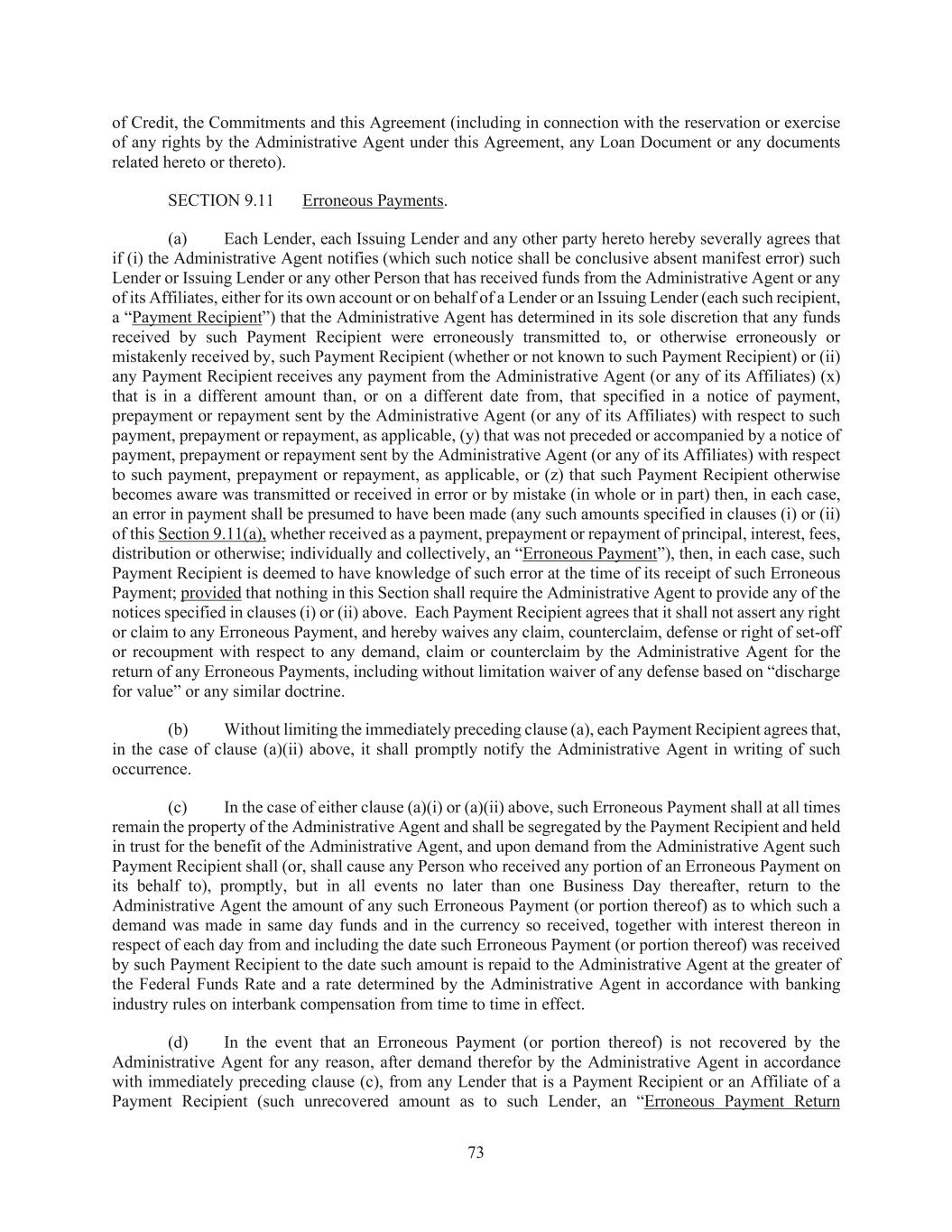 73 of Credit, the Commitments and this Agreement (including in connection with the reservation or exercise of any rights by the Administrative Agent under this Agreement, any Loan Document or any documents related hereto or thereto). SECTION 9.11 Erroneous Payments. (a) Each Lender, each Issuing Lender and any other party hereto hereby severally agrees that if (i) the Administrative Agent notifies (which such notice shall be conclusive absent manifest error) such Lender or Issuing Lender or any other Person that has received funds from the Administrative Agent or any of its Affiliates, either for its own account or on behalf of a Lender or an Issuing Lender (each such recipient, a “Payment Recipient”) that the Administrative Agent has determined in its sole discretion that any funds received by such Payment Recipient were erroneously transmitted to, or otherwise erroneously or mistakenly received by, such Payment Recipient (whether or not known to such Payment Recipient) or (ii) any Payment Recipient receives any payment from the Administrative Agent (or any of its Affiliates) (x) that is in a different amount than, or on a different date from, that specified in a notice of payment, prepayment or repayment sent by the Administrative Agent (or any of its Affiliates) with respect to such payment, prepayment or repayment, as applicable, (y) that was not preceded or accompanied by a notice of payment, prepayment or repayment sent by the Administrative Agent (or any of its Affiliates) with respect to such payment, prepayment or repayment, as applicable, or (z) that such Payment Recipient otherwise becomes aware was transmitted or received in error or by mistake (in whole or in part) then, in each case, an error in payment shall be presumed to have been made (any such amounts specified in clauses (i) or (ii) of this Section 9.11(a), whether received as a payment, prepayment or repayment of principal, interest, fees, distribution or otherwise; individually and collectively, an “Erroneous Payment”), then, in each case, such Payment Recipient is deemed to have knowledge of such error at the time of its receipt of such Erroneous Payment; provided that nothing in this Section shall require the Administrative Agent to provide any of the notices specified in clauses (i) or (ii) above. Each Payment Recipient agrees that it shall not assert any right or claim to any Erroneous Payment, and hereby waives any claim, counterclaim, defense or right of set-off or recoupment with respect to any demand, claim or counterclaim by the Administrative Agent for the return of any Erroneous Payments, including without limitation waiver of any defense based on “discharge for value” or any similar doctrine. (b) Without limiting the immediately preceding clause (a), each Payment Recipient agrees that, in the case of clause (a)(ii) above, it shall promptly notify the Administrative Agent in writing of such occurrence. (c) In the case of either clause (a)(i) or (a)(ii) above, such Erroneous Payment shall at all times remain the property of the Administrative Agent and shall be segregated by the Payment Recipient and held in trust for the benefit of the Administrative Agent, and upon demand from the Administrative Agent such Payment Recipient shall (or, shall cause any Person who received any portion of an Erroneous Payment on its behalf to), promptly, but in all events no later than one Business Day thereafter, return to the Administrative Agent the amount of any such Erroneous Payment (or portion thereof) as to which such a demand was made in same day funds and in the currency so received, together with interest thereon in respect of each day from and including the date such Erroneous Payment (or portion thereof) was received by such Payment Recipient to the date such amount is repaid to the Administrative Agent at the greater of the Federal Funds Rate and a rate determined by the Administrative Agent in accordance with banking industry rules on interbank compensation from time to time in effect. (d) In the event that an Erroneous Payment (or portion thereof) is not recovered by the Administrative Agent for any reason, after demand therefor by the Administrative Agent in accordance with immediately preceding clause (c), from any Lender that is a Payment Recipient or an Affiliate of a Payment Recipient (such unrecovered amount as to such Lender, an “Erroneous Payment Return
