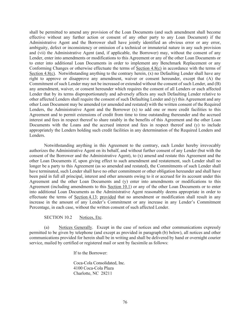 76 shall be permitted to amend any provision of the Loan Documents (and such amendment shall become effective without any further action or consent of any other party to any Loan Document) if the Administrative Agent and the Borrower shall have jointly identified an obvious error or any error, ambiguity, defect or inconsistency or omission of a technical or immaterial nature in any such provision and (vii) the Administrative Agent (and, if applicable, the Borrower) may, without the consent of any Lender, enter into amendments or modifications to this Agreement or any of the other Loan Documents or to enter into additional Loan Documents in order to implement any Benchmark Replacement or any Conforming Changes or otherwise effectuate the terms of Section 4.8(c) in accordance with the terms of Section 4.8(c). Notwithstanding anything to the contrary herein, (x) no Defaulting Lender shall have any right to approve or disapprove any amendment, waiver or consent hereunder, except that (A) the Commitment of such Lender may not be increased or extended without the consent of such Lender, and (B) any amendment, waiver, or consent hereunder which requires the consent of all Lenders or each affected Lender that by its terms disproportionately and adversely affects any such Defaulting Lender relative to other affected Lenders shall require the consent of such Defaulting Lender and (y) this Agreement and any other Loan Document may be amended (or amended and restated) with the written consent of the Required Lenders, the Administrative Agent and the Borrower (x) to add one or more credit facilities to this Agreement and to permit extensions of credit from time to time outstanding thereunder and the accrued interest and fees in respect thereof to share ratably in the benefits of this Agreement and the other Loan Documents with the Loans and the accrued interest and fees in respect thereof and (y) to include appropriately the Lenders holding such credit facilities in any determination of the Required Lenders and Lenders. Notwithstanding anything in this Agreement to the contrary, each Lender hereby irrevocably authorizes the Administrative Agent on its behalf, and without further consent of any Lender (but with the consent of the Borrower and the Administrative Agent), to (x) amend and restate this Agreement and the other Loan Documents if, upon giving effect to such amendment and restatement, such Lender shall no longer be a party to this Agreement (as so amended and restated), the Commitments of such Lender shall have terminated, such Lender shall have no other commitment or other obligation hereunder and shall have been paid in full all principal, interest and other amounts owing to it or accrued for its account under this Agreement and the other Loan Documents and (y) enter into amendments or modifications to this Agreement (including amendments to this Section 10.1) or any of the other Loan Documents or to enter into additional Loan Documents as the Administrative Agent reasonably deems appropriate in order to effectuate the terms of Section 4.13; provided that no amendment or modification shall result in any increase in the amount of any Lender’s Commitment or any increase in any Lender’s Commitment Percentage, in each case, without the written consent of such affected Lender. SECTION 10.2 Notices, Etc. (a) Notices Generally. Except in the case of notices and other communications expressly permitted to be given by telephone (and except as provided in paragraph (b) below), all notices and other communications provided for herein shall be in writing and shall be delivered by hand or overnight courier service, mailed by certified or registered mail or sent by facsimile as follows: If to the Borrower: Coca-Cola Consolidated, Inc. 4100 Coca-Cola Plaza Charlotte, NC 28211