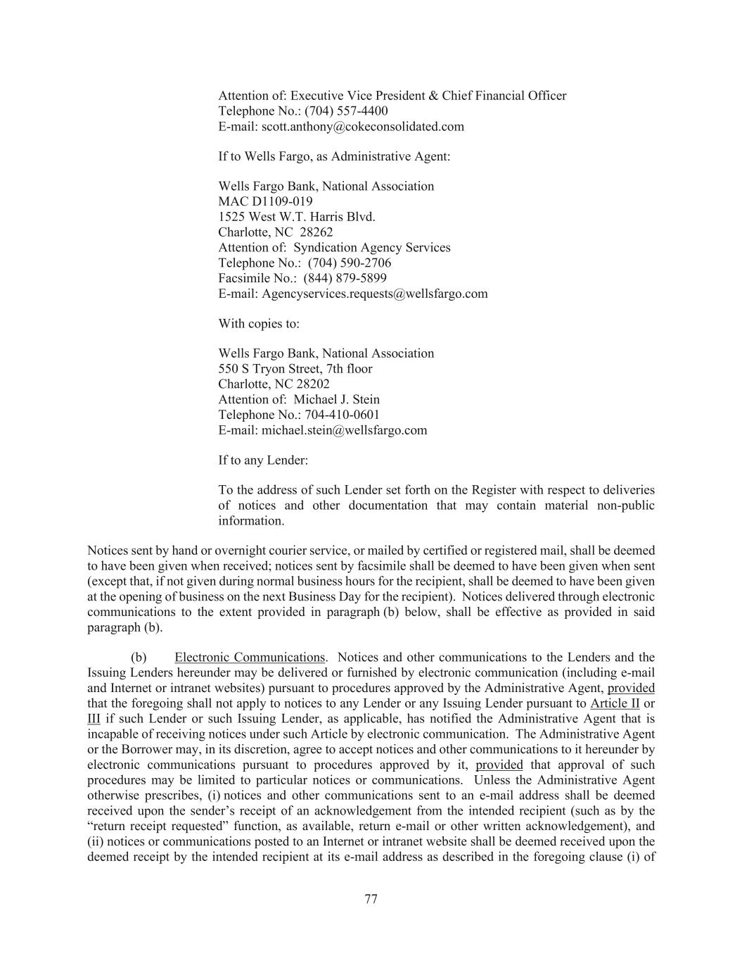 77 Attention of: Executive Vice President & Chief Financial Officer Telephone No.: (704) 557-4400 E-mail: scott.anthony@cokeconsolidated.com If to Wells Fargo, as Administrative Agent: Wells Fargo Bank, National Association MAC D1109-019 1525 West W.T. Harris Blvd. Charlotte, NC 28262 Attention of: Syndication Agency Services Telephone No.: (704) 590-2706 Facsimile No.: (844) 879-5899 E-mail: Agencyservices.requests@wellsfargo.com With copies to: Wells Fargo Bank, National Association 550 S Tryon Street, 7th floor Charlotte, NC 28202 Attention of: Michael J. Stein Telephone No.: 704-410-0601 E-mail: michael.stein@wellsfargo.com If to any Lender: To the address of such Lender set forth on the Register with respect to deliveries of notices and other documentation that may contain material non-public information. Notices sent by hand or overnight courier service, or mailed by certified or registered mail, shall be deemed to have been given when received; notices sent by facsimile shall be deemed to have been given when sent (except that, if not given during normal business hours for the recipient, shall be deemed to have been given at the opening of business on the next Business Day for the recipient). Notices delivered through electronic communications to the extent provided in paragraph (b) below, shall be effective as provided in said paragraph (b). (b) Electronic Communications. Notices and other communications to the Lenders and the Issuing Lenders hereunder may be delivered or furnished by electronic communication (including e-mail and Internet or intranet websites) pursuant to procedures approved by the Administrative Agent, provided that the foregoing shall not apply to notices to any Lender or any Issuing Lender pursuant to Article II or III if such Lender or such Issuing Lender, as applicable, has notified the Administrative Agent that is incapable of receiving notices under such Article by electronic communication. The Administrative Agent or the Borrower may, in its discretion, agree to accept notices and other communications to it hereunder by electronic communications pursuant to procedures approved by it, provided that approval of such procedures may be limited to particular notices or communications. Unless the Administrative Agent otherwise prescribes, (i) notices and other communications sent to an e-mail address shall be deemed received upon the sender’s receipt of an acknowledgement from the intended recipient (such as by the “return receipt requested” function, as available, return e-mail or other written acknowledgement), and (ii) notices or communications posted to an Internet or intranet website shall be deemed received upon the deemed receipt by the intended recipient at its e-mail address as described in the foregoing clause (i) of