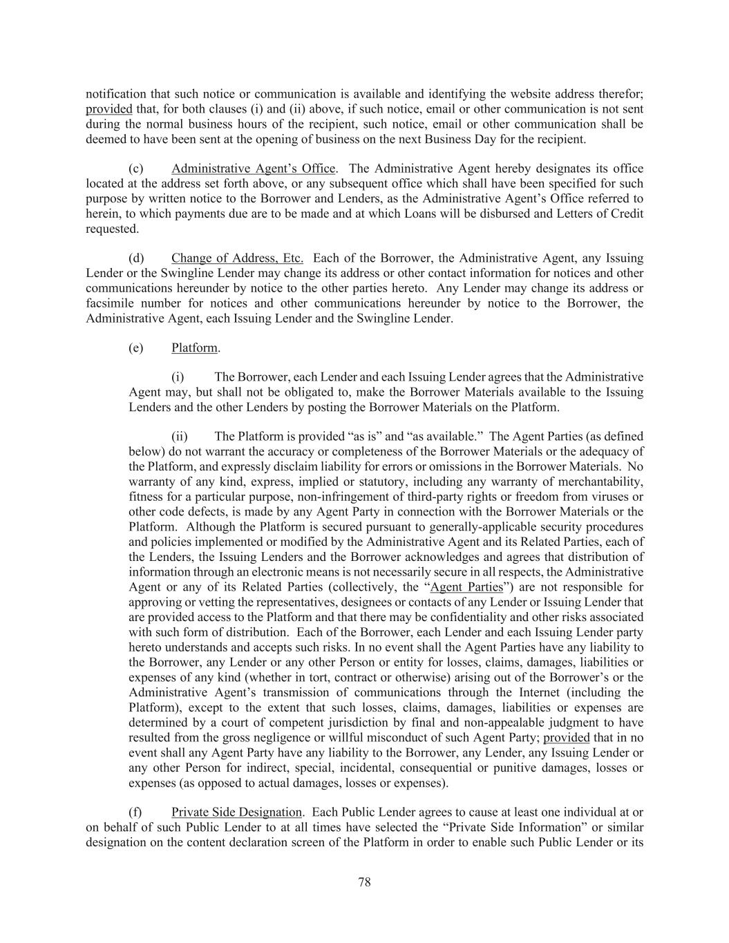 78 notification that such notice or communication is available and identifying the website address therefor; provided that, for both clauses (i) and (ii) above, if such notice, email or other communication is not sent during the normal business hours of the recipient, such notice, email or other communication shall be deemed to have been sent at the opening of business on the next Business Day for the recipient. (c) Administrative Agent’s Office. The Administrative Agent hereby designates its office located at the address set forth above, or any subsequent office which shall have been specified for such purpose by written notice to the Borrower and Lenders, as the Administrative Agent’s Office referred to herein, to which payments due are to be made and at which Loans will be disbursed and Letters of Credit requested. (d) Change of Address, Etc. Each of the Borrower, the Administrative Agent, any Issuing Lender or the Swingline Lender may change its address or other contact information for notices and other communications hereunder by notice to the other parties hereto. Any Lender may change its address or facsimile number for notices and other communications hereunder by notice to the Borrower, the Administrative Agent, each Issuing Lender and the Swingline Lender. (e) Platform. (i) The Borrower, each Lender and each Issuing Lender agrees that the Administrative Agent may, but shall not be obligated to, make the Borrower Materials available to the Issuing Lenders and the other Lenders by posting the Borrower Materials on the Platform. (ii) The Platform is provided “as is” and “as available.” The Agent Parties (as defined below) do not warrant the accuracy or completeness of the Borrower Materials or the adequacy of the Platform, and expressly disclaim liability for errors or omissions in the Borrower Materials. No warranty of any kind, express, implied or statutory, including any warranty of merchantability, fitness for a particular purpose, non-infringement of third-party rights or freedom from viruses or other code defects, is made by any Agent Party in connection with the Borrower Materials or the Platform. Although the Platform is secured pursuant to generally-applicable security procedures and policies implemented or modified by the Administrative Agent and its Related Parties, each of the Lenders, the Issuing Lenders and the Borrower acknowledges and agrees that distribution of information through an electronic means is not necessarily secure in all respects, the Administrative Agent or any of its Related Parties (collectively, the “Agent Parties”) are not responsible for approving or vetting the representatives, designees or contacts of any Lender or Issuing Lender that are provided access to the Platform and that there may be confidentiality and other risks associated with such form of distribution. Each of the Borrower, each Lender and each Issuing Lender party hereto understands and accepts such risks. In no event shall the Agent Parties have any liability to the Borrower, any Lender or any other Person or entity for losses, claims, damages, liabilities or expenses of any kind (whether in tort, contract or otherwise) arising out of the Borrower’s or the Administrative Agent’s transmission of communications through the Internet (including the Platform), except to the extent that such losses, claims, damages, liabilities or expenses are determined by a court of competent jurisdiction by final and non-appealable judgment to have resulted from the gross negligence or willful misconduct of such Agent Party; provided that in no event shall any Agent Party have any liability to the Borrower, any Lender, any Issuing Lender or any other Person for indirect, special, incidental, consequential or punitive damages, losses or expenses (as opposed to actual damages, losses or expenses). (f) Private Side Designation. Each Public Lender agrees to cause at least one individual at or on behalf of such Public Lender to at all times have selected the “Private Side Information” or similar designation on the content declaration screen of the Platform in order to enable such Public Lender or its