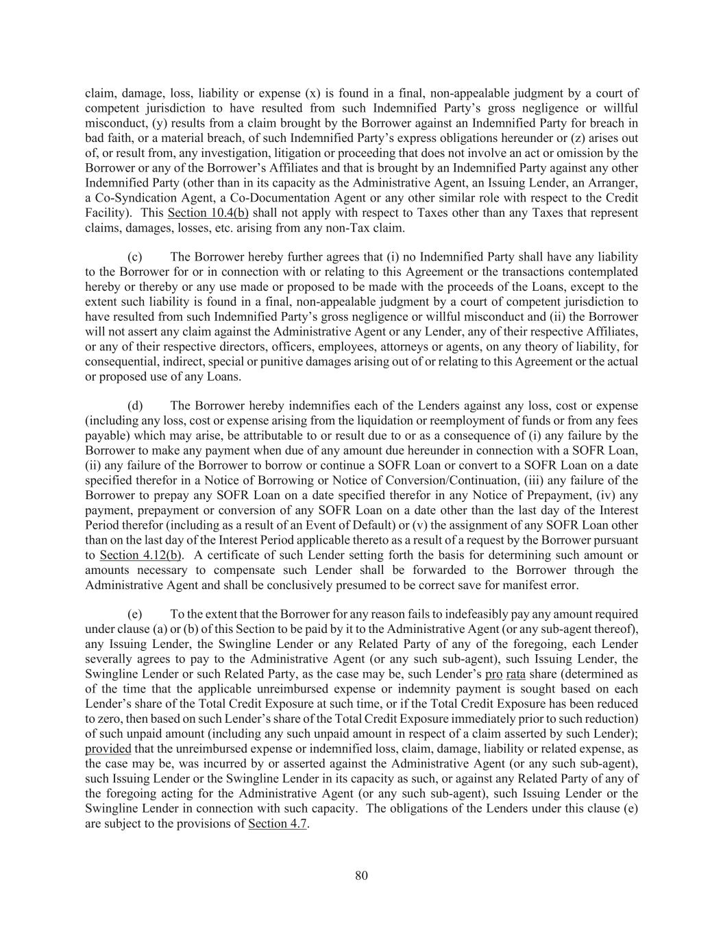 80 claim, damage, loss, liability or expense (x) is found in a final, non-appealable judgment by a court of competent jurisdiction to have resulted from such Indemnified Party’s gross negligence or willful misconduct, (y) results from a claim brought by the Borrower against an Indemnified Party for breach in bad faith, or a material breach, of such Indemnified Party’s express obligations hereunder or (z) arises out of, or result from, any investigation, litigation or proceeding that does not involve an act or omission by the Borrower or any of the Borrower’s Affiliates and that is brought by an Indemnified Party against any other Indemnified Party (other than in its capacity as the Administrative Agent, an Issuing Lender, an Arranger, a Co-Syndication Agent, a Co-Documentation Agent or any other similar role with respect to the Credit Facility). This Section 10.4(b) shall not apply with respect to Taxes other than any Taxes that represent claims, damages, losses, etc. arising from any non-Tax claim. (c) The Borrower hereby further agrees that (i) no Indemnified Party shall have any liability to the Borrower for or in connection with or relating to this Agreement or the transactions contemplated hereby or thereby or any use made or proposed to be made with the proceeds of the Loans, except to the extent such liability is found in a final, non-appealable judgment by a court of competent jurisdiction to have resulted from such Indemnified Party’s gross negligence or willful misconduct and (ii) the Borrower will not assert any claim against the Administrative Agent or any Lender, any of their respective Affiliates, or any of their respective directors, officers, employees, attorneys or agents, on any theory of liability, for consequential, indirect, special or punitive damages arising out of or relating to this Agreement or the actual or proposed use of any Loans. (d) The Borrower hereby indemnifies each of the Lenders against any loss, cost or expense (including any loss, cost or expense arising from the liquidation or reemployment of funds or from any fees payable) which may arise, be attributable to or result due to or as a consequence of (i) any failure by the Borrower to make any payment when due of any amount due hereunder in connection with a SOFR Loan, (ii) any failure of the Borrower to borrow or continue a SOFR Loan or convert to a SOFR Loan on a date specified therefor in a Notice of Borrowing or Notice of Conversion/Continuation, (iii) any failure of the Borrower to prepay any SOFR Loan on a date specified therefor in any Notice of Prepayment, (iv) any payment, prepayment or conversion of any SOFR Loan on a date other than the last day of the Interest Period therefor (including as a result of an Event of Default) or (v) the assignment of any SOFR Loan other than on the last day of the Interest Period applicable thereto as a result of a request by the Borrower pursuant to Section 4.12(b). A certificate of such Lender setting forth the basis for determining such amount or amounts necessary to compensate such Lender shall be forwarded to the Borrower through the Administrative Agent and shall be conclusively presumed to be correct save for manifest error. (e) To the extent that the Borrower for any reason fails to indefeasibly pay any amount required under clause (a) or (b) of this Section to be paid by it to the Administrative Agent (or any sub-agent thereof), any Issuing Lender, the Swingline Lender or any Related Party of any of the foregoing, each Lender severally agrees to pay to the Administrative Agent (or any such sub-agent), such Issuing Lender, the Swingline Lender or such Related Party, as the case may be, such Lender’s pro rata share (determined as of the time that the applicable unreimbursed expense or indemnity payment is sought based on each Lender’s share of the Total Credit Exposure at such time, or if the Total Credit Exposure has been reduced to zero, then based on such Lender’s share of the Total Credit Exposure immediately prior to such reduction) of such unpaid amount (including any such unpaid amount in respect of a claim asserted by such Lender); provided that the unreimbursed expense or indemnified loss, claim, damage, liability or related expense, as the case may be, was incurred by or asserted against the Administrative Agent (or any such sub-agent), such Issuing Lender or the Swingline Lender in its capacity as such, or against any Related Party of any of the foregoing acting for the Administrative Agent (or any such sub-agent), such Issuing Lender or the Swingline Lender in connection with such capacity. The obligations of the Lenders under this clause (e) are subject to the provisions of Section 4.7.