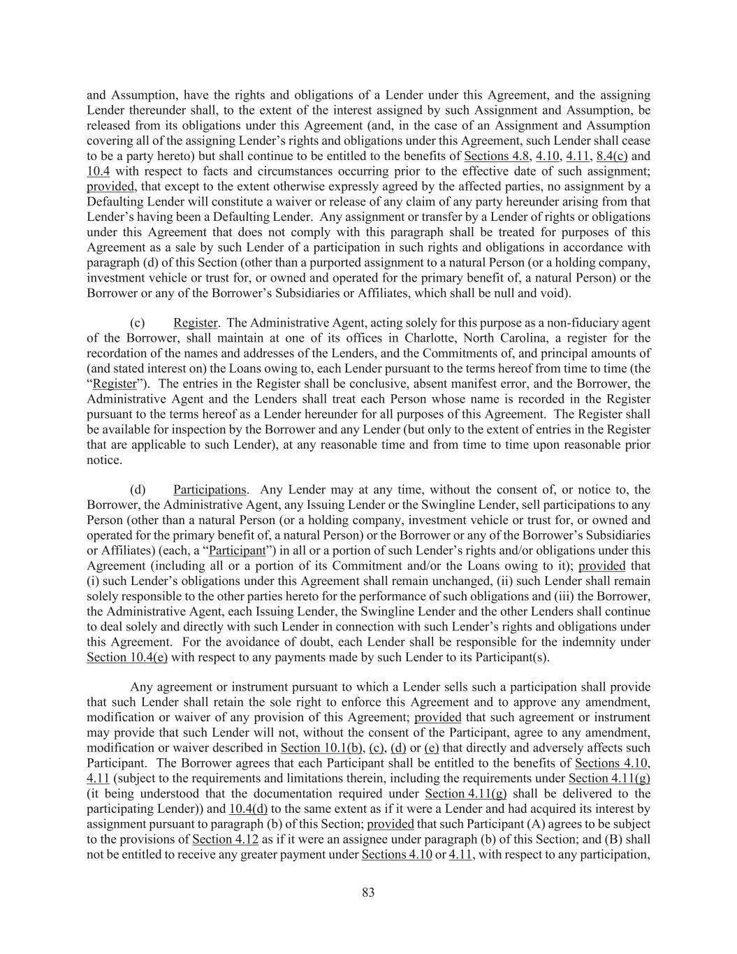 83 and Assumption, have the rights and obligations of a Lender under this Agreement, and the assigning Lender thereunder shall, to the extent of the interest assigned by such Assignment and Assumption, be released from its obligations under this Agreement (and, in the case of an Assignment and Assumption covering all of the assigning Lender’s rights and obligations under this Agreement, such Lender shall cease to be a party hereto) but shall continue to be entitled to the benefits of Sections 4.8, 4.10, 4.11, 8.4(c) and 10.4 with respect to facts and circumstances occurring prior to the effective date of such assignment; provided, that except to the extent otherwise expressly agreed by the affected parties, no assignment by a Defaulting Lender will constitute a waiver or release of any claim of any party hereunder arising from that Lender’s having been a Defaulting Lender. Any assignment or transfer by a Lender of rights or obligations under this Agreement that does not comply with this paragraph shall be treated for purposes of this Agreement as a sale by such Lender of a participation in such rights and obligations in accordance with paragraph (d) of this Section (other than a purported assignment to a natural Person (or a holding company, investment vehicle or trust for, or owned and operated for the primary benefit of, a natural Person) or the Borrower or any of the Borrower’s Subsidiaries or Affiliates, which shall be null and void). (c) Register. The Administrative Agent, acting solely for this purpose as a non-fiduciary agent of the Borrower, shall maintain at one of its offices in Charlotte, North Carolina, a register for the recordation of the names and addresses of the Lenders, and the Commitments of, and principal amounts of (and stated interest on) the Loans owing to, each Lender pursuant to the terms hereof from time to time (the “Register”). The entries in the Register shall be conclusive, absent manifest error, and the Borrower, the Administrative Agent and the Lenders shall treat each Person whose name is recorded in the Register pursuant to the terms hereof as a Lender hereunder for all purposes of this Agreement. The Register shall be available for inspection by the Borrower and any Lender (but only to the extent of entries in the Register that are applicable to such Lender), at any reasonable time and from time to time upon reasonable prior notice. (d) Participations. Any Lender may at any time, without the consent of, or notice to, the Borrower, the Administrative Agent, any Issuing Lender or the Swingline Lender, sell participations to any Person (other than a natural Person (or a holding company, investment vehicle or trust for, or owned and operated for the primary benefit of, a natural Person) or the Borrower or any of the Borrower’s Subsidiaries or Affiliates) (each, a “Participant”) in all or a portion of such Lender’s rights and/or obligations under this Agreement (including all or a portion of its Commitment and/or the Loans owing to it); provided that (i) such Lender’s obligations under this Agreement shall remain unchanged, (ii) such Lender shall remain solely responsible to the other parties hereto for the performance of such obligations and (iii) the Borrower, the Administrative Agent, each Issuing Lender, the Swingline Lender and the other Lenders shall continue to deal solely and directly with such Lender in connection with such Lender’s rights and obligations under this Agreement. For the avoidance of doubt, each Lender shall be responsible for the indemnity under Section 10.4(e) with respect to any payments made by such Lender to its Participant(s). Any agreement or instrument pursuant to which a Lender sells such a participation shall provide that such Lender shall retain the sole right to enforce this Agreement and to approve any amendment, modification or waiver of any provision of this Agreement; provided that such agreement or instrument may provide that such Lender will not, without the consent of the Participant, agree to any amendment, modification or waiver described in Section 10.1(b), (c), (d) or (e) that directly and adversely affects such Participant. The Borrower agrees that each Participant shall be entitled to the benefits of Sections 4.10, 4.11 (subject to the requirements and limitations therein, including the requirements under Section 4.11(g) (it being understood that the documentation required under Section 4.11(g) shall be delivered to the participating Lender)) and 10.4(d) to the same extent as if it were a Lender and had acquired its interest by assignment pursuant to paragraph (b) of this Section; provided that such Participant (A) agrees to be subject to the provisions of Section 4.12 as if it were an assignee under paragraph (b) of this Section; and (B) shall not be entitled to receive any greater payment under Sections 4.10 or 4.11, with respect to any participation,