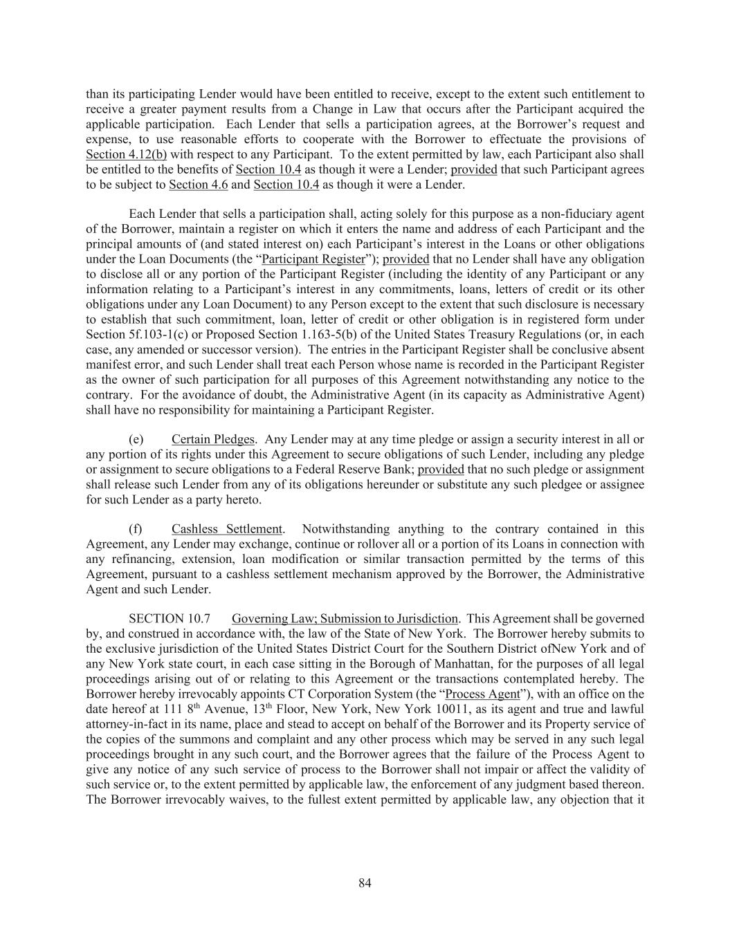 84 than its participating Lender would have been entitled to receive, except to the extent such entitlement to receive a greater payment results from a Change in Law that occurs after the Participant acquired the applicable participation. Each Lender that sells a participation agrees, at the Borrower’s request and expense, to use reasonable efforts to cooperate with the Borrower to effectuate the provisions of Section 4.12(b) with respect to any Participant. To the extent permitted by law, each Participant also shall be entitled to the benefits of Section 10.4 as though it were a Lender; provided that such Participant agrees to be subject to Section 4.6 and Section 10.4 as though it were a Lender. Each Lender that sells a participation shall, acting solely for this purpose as a non-fiduciary agent of the Borrower, maintain a register on which it enters the name and address of each Participant and the principal amounts of (and stated interest on) each Participant’s interest in the Loans or other obligations under the Loan Documents (the “Participant Register”); provided that no Lender shall have any obligation to disclose all or any portion of the Participant Register (including the identity of any Participant or any information relating to a Participant’s interest in any commitments, loans, letters of credit or its other obligations under any Loan Document) to any Person except to the extent that such disclosure is necessary to establish that such commitment, loan, letter of credit or other obligation is in registered form under Section 5f.103-1(c) or Proposed Section 1.163-5(b) of the United States Treasury Regulations (or, in each case, any amended or successor version). The entries in the Participant Register shall be conclusive absent manifest error, and such Lender shall treat each Person whose name is recorded in the Participant Register as the owner of such participation for all purposes of this Agreement notwithstanding any notice to the contrary. For the avoidance of doubt, the Administrative Agent (in its capacity as Administrative Agent) shall have no responsibility for maintaining a Participant Register. (e) Certain Pledges. Any Lender may at any time pledge or assign a security interest in all or any portion of its rights under this Agreement to secure obligations of such Lender, including any pledge or assignment to secure obligations to a Federal Reserve Bank; provided that no such pledge or assignment shall release such Lender from any of its obligations hereunder or substitute any such pledgee or assignee for such Lender as a party hereto. (f) Cashless Settlement. Notwithstanding anything to the contrary contained in this Agreement, any Lender may exchange, continue or rollover all or a portion of its Loans in connection with any refinancing, extension, loan modification or similar transaction permitted by the terms of this Agreement, pursuant to a cashless settlement mechanism approved by the Borrower, the Administrative Agent and such Lender. SECTION 10.7 Governing Law; Submission to Jurisdiction. This Agreement shall be governed by, and construed in accordance with, the law of the State of New York. The Borrower hereby submits to the exclusive jurisdiction of the United States District Court for the Southern District of New York and of any New York state court, in each case sitting in the Borough of Manhattan, for the purposes of all legal proceedings arising out of or relating to this Agreement or the transactions contemplated hereby. The Borrower hereby irrevocably appoints CT Corporation System (the “Process Agent”), with an office on the date hereof at 111 8th Avenue, 13th Floor, New York, New York 10011, as its agent and true and lawful attorney-in-fact in its name, place and stead to accept on behalf of the Borrower and its Property service of the copies of the summons and complaint and any other process which may be served in any such legal proceedings brought in any such court, and the Borrower agrees that the failure of the Process Agent to give any notice of any such service of process to the Borrower shall not impair or affect the validity of such service or, to the extent permitted by applicable law, the enforcement of any judgment based thereon. The Borrower irrevocably waives, to the fullest extent permitted by applicable law, any objection that it