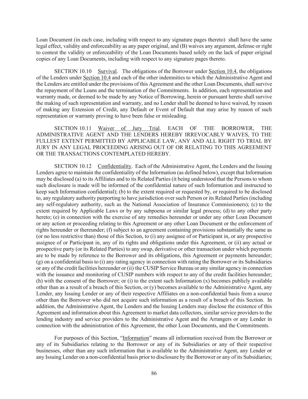 86 Loan Document (in each case, including with respect to any signature pages thereto) shall have the same legal effect, validity and enforceability as any paper original, and (B) waives any argument, defense or right to contest the validity or enforceability of the Loan Documents based solely on the lack of paper original copies of any Loan Documents, including with respect to any signature pages thereto. SECTION 10.10 Survival. The obligations of the Borrower under Section 10.4, the obligations of the Lenders under Section 10.4 and each of the other indemnities to which the Administrative Agent and the Lenders are entitled under the provisions of this Agreement and the other Loan Documents, shall survive the repayment of the Loans and the termination of the Commitments. In addition, each representation and warranty made, or deemed to be made by any Notice of Borrowing, herein or pursuant hereto shall survive the making of such representation and warranty, and no Lender shall be deemed to have waived, by reason of making any Extension of Credit, any Default or Event of Default that may arise by reason of such representation or warranty proving to have been false or misleading. SECTION 10.11 Waiver of Jury Trial. EACH OF THE BORROWER, THE ADMINISTRATIVE AGENT AND THE LENDERS HEREBY IRREVOCABLY WAIVES, TO THE FULLEST EXTENT PERMITTED BY APPLICABLE LAW, ANY AND ALL RIGHT TO TRIAL BY JURY IN ANY LEGAL PROCEEDING ARISING OUT OF OR RELATING TO THIS AGREEMENT OR THE TRANSACTIONS CONTEMPLATED HEREBY. SECTION 10.12 Confidentiality. Each of the Administrative Agent, the Lenders and the Issuing Lenders agree to maintain the confidentiality of the Information (as defined below), except that Information may be disclosed (a) to its Affiliates and to its Related Parties (it being understood that the Persons to whom such disclosure is made will be informed of the confidential nature of such Information and instructed to keep such Information confidential); (b) to the extent required or requested by, or required to be disclosed to, any regulatory authority purporting to have jurisdiction over such Person or its Related Parties (including any self-regulatory authority, such as the National Association of Insurance Commissioners); (c) to the extent required by Applicable Laws or by any subpoena or similar legal process; (d) to any other party hereto; (e) in connection with the exercise of any remedies hereunder or under any other Loan Document or any action or proceeding relating to this Agreement or any other Loan Document or the enforcement of rights hereunder or thereunder; (f) subject to an agreement containing provisions substantially the same as (or no less restrictive than) those of this Section, to (i) any assignee of or Participant in, or any prospective assignee of or Participant in, any of its rights and obligations under this Agreement, or (ii) any actual or prospective party (or its Related Parties) to any swap, derivative or other transaction under which payments are to be made by reference to the Borrower and its obligations, this Agreement or payments hereunder; (g) on a confidential basis to (i) any rating agency in connection with rating the Borrower or its Subsidiaries or any of the credit facilities hereunder or (ii) the CUSIP Service Bureau or any similar agency in connection with the issuance and monitoring of CUSIP numbers with respect to any of the credit facilities hereunder; (h) with the consent of the Borrower; or (i) to the extent such Information (x) becomes publicly available other than as a result of a breach of this Section, or (y) becomes available to the Administrative Agent, any Lender, any Issuing Lender or any of their respective Affiliates on a non-confidential basis from a source other than the Borrower who did not acquire such information as a result of a breach of this Section. In addition, the Administrative Agent, the Lenders and the Issuing Lenders may disclose the existence of this Agreement and information about this Agreement to market data collectors, similar service providers to the lending industry and service providers to the Administrative Agent and the Arrangers or any Lender in connection with the administration of this Agreement, the other Loan Documents, and the Commitments. For purposes of this Section, “Information” means all information received from the Borrower or any of its Subsidiaries relating to the Borrower or any of its Subsidiaries or any of their respective businesses, other than any such information that is available to the Administrative Agent, any Lender or any Issuing Lender on a non-confidential basis prior to disclosure by the Borrower or any of its Subsidiaries;
