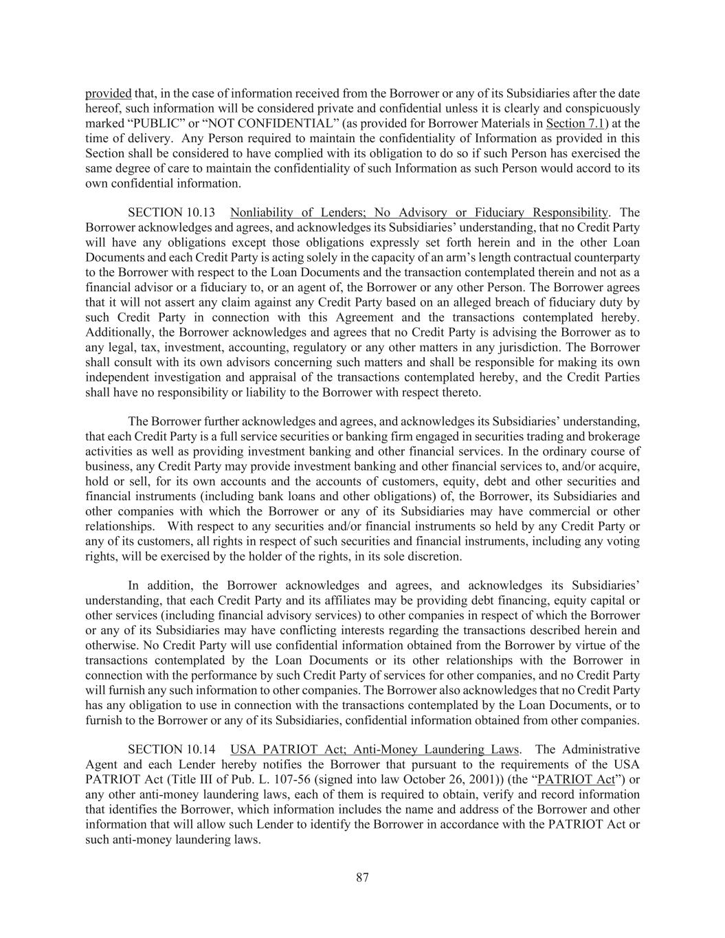 87 provided that, in the case of information received from the Borrower or any of its Subsidiaries after the date hereof, such information will be considered private and confidential unless it is clearly and conspicuously marked “PUBLIC” or “NOT CONFIDENTIAL” (as provided for Borrower Materials in Section 7.1) at the time of delivery. Any Person required to maintain the confidentiality of Information as provided in this Section shall be considered to have complied with its obligation to do so if such Person has exercised the same degree of care to maintain the confidentiality of such Information as such Person would accord to its own confidential information. SECTION 10.13 Nonliability of Lenders; No Advisory or Fiduciary Responsibility. The Borrower acknowledges and agrees, and acknowledges its Subsidiaries’ understanding, that no Credit Party will have any obligations except those obligations expressly set forth herein and in the other Loan Documents and each Credit Party is acting solely in the capacity of an arm’s length contractual counterparty to the Borrower with respect to the Loan Documents and the transaction contemplated therein and not as a financial advisor or a fiduciary to, or an agent of, the Borrower or any other Person. The Borrower agrees that it will not assert any claim against any Credit Party based on an alleged breach of fiduciary duty by such Credit Party in connection with this Agreement and the transactions contemplated hereby. Additionally, the Borrower acknowledges and agrees that no Credit Party is advising the Borrower as to any legal, tax, investment, accounting, regulatory or any other matters in any jurisdiction. The Borrower shall consult with its own advisors concerning such matters and shall be responsible for making its own independent investigation and appraisal of the transactions contemplated hereby, and the Credit Parties shall have no responsibility or liability to the Borrower with respect thereto. The Borrower further acknowledges and agrees, and acknowledges its Subsidiaries’ understanding, that each Credit Party is a full service securities or banking firm engaged in securities trading and brokerage activities as well as providing investment banking and other financial services. In the ordinary course of business, any Credit Party may provide investment banking and other financial services to, and/or acquire, hold or sell, for its own accounts and the accounts of customers, equity, debt and other securities and financial instruments (including bank loans and other obligations) of, the Borrower, its Subsidiaries and other companies with which the Borrower or any of its Subsidiaries may have commercial or other relationships. With respect to any securities and/or financial instruments so held by any Credit Party or any of its customers, all rights in respect of such securities and financial instruments, including any voting rights, will be exercised by the holder of the rights, in its sole discretion. In addition, the Borrower acknowledges and agrees, and acknowledges its Subsidiaries’ understanding, that each Credit Party and its affiliates may be providing debt financing, equity capital or other services (including financial advisory services) to other companies in respect of which the Borrower or any of its Subsidiaries may have conflicting interests regarding the transactions described herein and otherwise. No Credit Party will use confidential information obtained from the Borrower by virtue of the transactions contemplated by the Loan Documents or its other relationships with the Borrower in connection with the performance by such Credit Party of services for other companies, and no Credit Party will furnish any such information to other companies. The Borrower also acknowledges that no Credit Party has any obligation to use in connection with the transactions contemplated by the Loan Documents, or to furnish to the Borrower or any of its Subsidiaries, confidential information obtained from other companies. SECTION 10.14 USA PATRIOT Act; Anti-Money Laundering Laws. The Administrative Agent and each Lender hereby notifies the Borrower that pursuant to the requirements of the USA PATRIOT Act (Title III of Pub. L. 107-56 (signed into law October 26, 2001)) (the “PATRIOT Act”) or any other anti-money laundering laws, each of them is required to obtain, verify and record information that identifies the Borrower, which information includes the name and address of the Borrower and other information that will allow such Lender to identify the Borrower in accordance with the PATRIOT Act or such anti-money laundering laws.
