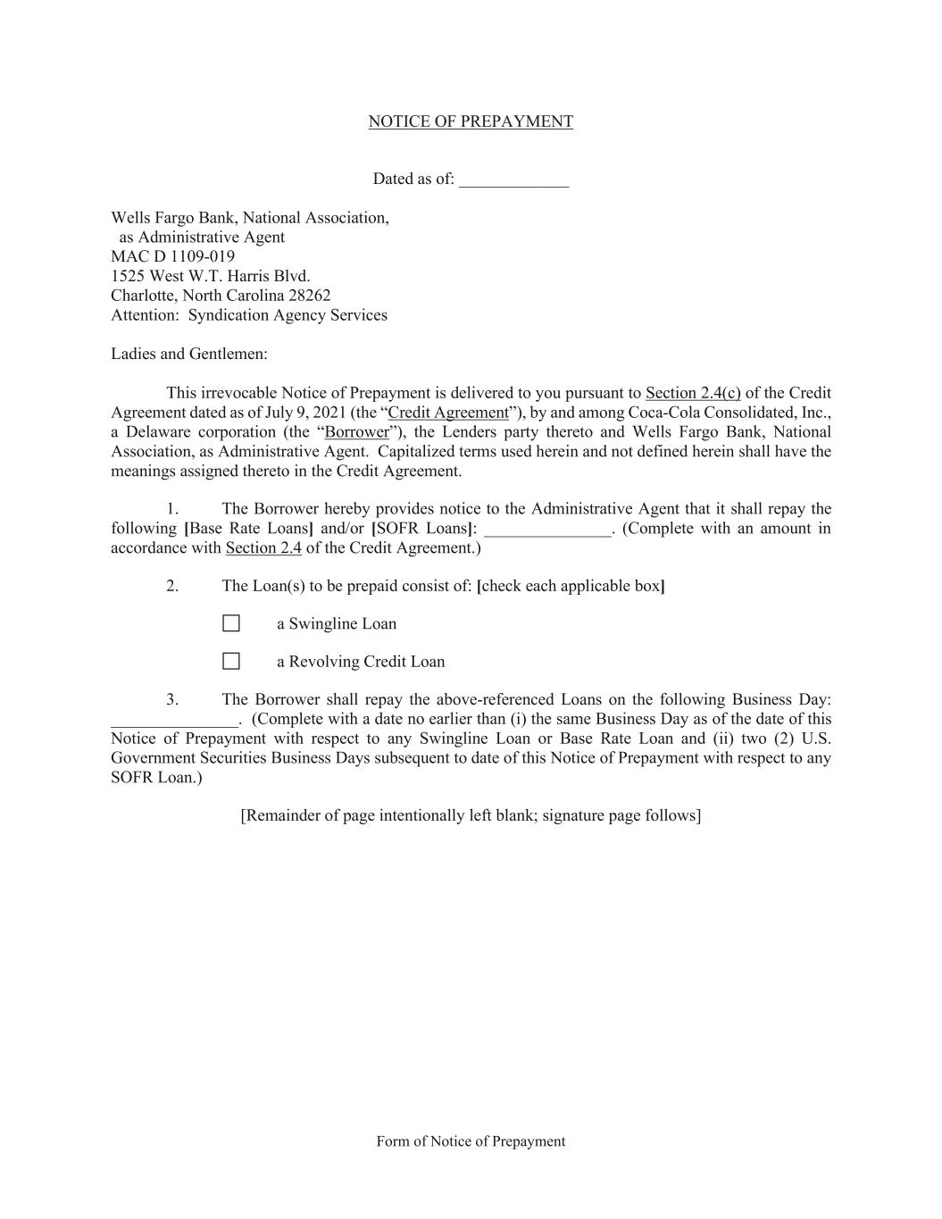 Form of Notice of Prepayment NOTICE OF PREPAYMENT Dated as of: _____________ Wells Fargo Bank, National Association, as Administrative Agent MAC D 1109-019 1525 West W.T. Harris Blvd. Charlotte, North Carolina 28262 Attention: Syndication Agency Services Ladies and Gentlemen: This irrevocable Notice of Prepayment is delivered to you pursuant to Section 2.4(c) of the Credit Agreement dated as of July 9, 2021 (the “Credit Agreement”), by and among Coca-Cola Consolidated, Inc., a Delaware corporation (the “Borrower”), the Lenders party thereto and Wells Fargo Bank, National Association, as Administrative Agent. Capitalized terms used herein and not defined herein shall have the meanings assigned thereto in the Credit Agreement. 1. The Borrower hereby provides notice to the Administrative Agent that it shall repay the following [Base Rate Loans] and/or [SOFR Loans]: _______________. (Complete with an amount in accordance with Section 2.4 of the Credit Agreement.) 2. The Loan(s) to be prepaid consist of: [check each applicable box] a Swingline Loan a Revolving Credit Loan 3. The Borrower shall repay the above-referenced Loans on the following Business Day: _______________. (Complete with a date no earlier than (i) the same Business Day as of the date of this Notice of Prepayment with respect to any Swingline Loan or Base Rate Loan and (ii) two (2) U.S. Government Securities Business Days subsequent to date of this Notice of Prepayment with respect to any SOFR Loan.) [Remainder of page intentionally left blank; signature page follows]