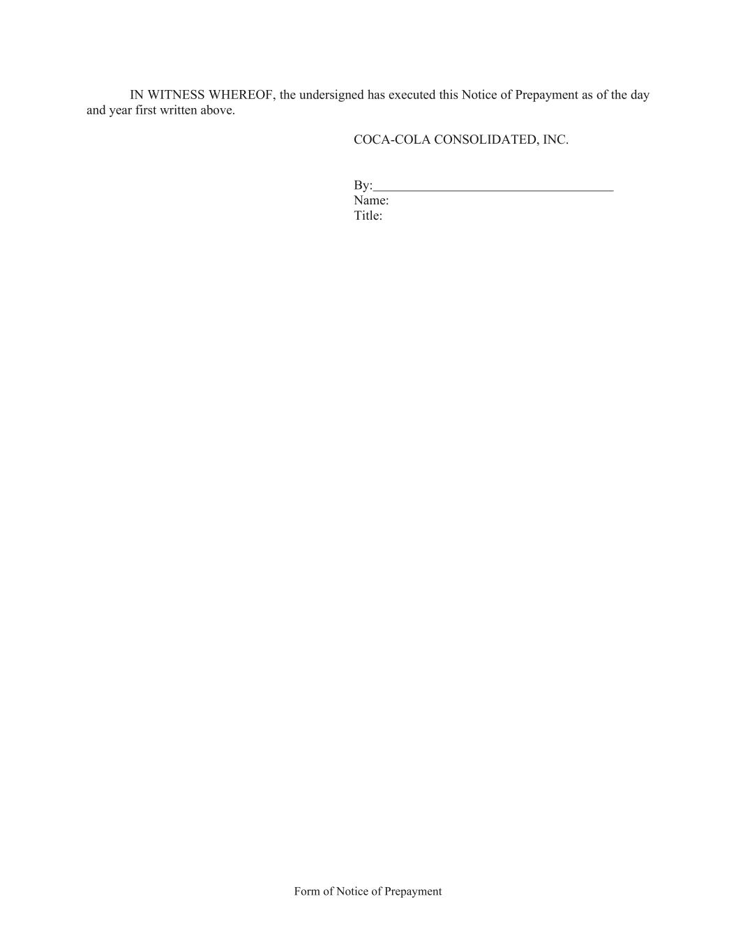 Form of Notice of Prepayment IN WITNESS WHEREOF, the undersigned has executed this Notice of Prepayment as of the day and year first written above. COCA-COLA CONSOLIDATED, INC. By: Name: Title: