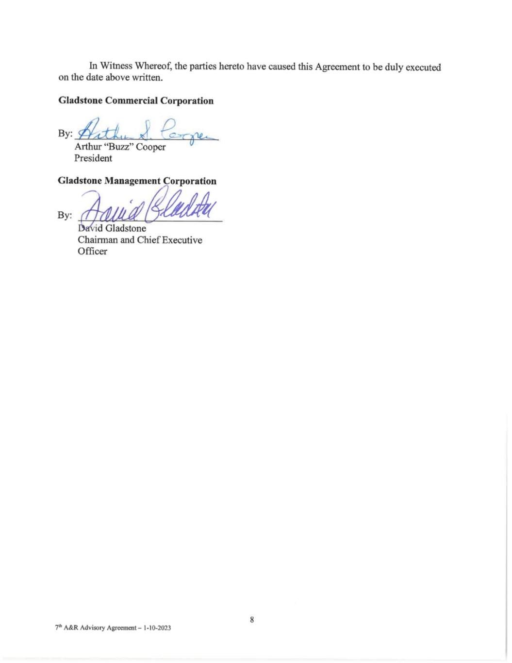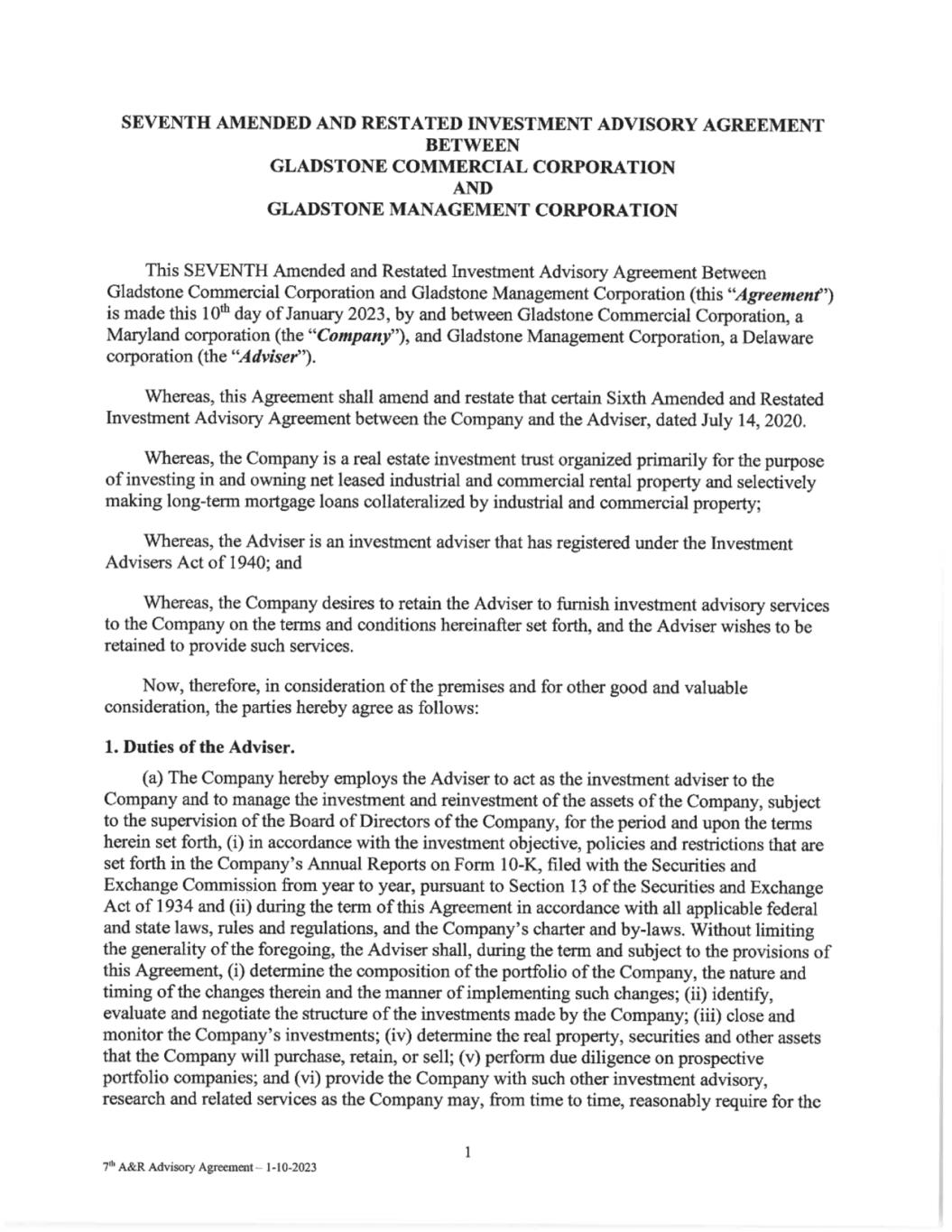 Pursuant to FINRA Rules 2310(b)(5) and 2231(c), Gladstone Commercial Corporation (the “Company”) determined the estimated value as of December 31, 2022, of its 6.00% Series F Cumulative Redeemable Preferred Stock (the “Series F Preferred Stock”), $25.00 stated value per share, with the assistance of a third-party valuation service. In particular, the third-party valuation service reviewed the amount resulting from the consolidated undepreciated book value of the Company’s assets less its contractual liabilities, divided by the number of shares of the Company’s Series E, F, and G Preferred Stock outstanding, all as reflected in the Company’s consolidated financial statements included in Item 8 of the Company’s Annual Report on Form 10-K for the year ended December 31, 2022 to which this exhibit is attached, which were prepared in conformity with accounting principles generally accepted in the United States of America. Based on this methodology and because the result from the calculation above is greater than the $25.00 per share stated value of the Company's Series F Preferred Stock, the Company has determined that the estimated value of its Series F Preferred Stock as of December 31, 2022, is $25.00 per share.