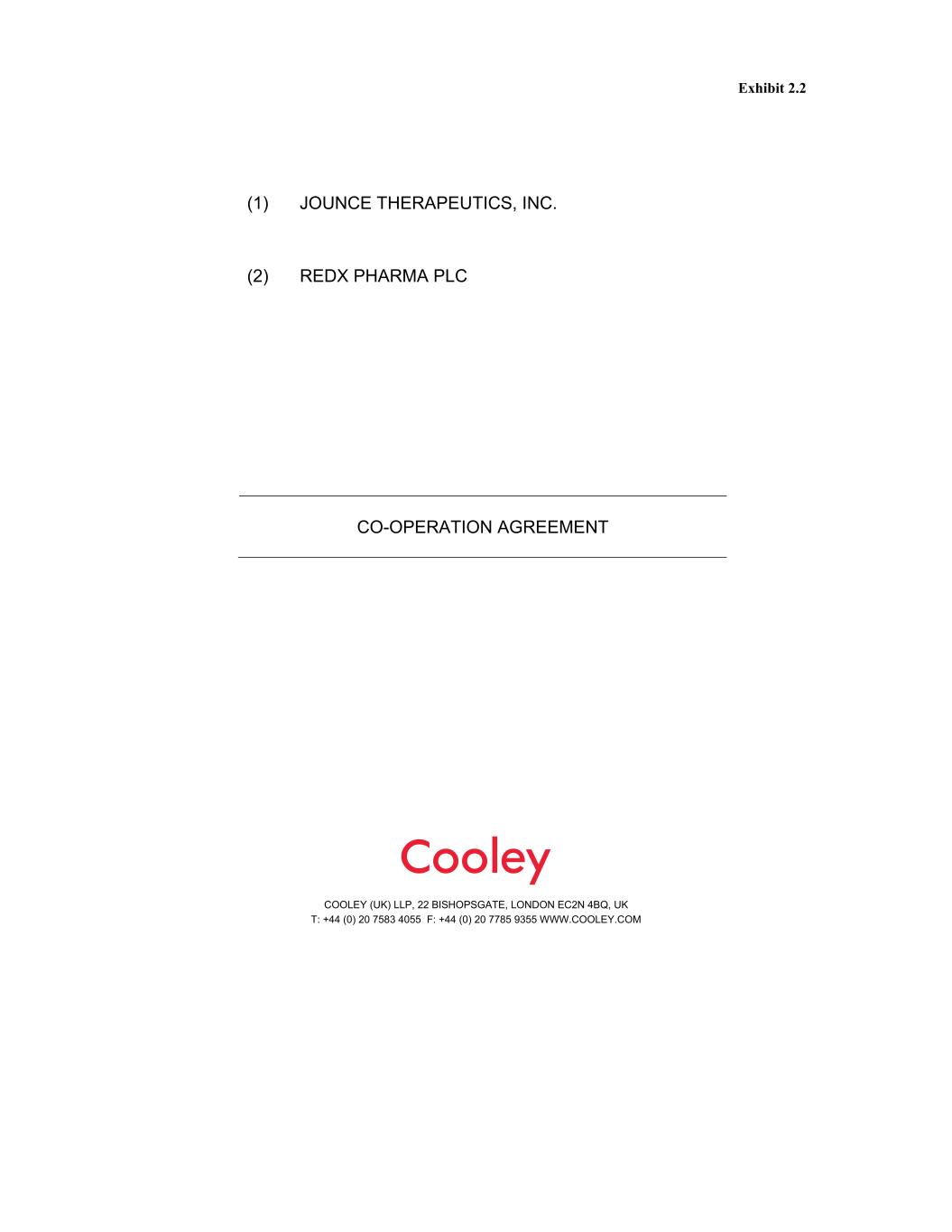 regarding future events such as: the expected structure, anticipated synergies, terms, timing and closing of the proposed transaction; areas of focus of the new company and development of pipeline assets; the further clinical development of RXC007 and the anticipated timing of data with respect to RXC007 and other clinical programs; the composition of the board and management of the combined entity; any potential CVR payments from potential proceeds generated as a result of transactions on the Jounce clinical programs; expected cash and cash runway amounts; the ability of the cash runway to fund the combined entity through multiple inflection points; and the ability of the proposed transaction to create shareholder value. All of such statements are subject to certain risks and uncertainties, many of which are difficult to predict and generally beyond Jounce’s control, that could cause actual results to differ materially from those expressed in, or implied or projected by, the forward-looking information and statements. Such risks and uncertainties include, but are not limited to: the risk that the transaction described above is not consummated or that the benefits of the transaction are not realized; the risks inherent in the early stages of drug development and in conducting clinical trials; the outcome of the shareholder votes of Redx and of Jounce, the High Court and other closing conditions; the risk that the CVR will not result in any payments to Jounce shareholders, and factors in addition to the foregoing that may impact Jounce’s expectations that may cause Jounce’s actual results and outcomes to materially differ; and those risks and uncertainties identified in the “Risk Factors” section of Jounce's Annual Report on Form 10-K for the year ended December 31, 2021, filed with the Securities and Exchange Commission (the “SEC”) on March 2, 2022, and its other subsequent filings with the SEC. Readers are cautioned not to place undue reliance on these forward-looking statements. All forward-looking statements contained in this press release speak only as of the date on which they were made. Except to the extent required by law, Jounce undertakes no obligation to update such statements to reflect events that occur or circumstances that exist after the date on which they were made.