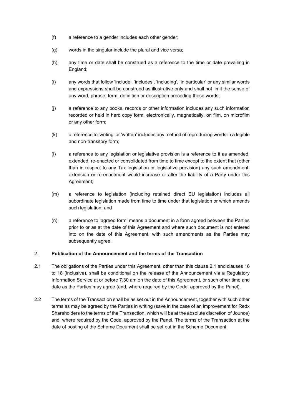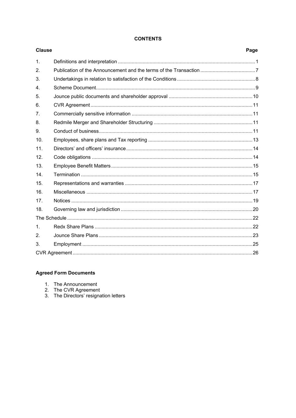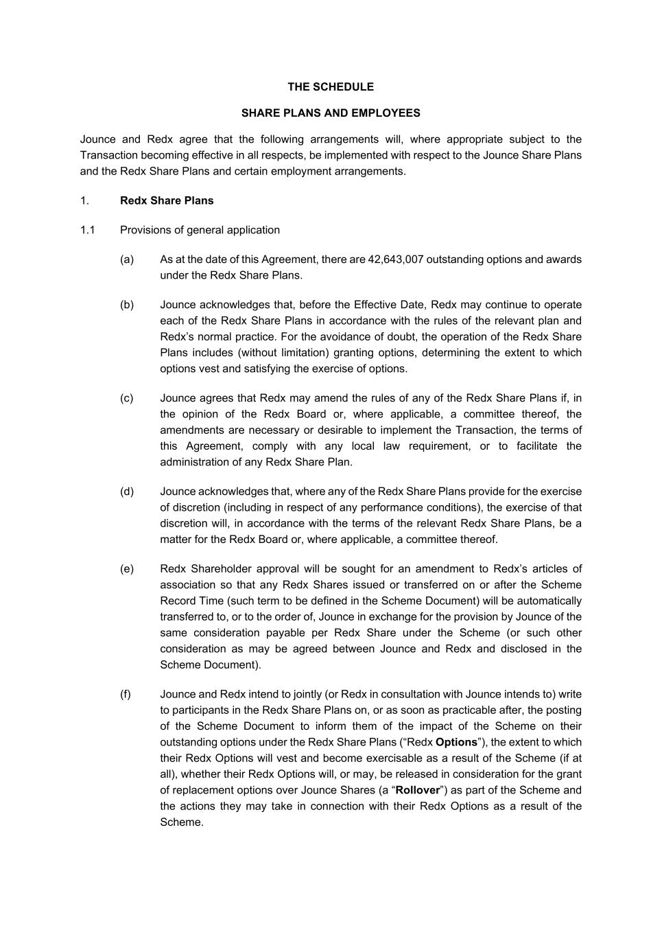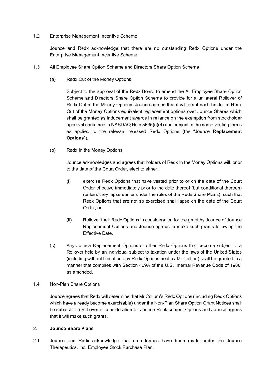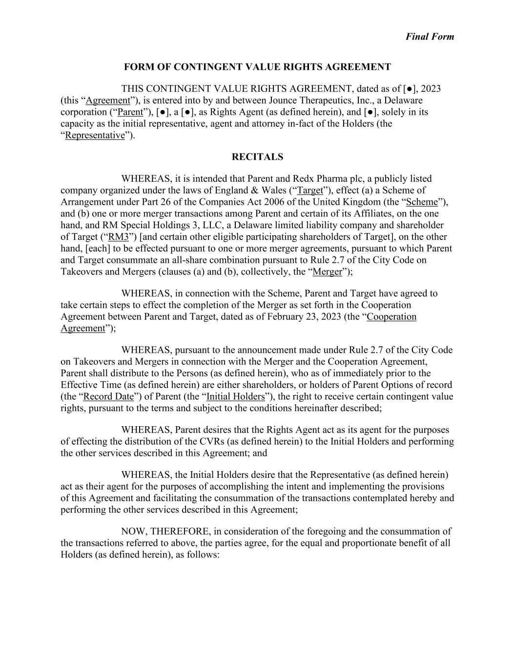 The Business Combination is expected to be implemented by way of a Scheme of Arrangement (“Scheme”) of Redx under Part 26 of the UK Companies Act, immediately preceded by a merger transaction between RM Special Holdings 3, LLC, an entity controlled by Redmile, and Jounce and its affiliates (the “Redmile Merger”), which together will result in Jounce owning the entire issued and to be issued ordinary share capital of Redx. Further details of the Redmile Merger and the ability for eligible Redx Shareholders to request that their Redx Shares be transferred to Jounce via a similar merger structure are set out in the Rule 2.7 announcement.