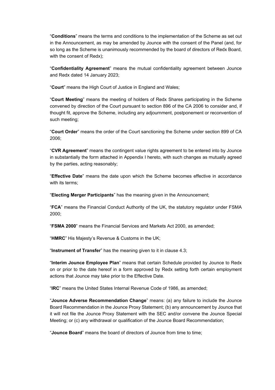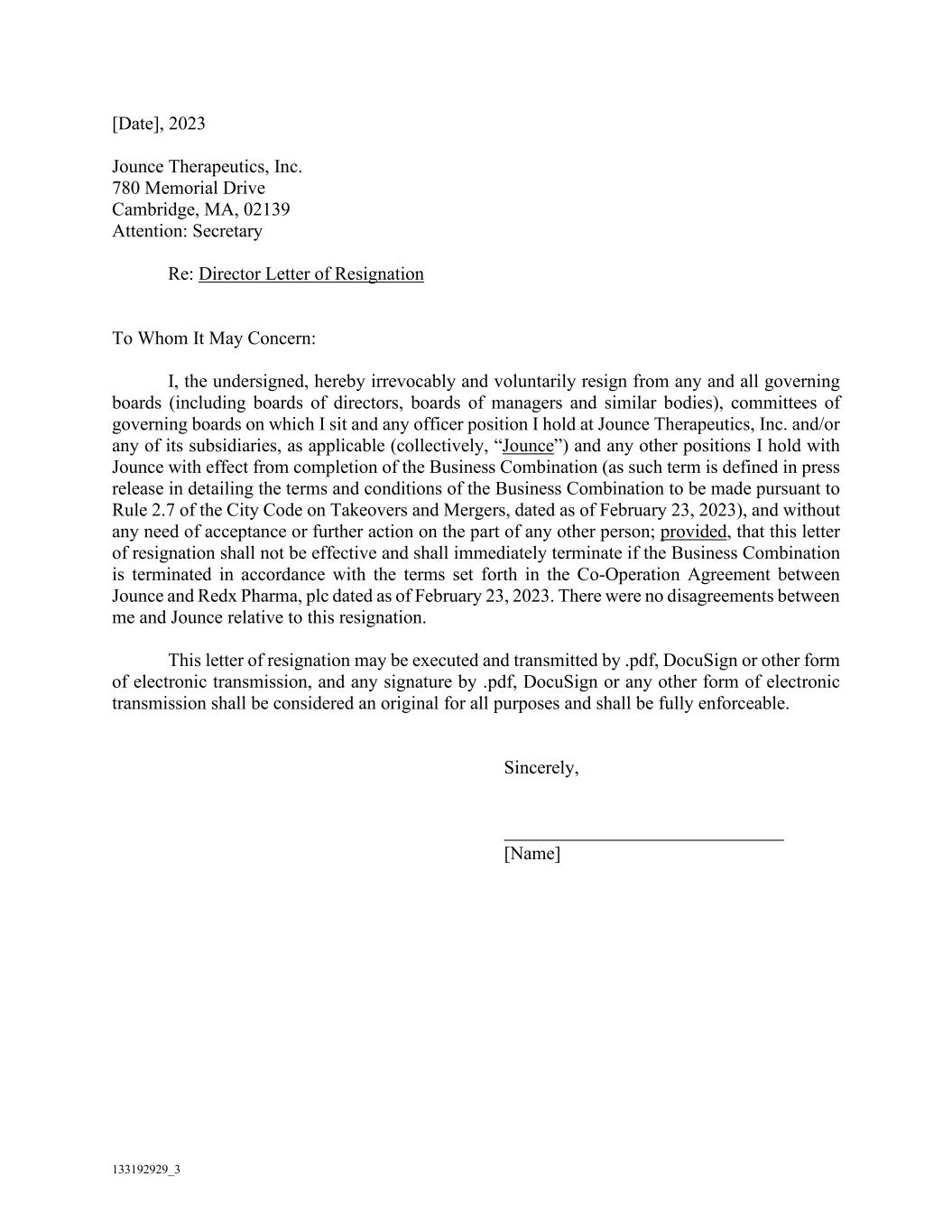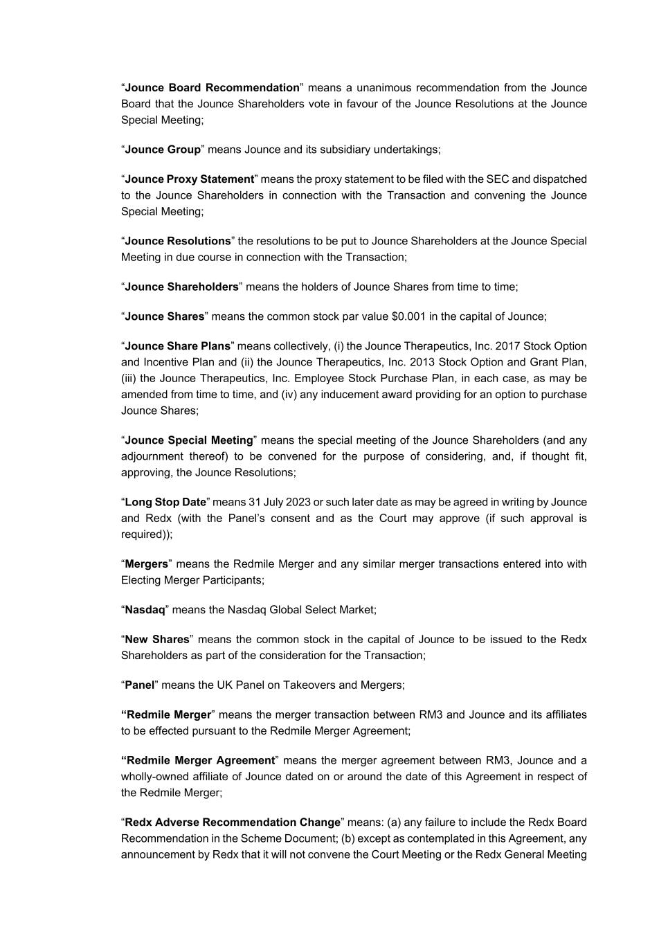 The Boards of both Redx and Jounce have unanimously recommended that shareholders vote in favor of the Business Combination. In connection with the Business Combination, Jounce has received irrevocable undertakings from Redx Shareholders who together own 76.6% of Redx’s share capital as of 22 February 2023 (excluding the Redx shares held by RM3) and RM3 has entered into the Redmile Merger Agreement conditional on the Court sanctioning the Scheme and will receive the same Exchange Ratio. Both Redmile and Sofinnova have agreed to convert all the Redx Convertible Loan Notes held by them respectively as part of the transaction. Redx has also received voting and support agreements in respect of Jounce shares, representing, in aggregate, approximately 21.3% of the issued and outstanding share capital of Jounce. Full details of the undertakings and voting and support agreements are contained in the Rule 2.7 announcement.