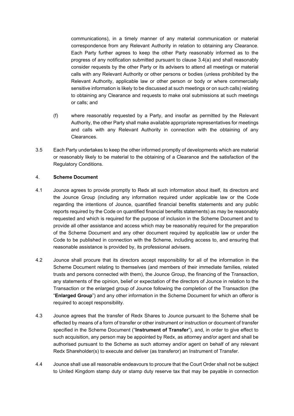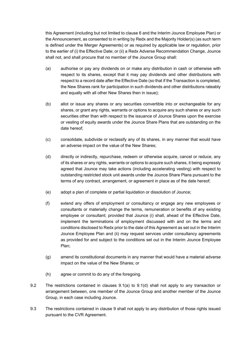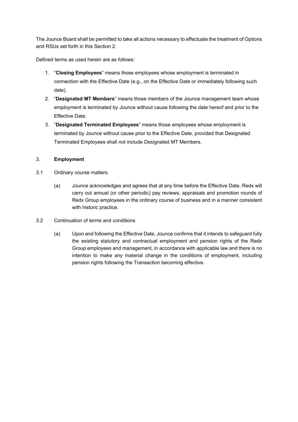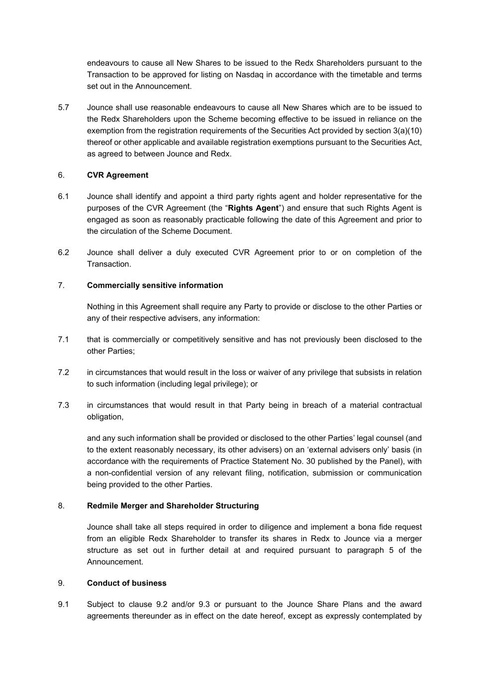 The Boards of both Redx and Jounce have unanimously recommended that shareholders vote in favor of the Business Combination. In connection with the Business Combination, Jounce has received irrevocable undertakings from Redx Shareholders who together own 76.6% of Redx’s share capital as of 22 February 2023 (excluding the Redx shares held by RM3) and RM3 has entered into the Redmile Merger Agreement conditional on the Court sanctioning the Scheme and will receive the same Exchange Ratio. Both Redmile and Sofinnova have agreed to convert all the Redx Convertible Loan Notes held by them respectively as part of the transaction. Redx has also received voting and support agreements in respect of Jounce shares, representing, in aggregate, approximately 21.3% of the issued and outstanding share capital of Jounce. Full details of the undertakings and voting and support agreements are contained in the Rule 2.7 announcement.