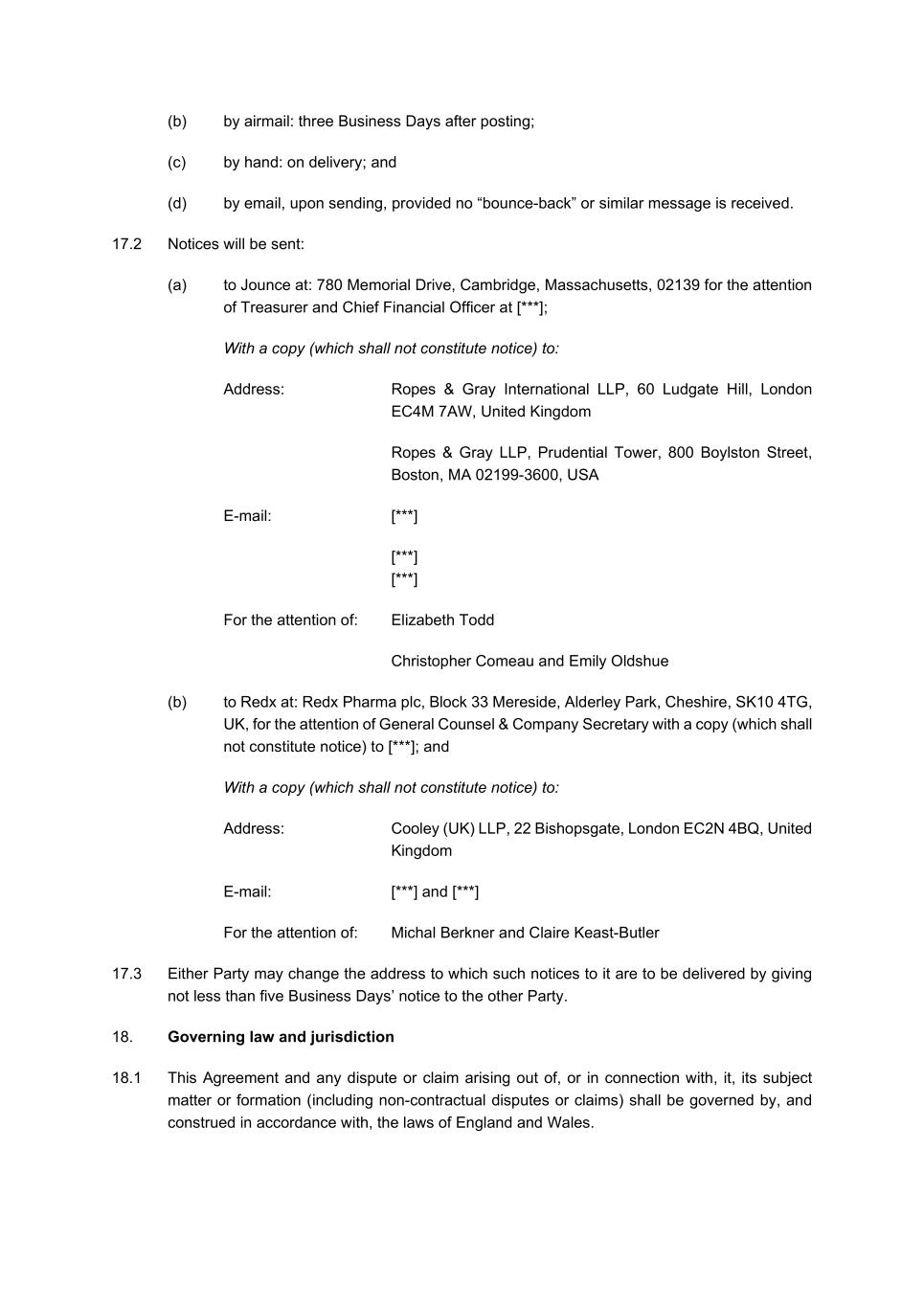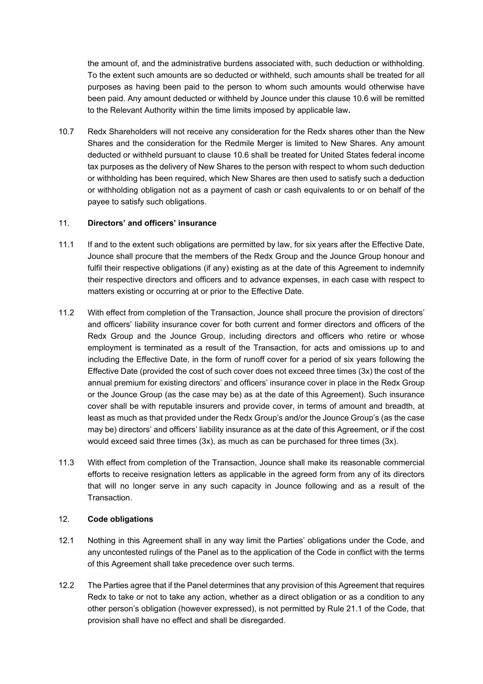 Jounce and Redx will host a live conference call and webcast today at 08:00 ET/13:00 GMT. To access the conference call, please register here [https://webcast.openbriefing.com/redx-jounce/] and please be advised to do so at least 10 minutes prior to joining the call. The live webcast can be accessed under “Events & Presentations” in the Investors and Media section of Jounce’s website at www.jouncetx.com and on the investor section of Redx’s website at www.redxpharma.com/investor-centre/presentations-analyst-reports-documents-and-videos/. The webcast will be archived and made available for replay on Jounce and Redx's websites approximately two hours after the call and will be available throughout the offer period thereafter.