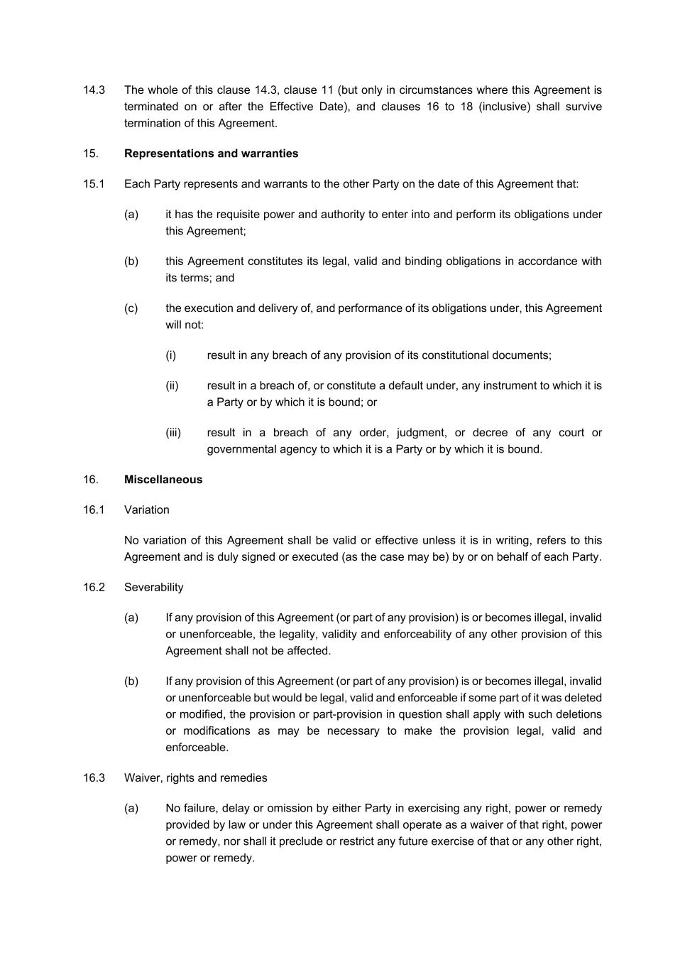 5.17No Agreement Until Executed. This Agreement shall not be effective unless and until (i) the Cooperation Agreement is executed by all parties thereto and (ii) this Agreement is executed by all parties hereto.