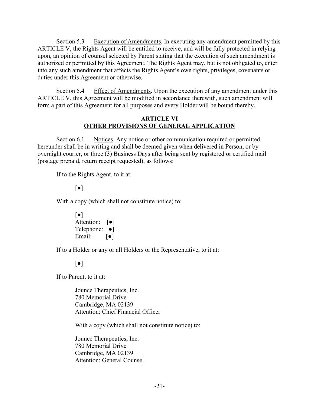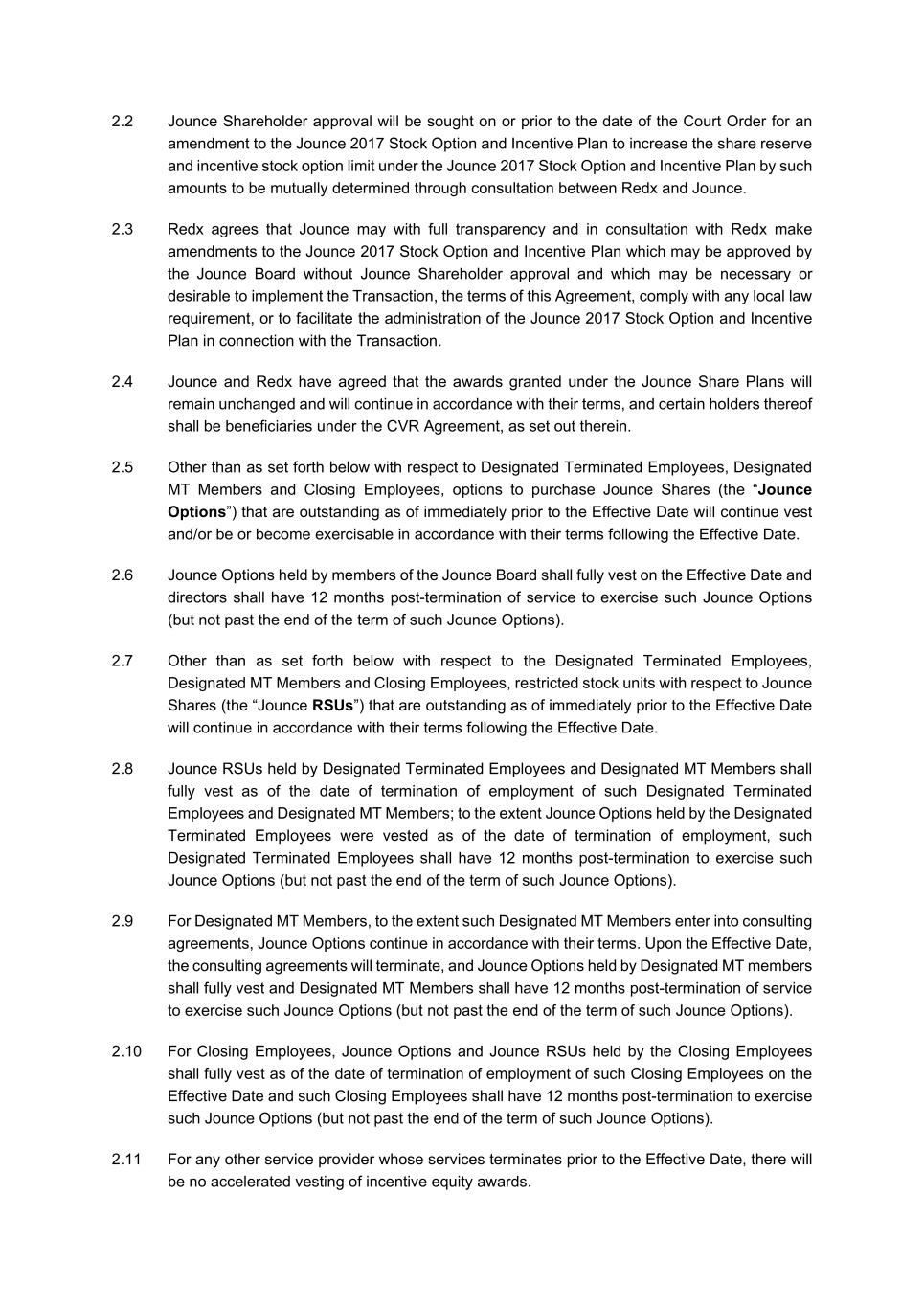 Under the terms of the Business Combination, Redx Shareholders shall be entitled to receive 0.2105 Jounce Shares in exchange for each Redx Share (the “Exchange Ratio”). Jounce intends to conduct a reverse stock split of Jounce Shares in conjunction with the Business Combination, with a ratio of one new share for every five outstanding shares of Jounce. A reverse split is a share exchange transaction, without any impact on the amount of the share capital: only the number of outstanding shares is modified. If the Reverse Stock Split is approved by Jounce Shareholders, the Exchange Ratio will be adjusted to 0.0421 Jounce Shares in exchange for each Redx Share.