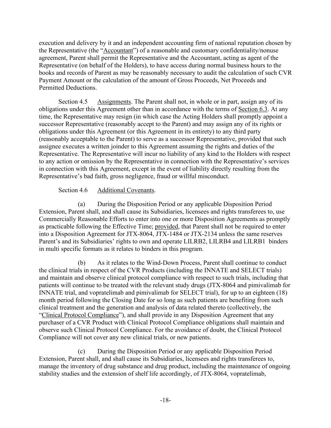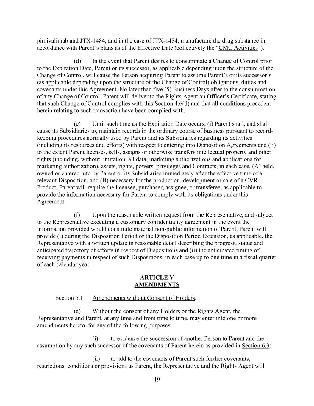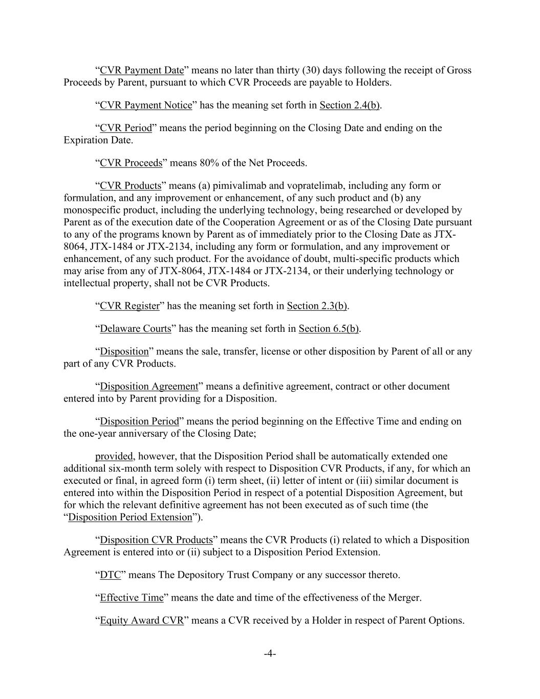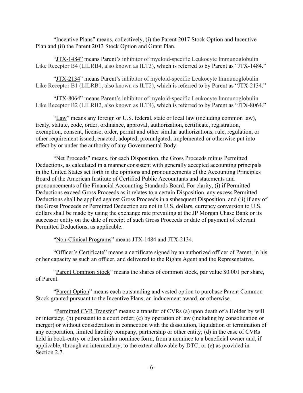 At or prior to the closing of the Business Combination (the “Effective Time”), the Company expects to enter into a Contingent Value Rights Agreement (the “CVR Agreement”) with a rights agent (“Rights Agent”) and a representative, agent and attorney in-fact (the “Representative”) of the holders of contingent value rights (each, a “CVR”). The Company expects to distribute the CVRs to its shareholders and vested optionholders of record immediately prior to the Effective Time in the form of a dividend in respect of each outstanding share of Company Common Stock. Each CVR will represent a contractual right to receive contingent cash payments upon the receipt by the Company of 80% net proceeds payable, if any, from any license or disposition (each, a “Disposition”) of any or all rights to JTX-8064, pimivalimab, vopratelimab, and two pre-clinical programs, JTX-1484 and JTX-2134 (targeting LILRB1) (collectively, the “CVR Products”) that occurs within one year of the closing time, subject to a six-month extension in certain circumstances (the “Disposition Period”). In the event that no Disposition of CVR Products occurs within the Disposition Period, holders of the CVRs will not receive any payment pursuant to the CVR Agreement.