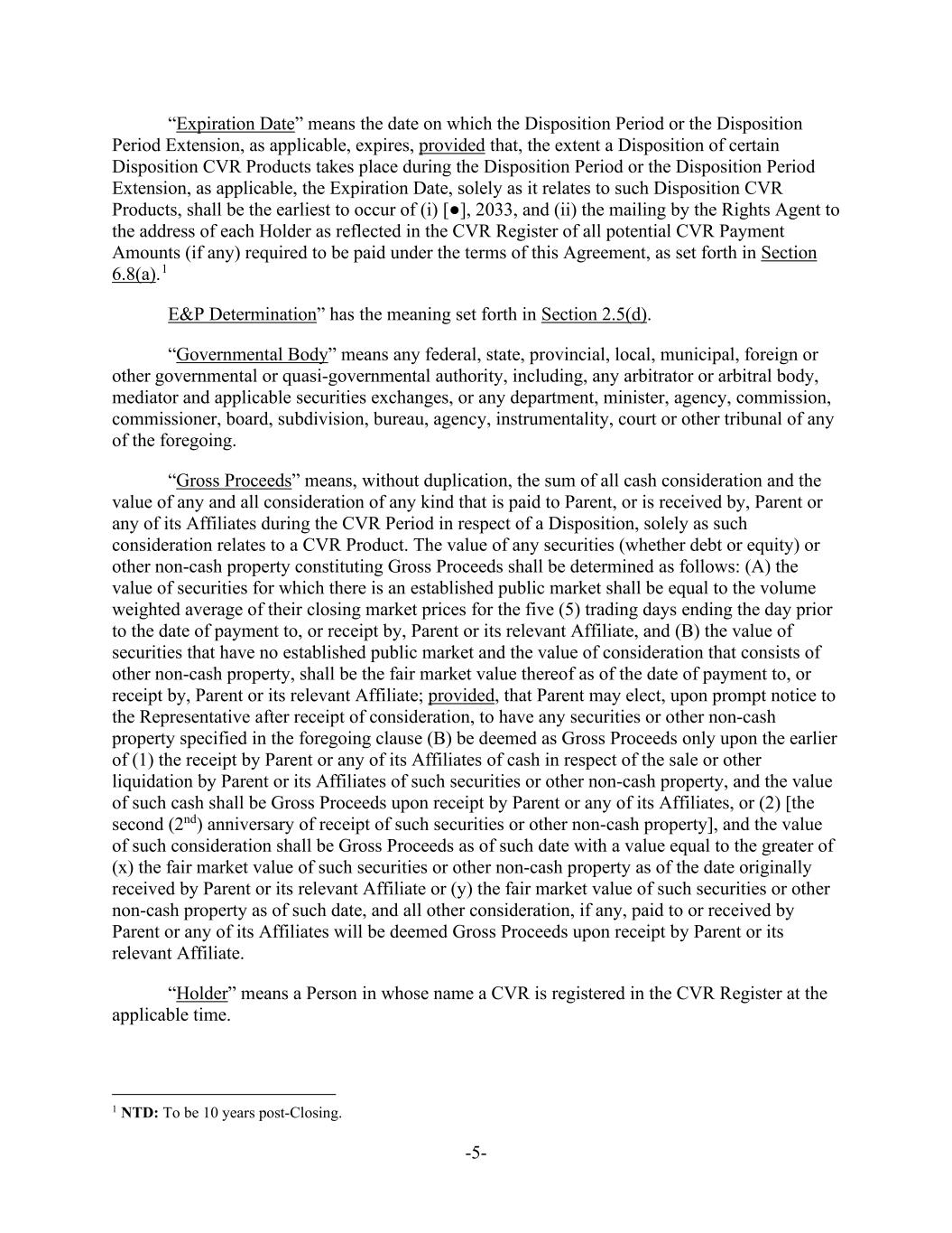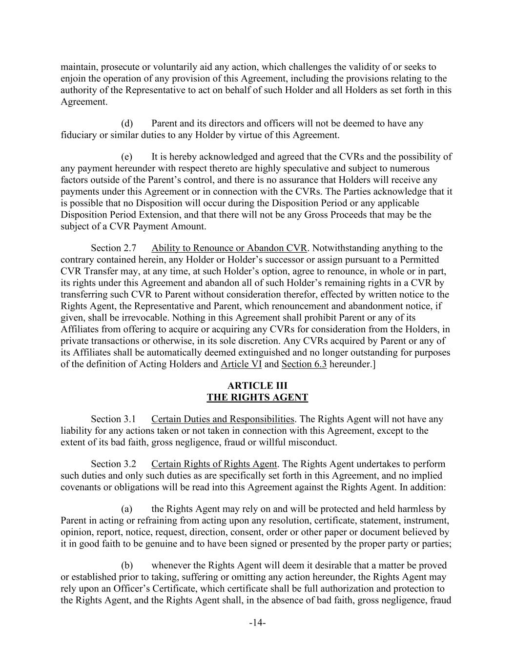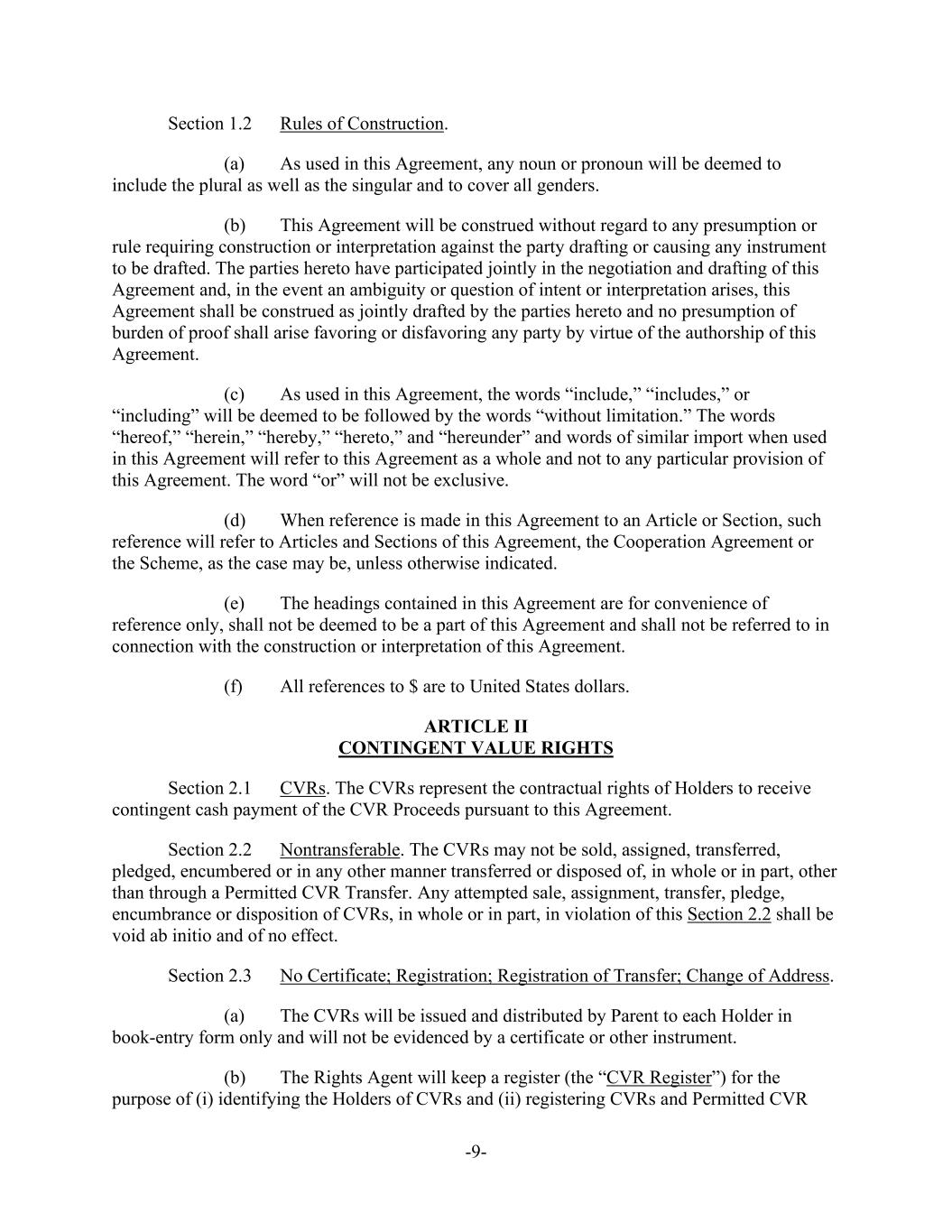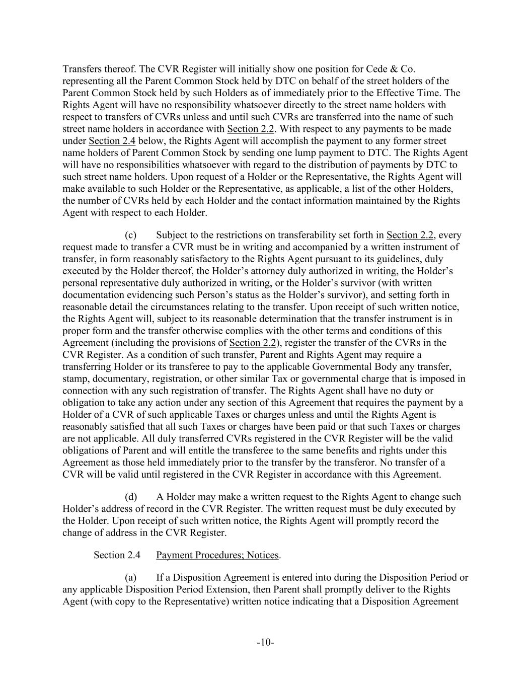 The right to the contingent payments contemplated by the CVR Agreement is a contractual right only and will not be transferable, except in the limited circumstances specified in the CVR Agreement. The CVRs will not be evidenced by a certificate or any other instrument and will not be registered with the SEC. The CVRs will not have any voting or dividend rights and will not represent any equity or ownership interest in the Company or any of its affiliates. No interest will accrue on any amounts payable in respect of the CVRs.
