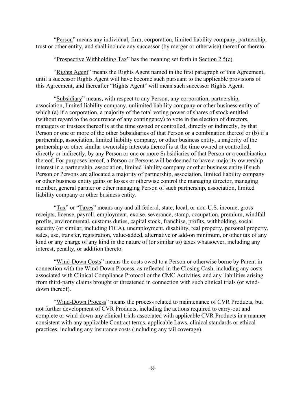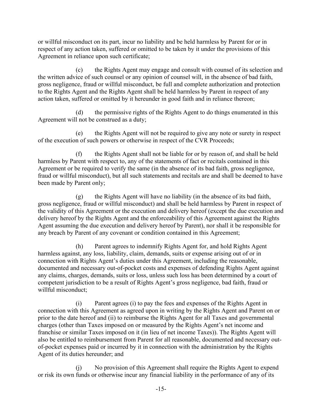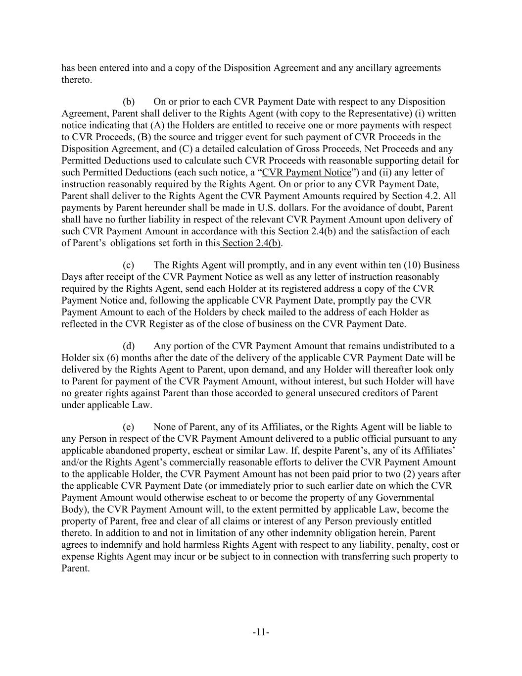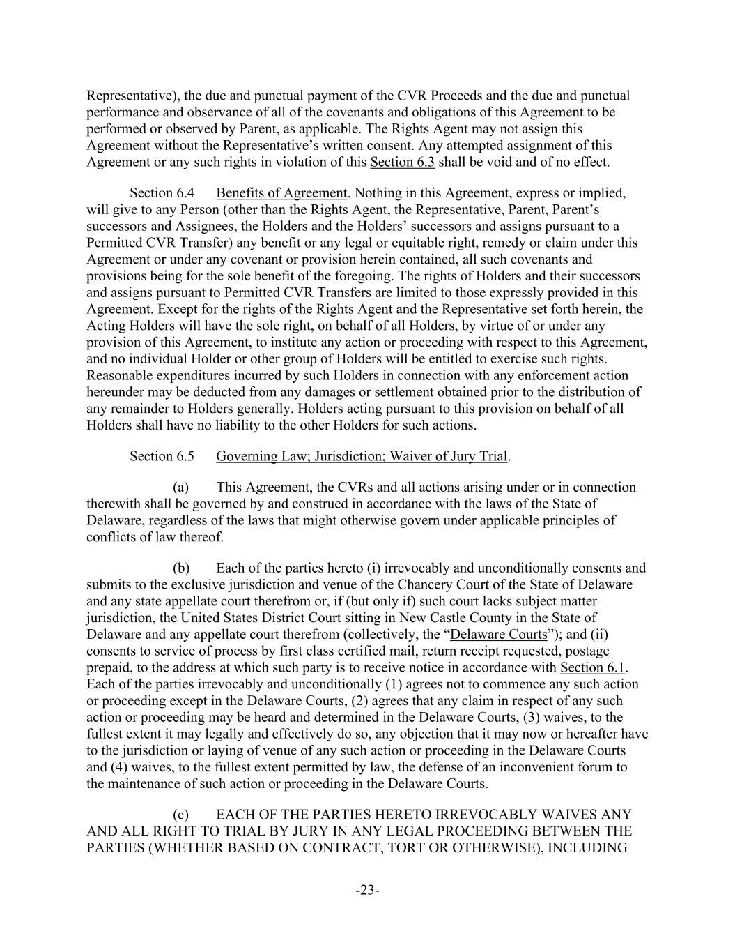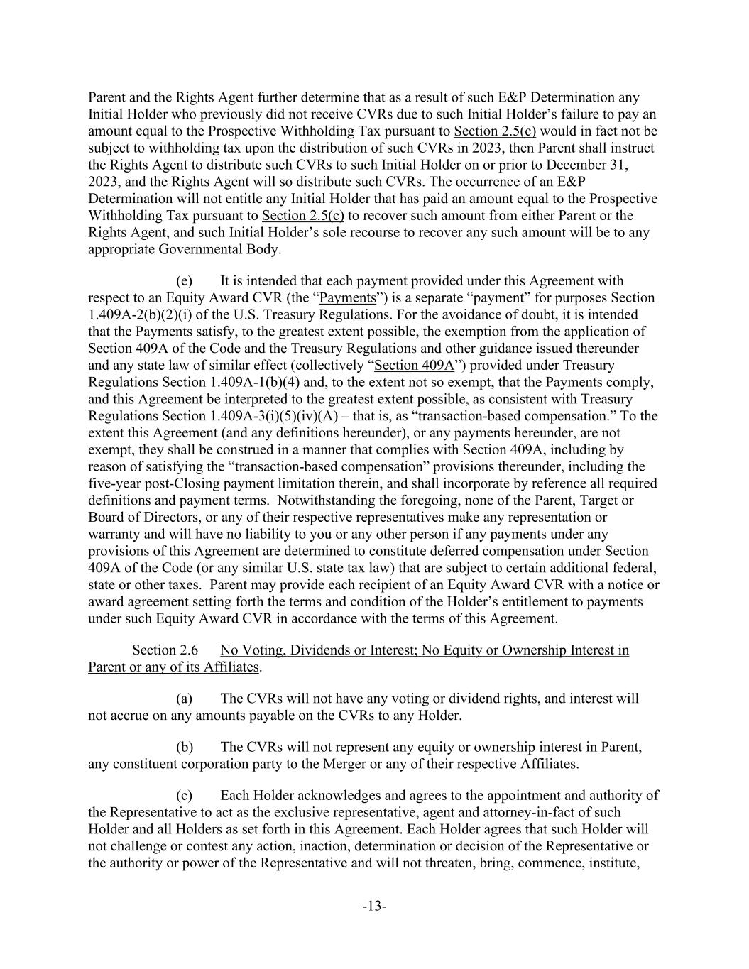 The right to the contingent payments contemplated by the CVR Agreement is a contractual right only and will not be transferable, except in the limited circumstances specified in the CVR Agreement. The CVRs will not be evidenced by a certificate or any other instrument and will not be registered with the SEC. The CVRs will not have any voting or dividend rights and will not represent any equity or ownership interest in the Company or any of its affiliates. No interest will accrue on any amounts payable in respect of the CVRs.