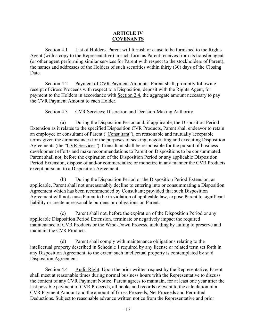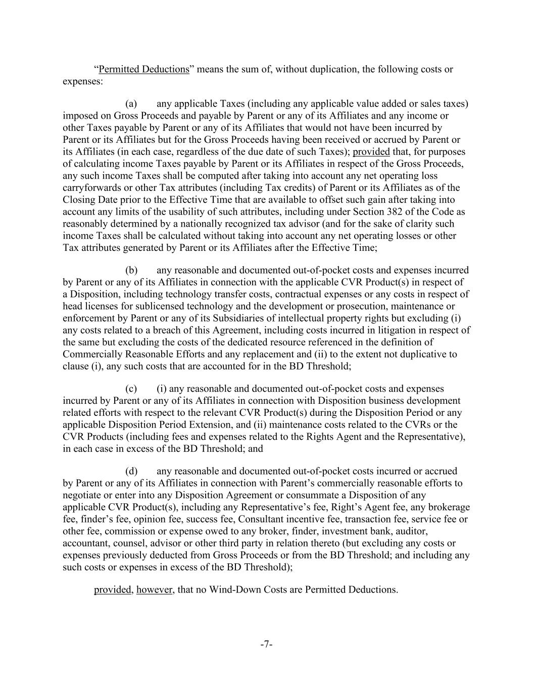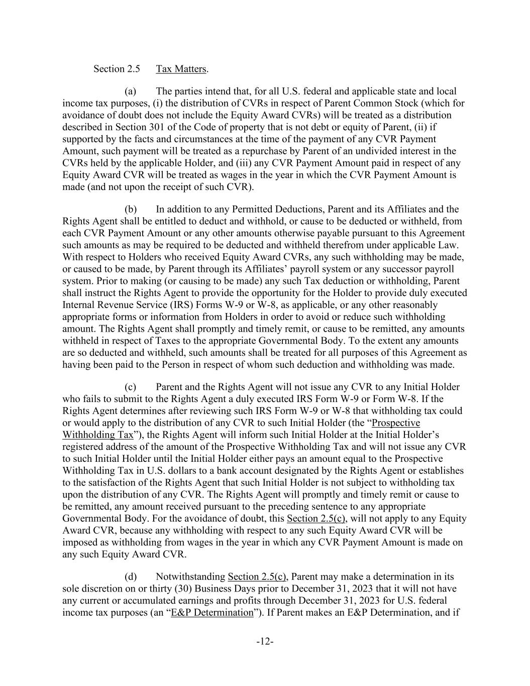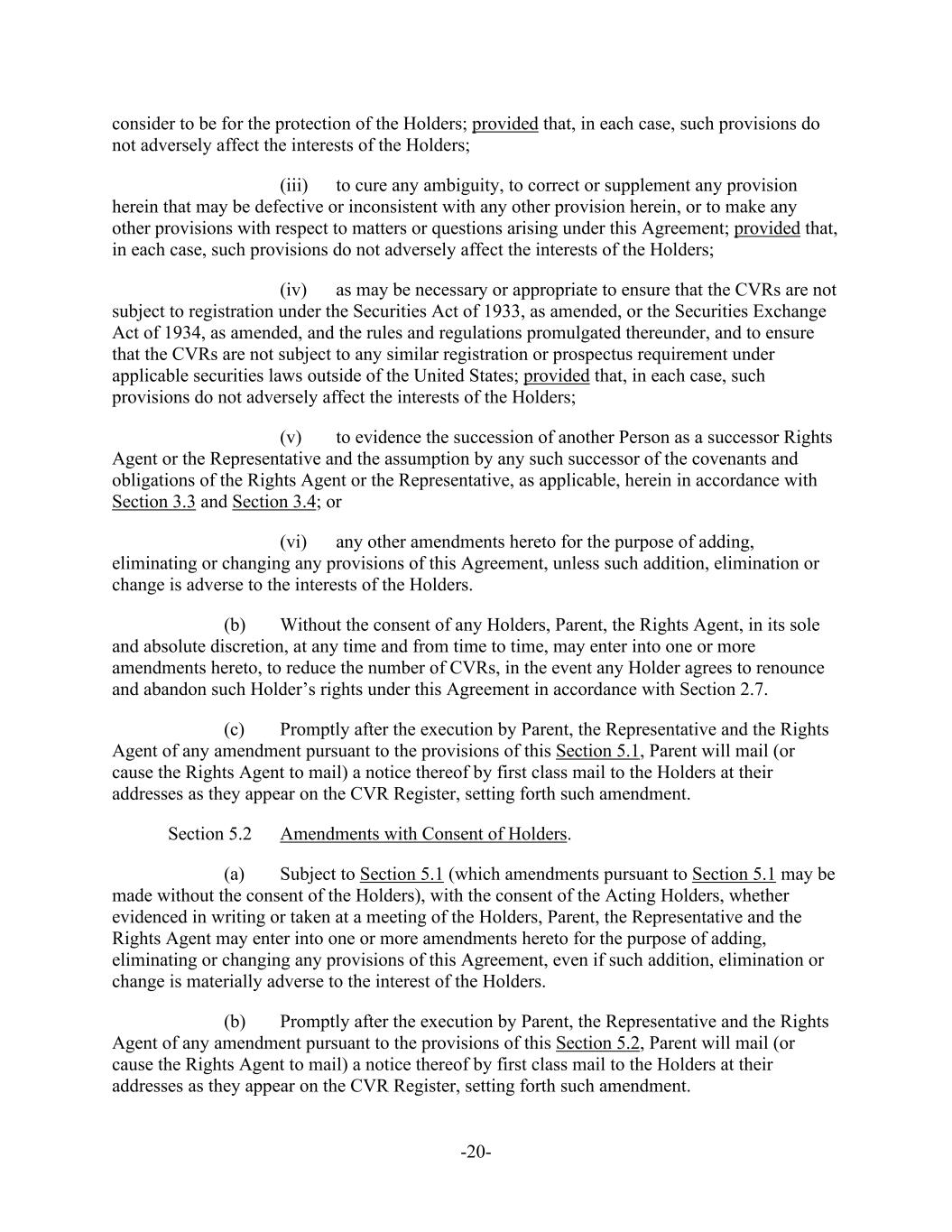 The right to the contingent payments contemplated by the CVR Agreement is a contractual right only and will not be transferable, except in the limited circumstances specified in the CVR Agreement. The CVRs will not be evidenced by a certificate or any other instrument and will not be registered with the SEC. The CVRs will not have any voting or dividend rights and will not represent any equity or ownership interest in the Company or any of its affiliates. No interest will accrue on any amounts payable in respect of the CVRs.
