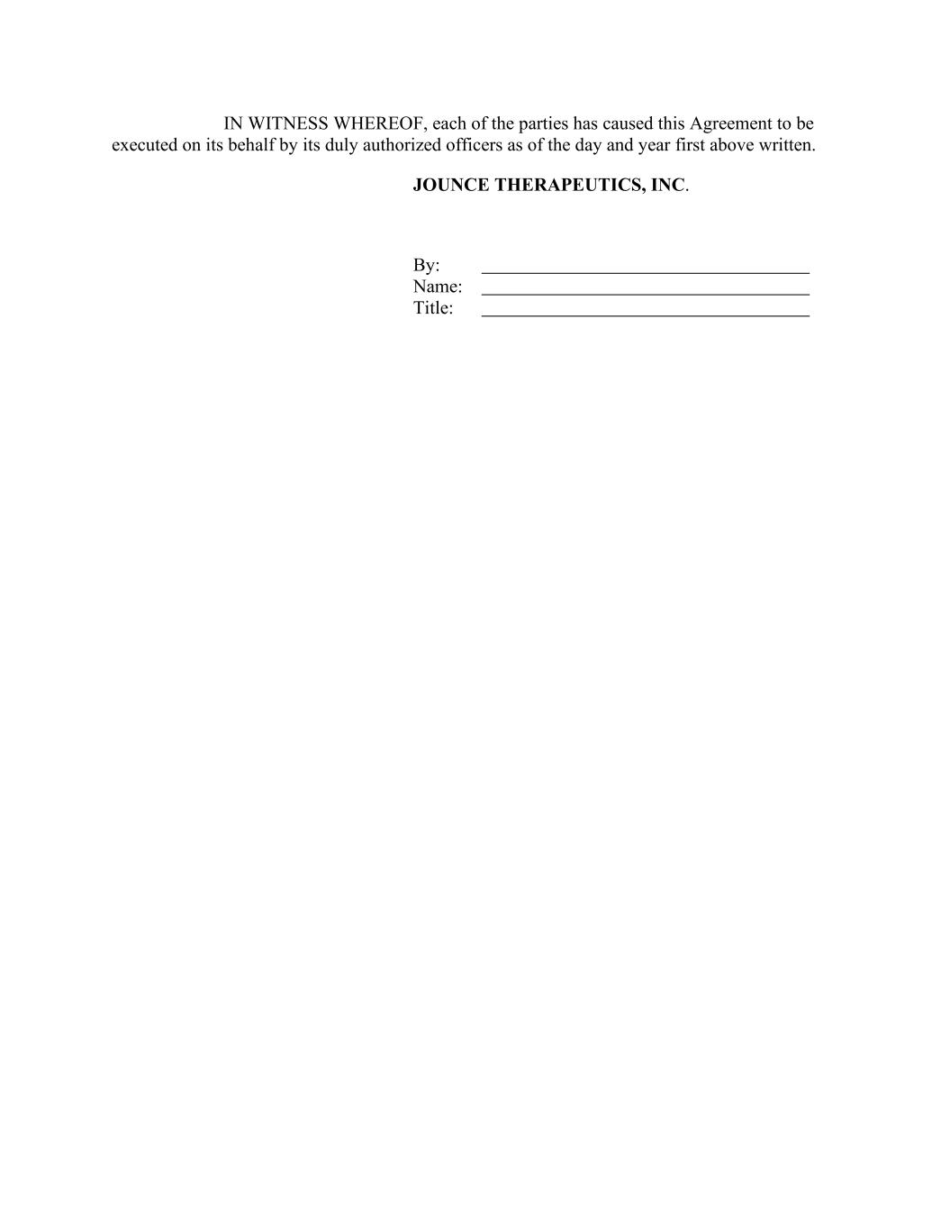 Various statements in this release concerning Jounce’s future expectations, plans and prospects, including without limitation, Jounce’s expectations regarding its ability to preserve its financial resources, the incurrence of a non-recurring charge and the opportunities for potential advancement of its programs by third parties may constitute forward-looking statements for the purposes of the safe harbor provisions under The Private Securities Litigation Reform Act of 1995 and other federal securities laws and are subject to substantial risks, uncertainties and assumptions. You should not place reliance on these forward-looking statements, which often include words such as, “believe,” “expect,” “goal,” “intend,” or similar terms, variations of such terms or the negative of those terms. Although Jounce believes that the expectations reflected in the forward-looking statements are reasonable, Jounce cannot guarantee such outcomes. Actual results may differ materially from those indicated by these forward-looking statements as a result of various important factors, including, without limitation, Jounce’s ability to successfully implement its workforce reduction plan and reduce expenses; Jounce’s ability to retain qualified personnel; unexpected demands on Jounce’s cash resources; Jounce’s ability to obtain, maintain and protect its intellectual property; and those risks more fully discussed in the section entitled “Risk Factors” in Jounce’s most recent Annual Report on Form 10-K filed with the Securities and Exchange Commission as well as discussions of potential risks, uncertainties, and other important factors in Jounce’s subsequent filings with the Securities and Exchange Commission. All such statements speak only as of the date made, and Jounce undertakes no obligation to update or revise publicly any forward-looking statements, whether as a result of new information, future events or otherwise.