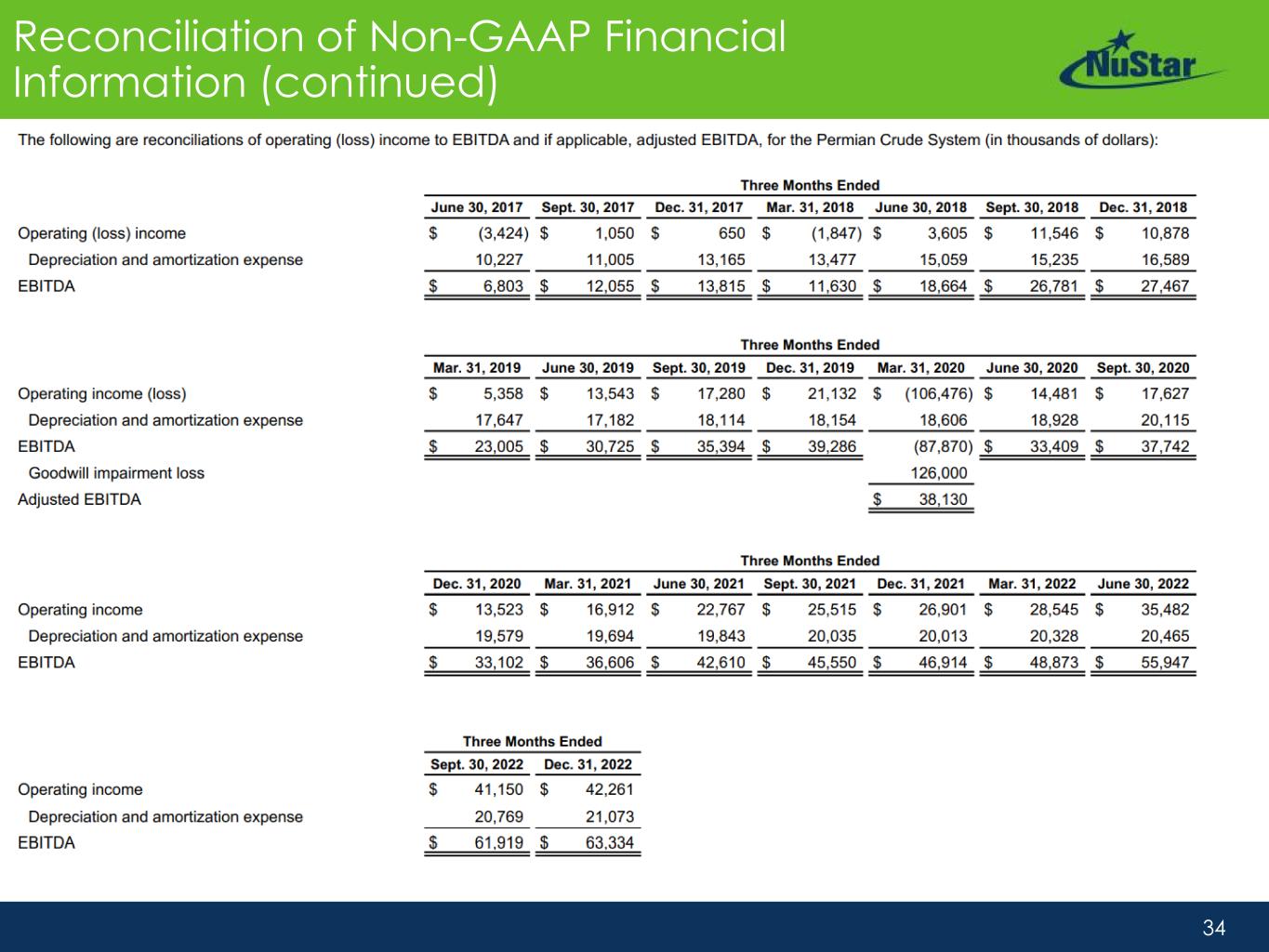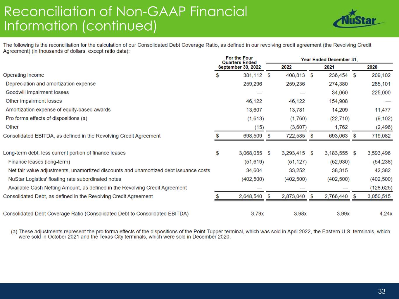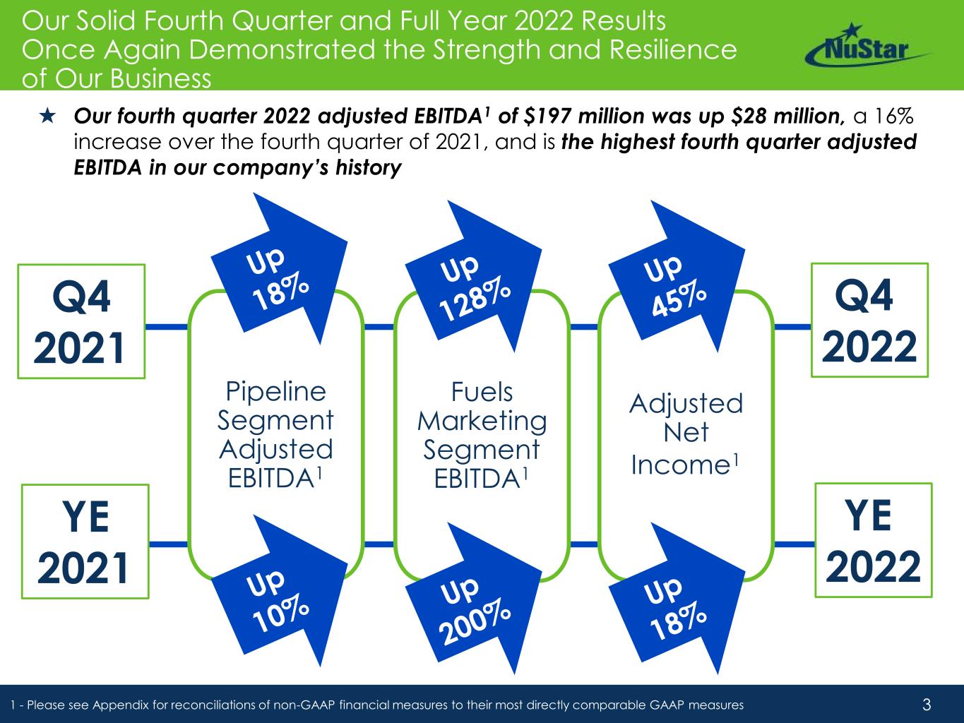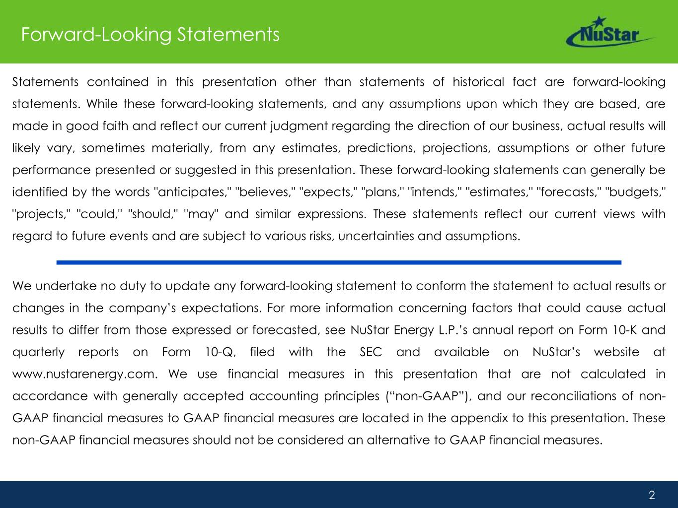 2 Statements contained in this presentation other than statements of historical fact are forward-looking statements. While these forward-looking statements, and any assumptions upon which they are based, are made in good faith and reflect our current judgment regarding the direction of our business, actual results will likely vary, sometimes materially, from any estimates, predictions, projections, assumptions or other future performance presented or suggested in this presentation. These forward-looking statements can generally be identified by the words "anticipates," "believes," "expects," "plans," "intends," "estimates," "forecasts," "budgets," "projects," "could," "should," "may" and similar expressions. These statements reflect our current views with regard to future events and are subject to various risks, uncertainties and assumptions. We undertake no duty to update any forward-looking statement to conform the statement to actual results or changes in the company’s expectations. For more information concerning factors that could cause actual results to differ from those expressed or forecasted, see NuStar Energy L.P.’s annual report on Form 10-K and quarterly reports on Form 10-Q, filed with the SEC and available on NuStar’s website at www.nustarenergy.com. We use financial measures in this presentation that are not calculated in accordance with generally accepted accounting principles (“non-GAAP”), and our reconciliations of non- GAAP financial measures to GAAP financial measures are located in the appendix to this presentation. These non-GAAP financial measures should not be considered an alternative to GAAP financial measures. Forward-Looking Statements