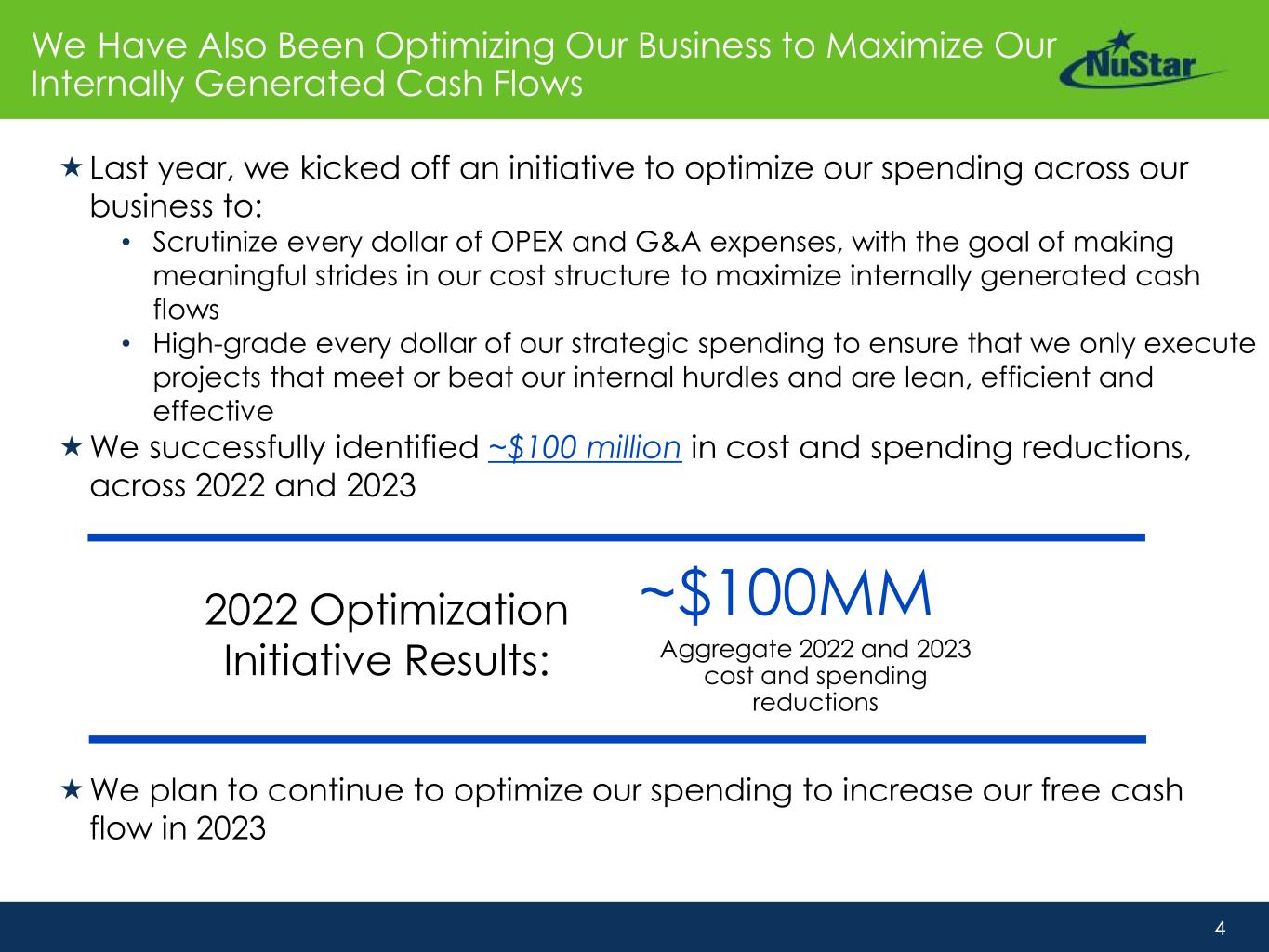 3 YE 2022 YE 2021 Our Solid Fourth Quarter and Full Year 2022 Results Once Again Demonstrated the Strength and Resilience of Our Business 1 - Please see Appendix for reconciliations of non-GAAP financial measures to their most directly comparable GAAP measures ★ Our fourth quarter 2022 adjusted EBITDA1 of $197 million was up $28 million, a 16% increase over the fourth quarter of 2021, and is the highest fourth quarter adjusted EBITDA in our company’s history Q4 2022 Adjusted Net Income1 Fuels Marketing Segment EBITDA1 Q4 2021 Pipeline Segment Adjusted EBITDA1