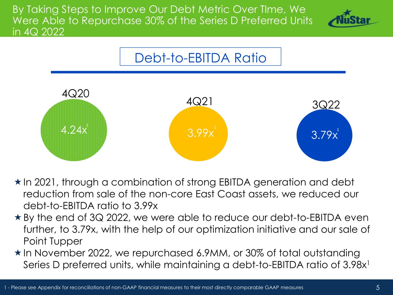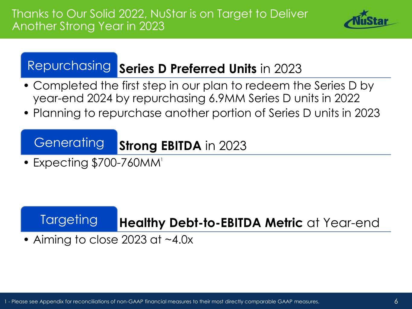 5 By Taking Steps to Improve Our Debt Metric Over TIme, We Were Able to Repurchase 30% of the Series D Preferred Units in 4Q 2022 1 - Please see Appendix for reconciliations of non-GAAP financial measures to their most directly comparable GAAP measures 1 1 1 1 1 Debt-to-EBITDA Ratio 3.99x4.24x 1 1 4Q21 3.79x 3Q22 4Q20 1 1 In 2021, through a combination of strong EBITDA generation and debt reduction from sale of the non-core East Coast assets, we reduced our debt-to-EBITDA ratio to 3.99x By the end of 3Q 2022, we were able to reduce our debt-to-EBITDA even further, to 3.79x, with the help of our optimization initiative and our sale of Point Tupper In November 2022, we repurchased 6.9MM, or 30% of total outstanding Series D preferred units, while maintaining a debt-to-EBITDA ratio of 3.98x1