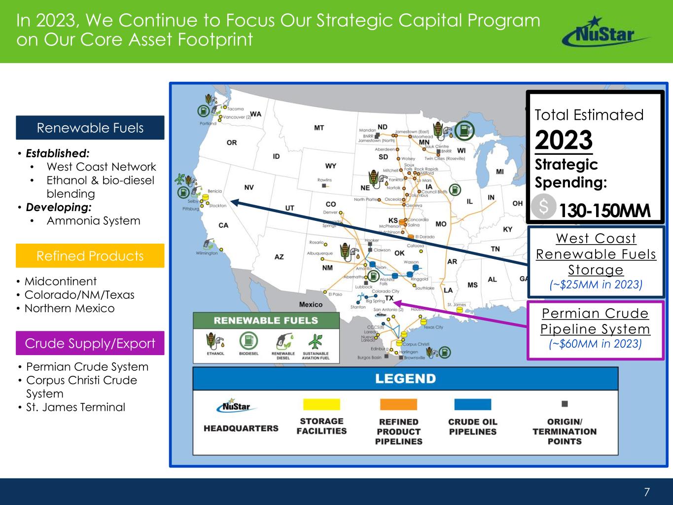6 Thanks to Our Solid 2022, NuStar is on Target to Deliver Another Strong Year in 2023 1 - Please see Appendix for reconciliations of non-GAAP financial measures to their most directly comparable GAAP measures. Series D Preferred Units in 2023Repurchasing • Completed the first step in our plan to redeem the Series D by year-end 2024 by repurchasing 6.9MM Series D units in 2022 • Planning to repurchase another portion of Series D units in 2023 Strong EBITDA in 2023Generating • Expecting $700-760MM Healthy Debt-to-EBITDA Metric at Year-endTargeting • Aiming to close 2023 at ~4.0x 1